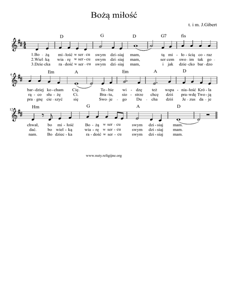 Bożą miłość t. i m. J.Gibert G D 1.Bo żą 2.Wiel ką 3.Dzie cka 6 mi łość w ser cu swym dzi siaj wia rę w ser cu swym dzi siaj ra dość w ser cu swym dzi siaj Em bar dziej ko cham rą co słu żę pra gnę cie szyć 12 Cię. Ci. się G Hm chwał, dać. nam. To bie Bra tu, Swo je bo mi łość bo wiel ką Bo dziec ka Bo żą w ser cu wia rę w ser cu ra dość w ser cu www.nuty.religijne.org wi sio go mam, mam, mam, Em A dzę strze Du tą mi ło ścią co raz ser cem swo im tak go i jak dzie cko bar dzo D A też chcę cha A swym swym swym fis G7 D 4 wspa dziś dziś nia łość Kró la pra wdę Two ją Je zus da je D dzi siaj dzi siaj dzi siaj mam. mam. mam.