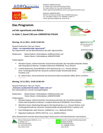 Redaktion AGROmechanika ul. Kaliska 1/8, PL 02-316 Warszawa/ Polen Tel. +48 22 659 21 97, Fax +48 22 822 66 49 E-Mail: [email protected], www.agromechanika.net.pl Redaktion AGRARTECHNIK Werner-von-Siemens-Straße 55a, D-970076 Würzburg Tel. +49 (0)931-27997-0, Fax +49(0)937-27997-77 E-Mail: [email protected], www.dlv.de Das Programm auf der agrarheute.com-Bühne in Halle 7, Stand C30 zum LÄNDERTAG POLEN Montag, 14.11.2011, 14:00-15:00 Uhr Deutsch-Polnischer Talk zum Thema „Polen – ein expandierender Agrarmarkt“ Der Exportmarkt und die Besonderheiten des poln. Agrarmarktes Moderation: Schirmherrschaft Michał Zabost, Chefredakteur AGROmechnika und Dieter Dänzer, Chefredakteur AGRARTECHNIK Podiumsgäste: Wiesław Kujawa, stellvertretender Vorstandsvorsitzender des Herstellerverbandes Polska Izba Gospodarcza Maszyn i Urządzeń Rolniczych (PIGMiUR), Toruń (Polen) Ludwik Apolinarski, Geschäftsführer DLG AgroFood Sp.z.o.o., Poznań (Polen), einer Tochtergesellschaft der Deutsche Landwirtschafts-Gesellschaft (DLG), Frankfurt a.M. Dr. Helmut Born, Generalsekretär des Deutschen Bauernverbandes (DBV), Berlin und Bonn [angefragt] Montag, 14.11.2011, 15:00-16:00 Uhr Deutsch-Polnischer Talk zum Thema „Polnische Landtechnik-Hersteller stellen sich vor“ Das Lieferspektrum und die Leistungsfähigkeit Moderation: Michał Zabost, Chefredakteur AGROmechnika und Dieter Dänzer, Chefredakteur AGRARTECHNIK Podiumsgäste: Wiesław Kujawa, stellvertretender Vorstandsvorsitzender des Herstellerverbandes Polska Izba Gospodarcza Maszyn i Urządzeń Rolniczych (PIGMiUR), Toruń (Polen) Michalina Sowul, Marketing Managerin DLG AgroFood Sp.z.o.o., Poznań (Polen), einer Tochtergesellschaft der Deutsche Landwirtschafts-Gesellschaft (DLG), Frankfurt a.M. Karol Wdziękoński, Sales Director, SaMASZ Sp. z o.o., Białystok (Polen) Bogusław Szydłowski, METAL-FACH Sp. z o.o., Sokółka (Polen) (Eine Dolmetscherin wird die deutschsprachigen Diskussionen und Präsentationen unterstützen). Oficyna Wydawnicza OIKOS Sp. z o.o. ul. Kaliska 1 m. 7 PL 02-316 Warszawa Tel. +48 22 822 03 34 www.oikos.net.pl Deutscher Landwirtschaftsverlag GmbH Postfach 40 05 80 DE-80705 München Tel. +49(0)89-12705-1 www.dlv.de 1 Redakcja AGROmechanika ul. Kaliska 1/8, PL 02-316 Warszawa Tel. +48 22 659 21 97, Fax +48 22 822 66 49 e-mail: [email protected], www.agromechanika.net.pl Redakcja AGRARTECHNIK Werner-von-Siemens-Straße 55a, D-970076 Würzburg Tel. +49 (0)931-27997-0, Fax +49(0)937-27997-77 e-mail: [email protected], www.dlv.de Program DNIA POLSKIEGO scena agrarheute.com Poniedziałek, 14.11.2011, godz. 14:00-15:00 Dyskusja na temat „Polska jako dynamicznie rozwijający się rynek rolniczy“ Moderatorzy: Michał Zabost, Redaktor naczelny AGROmechnika i Dieter Dänzer, Redaktor naczelny AGRARTECHNIK Patronat honorowy Uczestnicy: Wiesław Kujawa, wiceprezes Polskiej Izby Gospodarczej Maszyn i Urządzeń Rolniczych (PIGMiUR) Ludwik Apolinarski, Prezes DLG AgroFood Sp. z o.o. Dr. Helmut Born, Generalny sekretarz Niemieckiego Związku Rolników, Der Deutsche Bauernverband (DBV), Berlin i Bonn (Niemcy) Poniedziałek, 14.11.2011 godz. 15:00-16:00 Prezentacje polskich producentów oraz rynku techniki rolniczej Moderatorzy: Michał Zabost, Redaktor naczelny AGROmechnika i Dieter Dänzer, Redaktor naczelny AGRARTECHNIK Uczestnicy: Wiesław Kujawa, wiceprezes Polskiej Izby Gospodarczej Maszyn i Urządzeń Rolniczych (PIGMiUR), Toruń Michalina Sowul, marketing manager DLG AgroFood Sp. z o.o., Poznań Karol Wdziękoński, Sales Director, SaMASZ Sp. z o.o., Białystok Bogusław Szydłowski, METAL-FACH Sp. z o.o., Sokółka (Niemieckojęzyczne dyskusje i prezentacje wspiera tłumacz). Oficyna Wydawnicza OIKOS Sp. z o.o. ul. Kaliska 1 m. 7 PL 02-316 Warszawa Tel. +48 22 822 03 34 www.oikos.net.pl Deutscher Landwirtschaftsverlag GmbH Postfach 40 05 80 DE-80705 München Tel. +49(0)89-12705-1 www.dlv.de 2