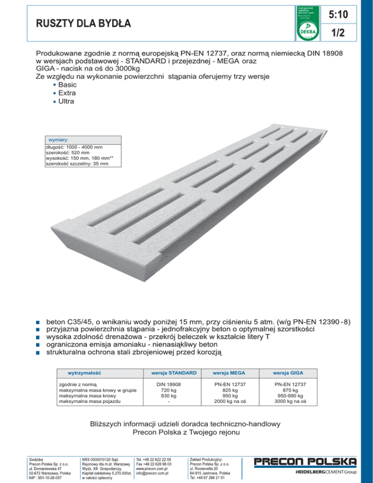 oraz GIGA - nacisk na oś do 3000kg Ze względu na wykonanie powierzchni stąpania oferujemy trzy wersje Basic Extra Ultra długość: 1000 - 4000 mm szerokość: 520 mm wysokość: 150 mm, 180 mm** szerokość szczeliny: 35 mm 35/45, wytrzymałość zgodnie z normą maksymalna masa krowy w grupie maksymalna masa krowy maksymalna masa pojazdu - wersja STANDARD DIN 18908 720 kg 830 kg - wersja MEGA wersja GIGA PN-EN 12737 825 kg 950 kg 2000 kg na oś PN-EN 12737 875 kg 950-990 kg 3000 kg na oś Bliższych informacji udzieli doradca techniczno-handlowy Precon Polska z Twojego rejonu 150/180** masa 4000 ** w przypadku długości 4000 mm 595 2,080
