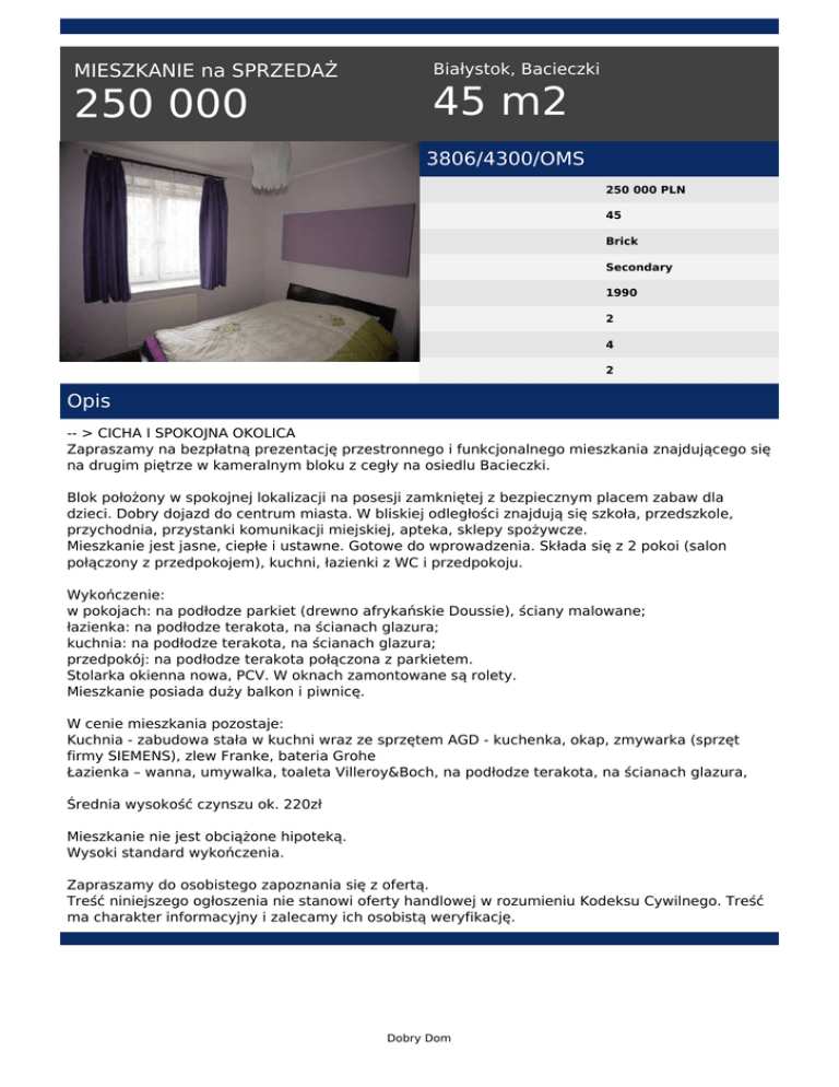 MIESZKANIE na SPRZEDAŻ 250 000 Białystok, Bacieczki 45 m2 3806/4300/OMS 250 000 PLN 45 Brick Secondary 1990 2 4 2 Opis -- > CICHA I SPOKOJNA OKOLICA Zapraszamy na bezpłatną prezentację przestronnego i funkcjonalnego mieszkania znajdującego się na drugim piętrze w kameralnym bloku z cegły na osiedlu Bacieczki. Blok położony w spokojnej lokalizacji na posesji zamkniętej z bezpiecznym placem zabaw dla dzieci. Dobry dojazd do centrum miasta. W bliskiej odległości znajdują się szkoła, przedszkole, przychodnia, przystanki komunikacji miejskiej, apteka, sklepy spożywcze. Mieszkanie jest jasne, ciepłe i ustawne. Gotowe do wprowadzenia. Składa się z 2 pokoi (salon połączony z przedpokojem), kuchni, łazienki z WC i przedpokoju. Wykończenie: w pokojach: na podłodze parkiet (drewno afrykańskie Doussie), ściany malowane; łazienka: na podłodze terakota, na ścianach glazura; kuchnia: na podłodze terakota, na ścianach glazura; przedpokój: na podłodze terakota połączona z parkietem. Stolarka okienna nowa, PCV. W oknach zamontowane są rolety. Mieszkanie posiada duży balkon i piwnicę. W cenie mieszkania pozostaje: Kuchnia - zabudowa stała w kuchni wraz ze sprzętem AGD - kuchenka, okap, zmywarka (sprzęt firmy SIEMENS), zlew Franke, bateria Grohe Łazienka – wanna, umywalka, toaleta Villeroy&Boch, na podłodze terakota, na ścianach glazura, Średnia wysokość czynszu ok. 220zł Mieszkanie nie jest obciążone hipoteką. Wysoki standard wykończenia. Zapraszamy do osobistego zapoznania się z ofertą. Treść niniejszego ogłoszenia nie stanowi oferty handlowej w rozumieniu Kodeksu Cywilnego. Treść ma charakter informacyjny i zalecamy ich osobistą weryfikację. Dobry Dom Dobry Dom tel. 690 692 915 email: [email protected] Dobry Dom Powered by TCPDF (www.tcpdf.org)
