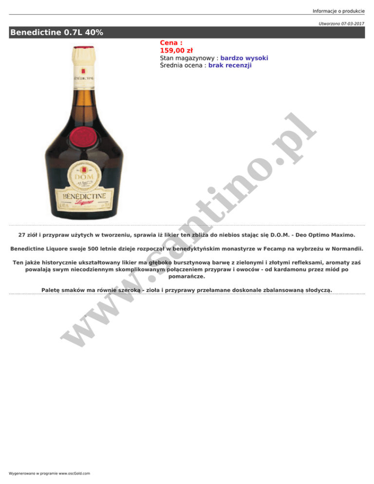 Informacje o produkcie Utworzono 07-03-2017 Benedictine 0.7L 40% Cena : 159,00 zł an t in o. pl Stan magazynowy : bardzo wysoki Średnia ocena : brak recenzji 27 ziół i przypraw użytych w tworzeniu, sprawia iż likier ten zbliża do niebios stając się D.O.M. - Deo Optimo Maximo. Benedictine Liquore swoje 500 letnie dzieje rozpoczął w benedyktyńskim monastyrze w Fecamp na wybrzeżu w Normandii. w .s Ten jakże historycznie ukształtowany likier ma głęboko bursztynową barwę z zielonymi i złotymi refleksami, aromaty zaś powalają swym niecodziennym skomplikowanym połączeniem przypraw i owoców - od kardamonu przez miód po pomarańcze. w w Paletę smaków ma równie szeroką - zioła i przyprawy przełamane doskonale zbalansowaną słodyczą. Wygenerowano w programie www.oscGold.com