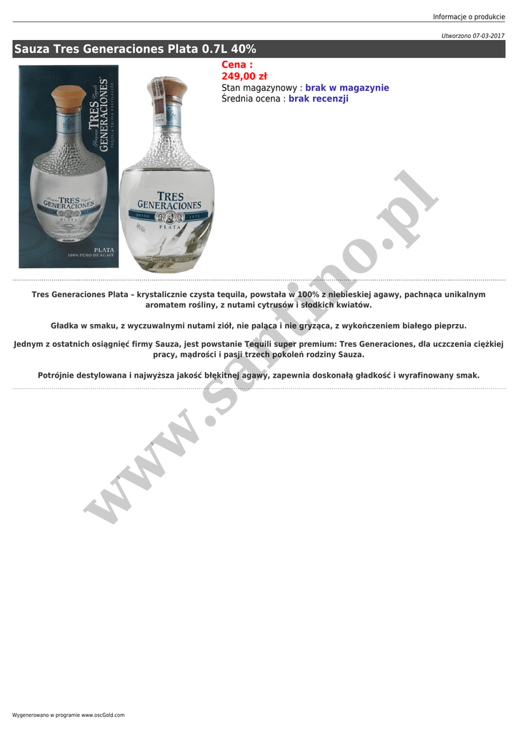 Informacje o produkcie Utworzono 07-03-2017 Sauza Tres Generaciones Plata 0.7L 40% Cena : 249,00 zł in o. pl Stan magazynowy : brak w magazynie Średnia ocena : brak recenzji Tres Generaciones Plata – krystalicznie czysta tequila, powstała w 100% z niebieskiej agawy, pachnąca unikalnym aromatem rośliny, z nutami cytrusów i słodkich kwiatów. an t Gładka w smaku, z wyczuwalnymi nutami ziół, nie paląca i nie gryząca, z wykończeniem białego pieprzu. Jednym z ostatnich osiągnięć firmy Sauza, jest powstanie Tequili super premium: Tres Generaciones, dla uczczenia ciężkiej pracy, mądrości i pasji trzech pokoleń rodziny Sauza. w w w .s Potrójnie destylowana i najwyższa jakość błękitnej agawy, zapewnia doskonałą gładkość i wyrafinowany smak. Wygenerowano w programie www.oscGold.com