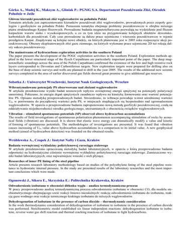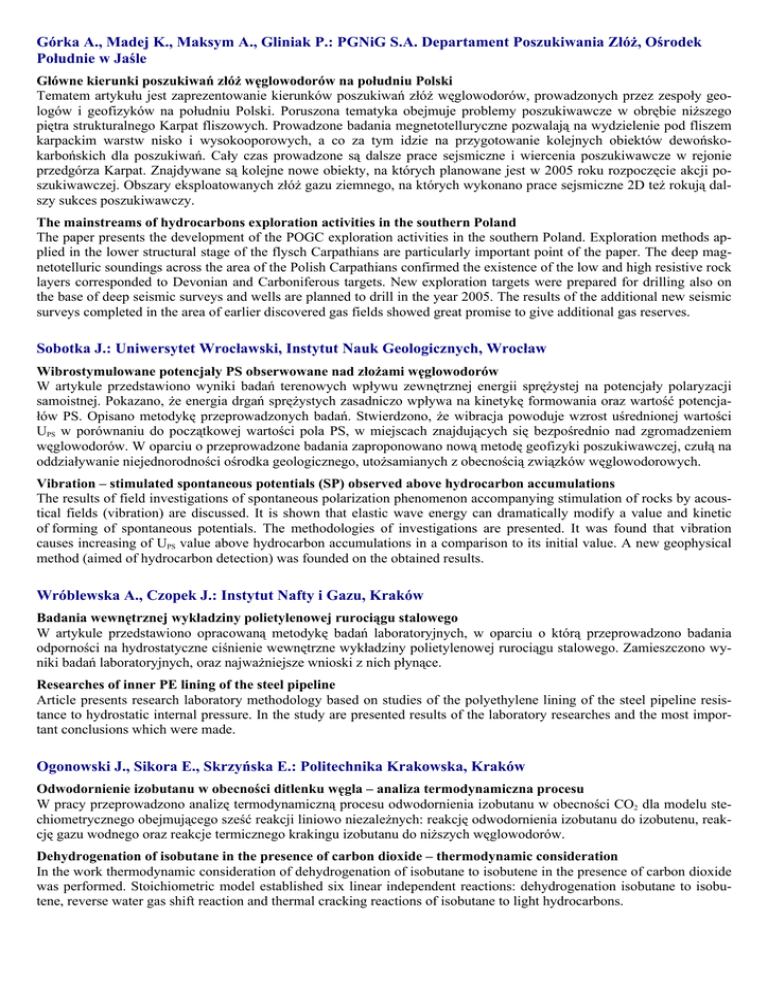 Górka A., Madej K., Maksym A., Gliniak P.: PGNiG S.A. Departament Poszukiwania Złóż, Ośrodek Południe w Jaśle Główne kierunki poszukiwań złóż węglowodorów na południu Polski Tematem artykułu jest zaprezentowanie kierunków poszukiwań złóż węglowodorów, prowadzonych przez zespoły geologów i geofizyków na południu Polski. Poruszona tematyka obejmuje problemy poszukiwawcze w obrębie niższego piętra strukturalnego Karpat fliszowych. Prowadzone badania megnetotelluryczne pozwalają na wydzielenie pod fliszem karpackim warstw nisko i wysokooporowych, a co za tym idzie na przygotowanie kolejnych obiektów dewońskokarbońskich dla poszukiwań. Cały czas prowadzone są dalsze prace sejsmiczne i wiercenia poszukiwawcze w rejonie przedgórza Karpat. Znajdywane są kolejne nowe obiekty, na których planowane jest w 2005 roku rozpoczęcie akcji poszukiwawczej. Obszary eksploatowanych złóż gazu ziemnego, na których wykonano prace sejsmiczne 2D też rokują dalszy sukces poszukiwawczy. The mainstreams of hydrocarbons exploration activities in the southern Poland The paper presents the development of the POGC exploration activities in the southern Poland. Exploration methods applied in the lower structural stage of the flysch Carpathians are particularly important point of the paper. The deep magnetotelluric soundings across the area of the Polish Carpathians confirmed the existence of the low and high resistive rock layers corresponded to Devonian and Carboniferous targets. New exploration targets were prepared for drilling also on the base of deep seismic surveys and wells are planned to drill in the year 2005. The results of the additional new seismic surveys completed in the area of earlier discovered gas fields showed great promise to give additional gas reserves. Sobotka J.: Uniwersytet Wrocławski, Instytut Nauk Geologicznych, Wrocław Wibrostymulowane potencjały PS obserwowane nad złożami węglowodorów W artykule przedstawiono wyniki badań terenowych wpływu zewnętrznej energii sprężystej na potencjały polaryzacji samoistnej. Pokazano, że energia drgań sprężystych zasadniczo wpływa na kinetykę formowania oraz wartość potencjałów PS. Opisano metodykę przeprowadzonych badań. Stwierdzono, że wibracja powoduje wzrost uśrednionej wartości UPS w porównaniu do początkowej wartości pola PS, w miejscach znajdujących się bezpośrednio nad zgromadzeniem węglowodorów. W oparciu o przeprowadzone badania zaproponowano nową metodę geofizyki poszukiwawczej, czułą na oddziaływanie niejednorodności ośrodka geologicznego, utożsamianych z obecnością związków węglowodorowych. Vibration – stimulated spontaneous potentials (SP) observed above hydrocarbon accumulations The results of field investigations of spontaneous polarization phenomenon accompanying stimulation of rocks by acoustical fields (vibration) are discussed. It is shown that elastic wave energy can dramatically modify a value and kinetic of forming of spontaneous potentials. The methodologies of investigations are presented. It was found that vibration causes increasing of UPS value above hydrocarbon accumulations in a comparison to its initial value. A new geophysical method (aimed of hydrocarbon detection) was founded on the obtained results. Wróblewska A., Czopek J.: Instytut Nafty i Gazu, Kraków Badania wewnętrznej wykładziny polietylenowej rurociągu stalowego W artykule przedstawiono opracowaną metodykę badań laboratoryjnych, w oparciu o którą przeprowadzono badania odporności na hydrostatyczne ciśnienie wewnętrzne wykładziny polietylenowej rurociągu stalowego. Zamieszczono wyniki badań laboratoryjnych, oraz najważniejsze wnioski z nich płynące. Researches of inner PE lining of the steel pipeline Article presents research laboratory methodology based on studies of the polyethylene lining of the steel pipeline resistance to hydrostatic internal pressure. In the study are presented results of the laboratory researches and the most important conclusions which were made. Ogonowski J., Sikora E., Skrzyńska E.: Politechnika Krakowska, Kraków Odwodornienie izobutanu w obecności ditlenku węgla – analiza termodynamiczna procesu W pracy przeprowadzono analizę termodynamiczną procesu odwodornienia izobutanu w obecności CO2 dla modelu stechiometrycznego obejmującego sześć reakcji liniowo niezależnych: reakcję odwodornienia izobutanu do izobutenu, reakcję gazu wodnego oraz reakcje termicznego krakingu izobutanu do niższych węglowodorów. Dehydrogenation of isobutane in the presence of carbon dioxide – thermodynamic consideration In the work thermodynamic consideration of dehydrogenation of isobutane to isobutene in the presence of carbon dioxide was performed. Stoichiometric model established six linear independent reactions: dehydrogenation isobutane to isobutene, reverse water gas shift reaction and thermal cracking reactions of isobutane to light hydrocarbons.