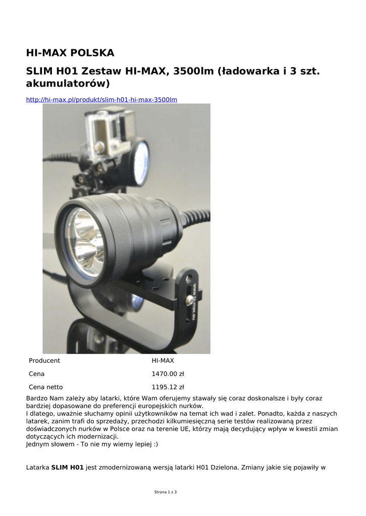 HI-MAX POLSKA SLIM H01 Zestaw HI-MAX, 3500lm (ładowarka i 3 szt. akumulatorów) http://hi-max.pl/produkt/slim-h01-hi-max-3500lm Producent HI-MAX Cena 1470.00 zł Cena netto 1195.12 zł Bardzo Nam zależy aby latarki, które Wam oferujemy stawały się coraz doskonalsze i były coraz bardziej dopasowane do preferencji europejskich nurków. I dlatego, uważnie słuchamy opinii użytkowników na temat ich wad i zalet. Ponadto, każda z naszych latarek, zanim trafi do sprzedaży, przechodzi kilkumiesięczną serie testów realizowaną przez doświadczonych nurków w Polsce oraz na terenie UE, którzy mają decydujący wpływ w kwestii zmian dotyczących ich modernizacji. Jednym słowem - To nie my wiemy lepiej :) Latarka SLIM H01 jest zmodernizowaną wersją latarki H01 Dzielona. Zmiany jakie się pojawiły w Strona 1 z 3 wyniku Waszych porad to: - latarka SLIM H01 dostała obrotowy włącznik w głowicy (zamiast przyciskowego na kanistrze) o 3 poziomach mocy ~ 3500lm/130 min, 2000lm/185 min, 1300lm/260min. - uchwyt Goodmana z otworami ¼″ do montażu kamery GoPro oraz możliwość mocowania głowicy centralnie, maksymalnie po prawej i maksymalnie po lewej. - mocowanie głowicy z uchwytem Goodmana trzema (kształt trójkąta) zamiast dwoma (w linii) śrubami. Ma to wyeliminować chybotanie się głowicy na Goodmanie. - wszystkie śruby montażowe zamiast śrubokrętem gwiazdkowym skręcamy teraz imbusem (w zestawie) - otwory na karabińczyk po obu stronach Goodmana oraz zaokrąglone szczyty uchwytu zapobiegające ewentualnemu uszkodzeniu suchego skafandra. - w zestawie SLIM H01 - szybka ładowarka trzystanowiskowa do akumulatorków 26650 o czasie ładowania około 6 godzin oraz 3 szt. akumulatorków HI-MAX 26650, 4000mAh, PCB. - wydłużony czas świecenia na pełnej mocy do 130 min (H01 Dzielona-110 min) , potem wyraźne 30 min przygasania. - dekielek do kanistra powodujący, że możemy SLIM H01 transportować jako dwa elementy: głowica z kablem oraz kanister z akumulatorkami. - pogrubione ożyłowanie kabla z 0,75mm do 1,00mm o długości 1,5m. SLIM H01 jest bardzo mocną, lekką i poręczną latarką kanistrową wyposażoną w uchwyt Goodmana z możliwością montażu kamerki GoPro oraz (w niedługiej przyszłości) 2 latarek video na dedykowanych do tego Goodmana ramionach (opcja nad którą prace wdrożeniowe właśnie trwają). Chodzi nam o to, aby nurek w jednym ręku mógł dysponować dwoma światłami video, kamerką GoPro oraz światłem głównym w postaci SLIM H01 (które może być szybko wyłączane podczas filmowania) Niewątpliwymi zaletami tej latarki jest duża moc wytwarzanej wiązki światła (3500lm) oraz jej niewielki ciężar (1,2 kg wraz z akumulatorami), uzyskany poprzez zastosowanie smukłego i opływowego zasobnika, co ma znaczenie podczas transportu lotniczego, ale ma także wpływ na komfort podczas samego nurkowania. Zasobnik jest tak zaprojektowany, aby mieścić 3 sztuki akumulatorków 26650. W przypadku Zestawu SLIM H01, są to akumulatorki HI-MAX 26650, 4000 mAh, PCB, umożliwiające pracę na maksymalnej mocy przez ponad 2 godziny. Oczywiście można ten czas wydłużyć poprzez redukcję natężenia wiązki światła. Do tego celu służy włącznik obrotowy znajdujący się na głowicy. Do dyspozycji nurka są trzy tryby mocy wiązki światła: 1. 3500lm ~ 130 minut 2. 2000lm ~ 185 minut 3. 1300lm ~ 260 minut Możliwość zastosowania 3 osobnych (a nie w pakiecie) akumulatorków daje zaś możliwość w razie ewentualnej awarii któregokolwiek z nich na łatwą, szybką a przede wszystkim, na tanią wymianę uszkodzonego akumulatorka. Strona 2 z 3 Ponadto, można też zaopatrzyć się w dodatkowy zestaw akumulatorków (około 200zł) i wymieniać je pomiędzy nurkowaniami, uzyskując w ten sposób ponad 4 godziny świecenia. ZESTAW HI-MAX SLIM H01 zawiera; 1 szt. latarka SLIM H01, 3500 lumen. 3 szt. akumulatorków 26650, 4000 mAh, PCB. 1 szt. szybka ładowarka na 3 akumulatory 26650 (można ładować też inne typy akumulatorów). 1 szt. uchwyt “Goodman” z otworami ¼″ do montażu kamery GoPro. 1 szt, zestaw śrub montażowych oraz klucz imbusowy do ich skręcenia. 1 szt. zapasowe o-ringi Strona 3 z 3
