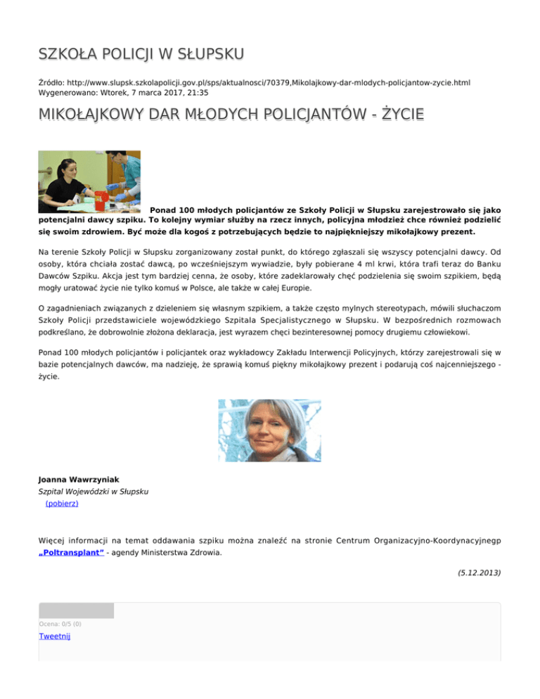 SZKOŁA POLICJI W SŁUPSKU Źródło: http://www.slupsk.szkolapolicji.gov.pl/sps/aktualnosci/70379,Mikolajkowy-dar-mlodych-policjantow-zycie.html Wygenerowano: Wtorek, 7 marca 2017, 21:35 MIKOŁAJKOWY DAR MŁODYCH POLICJANTÓW - ŻYCIE Ponad 100 młodych policjantów ze Szkoły Policji w Słupsku zarejestrowało się jako potencjalni dawcy szpiku. To kolejny wymiar służby na rzecz innych, policyjna młodzież chce również podzielić się swoim zdrowiem. Być może dla kogoś z potrzebujących będzie to najpiękniejszy mikołajkowy prezent. Na terenie Szkoły Policji w Słupsku zorganizowany został punkt, do którego zgłaszali się wszyscy potencjalni dawcy. Od osoby, która chciała zostać dawcą, po wcześniejszym wywiadzie, były pobierane 4 ml krwi, która trafi teraz do Banku Dawców Szpiku. Akcja jest tym bardziej cenna, że osoby, które zadeklarowały chęć podzielenia się swoim szpikiem, będą mogły uratować życie nie tylko komuś w Polsce, ale także w całej Europie. O zagadnieniach związanych z dzieleniem się własnym szpikiem, a także często mylnych stereotypach, mówili słuchaczom Szkoły Policji przedstawiciele wojewódzkiego Szpitala Specjalistycznego w Słupsku. W bezpośrednich rozmowach podkreślano, że dobrowolnie złożona deklaracja, jest wyrazem chęci bezinteresownej pomocy drugiemu człowiekowi. Ponad 100 młodych policjantów i policjantek oraz wykładowcy Zakładu Interwencji Policyjnych, którzy zarejestrowali się w bazie potencjalnych dawców, ma nadzieję, że sprawią komuś piękny mikołajkowy prezent i podarują coś najcenniejszego życie. Joanna Wawrzyniak Szpital Wojewódzki w Słupsku (pobierz) Więcej informacji na temat oddawania szpiku można znaleźć na stronie Centrum Organizacyjno-Koordynacyjnegp „Poltransplant” - agendy Ministerstwa Zdrowia. (5.12.2013) Ocena: 0/5 (0) Tweetnij