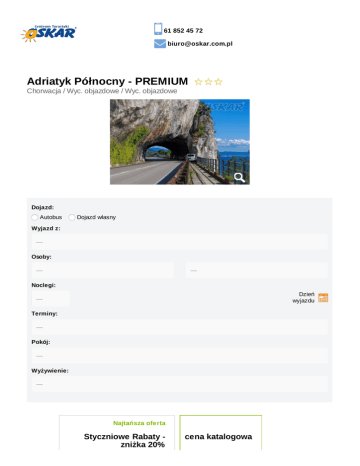 61 852 45 72 [email protected] Adriatyk Północny - PREMIUM Chorwacja / Wyc. objazdowe / Wyc. objazdowe Dojazd: Autobus Dojazd własny Wyjazd z: Osoby: Noclegi: Dzień wyjazdu Terminy: Pokój: Wyżywienie: Najtańsza oferta Styczniowe Rabaty zniżka 20% cena katalogowa Suma: do 10 marca 2017: 1399,00 zł do 10 marca 2017: 419,70 zł do 31 sierpnia 2017: 0,00 zł do 31 sierpnia 2017: 979,30 zł 1399,00 zł Suma: 1399,00 zł Opis oferty Miejscowość Przejazd autokarem PREMIUM autokar-premium-oskar-tablet-gniazdko-usb-wygodne-fotele Opinie Realizacja imprezy autokarami PREMIUM to gwarancja: transportu autokarami z roczników 2015 i 2016 produkcji Irizar i VDL Rozkład jazdy indywidualnego, multimedialnego systemu rozrywki - tablet z dotykowym ekranem w każdym zagłówku (filmy, gry, muzyka itp.). Możliwość podłączenia własnego nośnika danych poprzez wejście AUX lub USB. najwyższej klasy skórzanych lub półskórzanych foteli z możliwością regulacji oparcia lub/i zagłówka największej w Polsce przestrzeni między siedzeniami małej półki przed każdym siedzeniem + siateczki na czasopisma, książki czy telefon bezpłatnego dostępu do sieci WiFi na terenie Polski* gniazdek elektrycznych 230V wydajnej klimatyzacji sterowanej indywidualnie bogato wyposażonego barku udostępnionego w czasie jazdy WC na pokładzie autokaru Idealna i komfortowa podróż… ZAWSZE! Na ternie Polski GWARANTUJEMY, że wszystkie przejazdy realizowane są autobusem, busem lub samochodem osobowym. Zapewnimy komfortowy transport na każdym etapie podróży. Ważne: Autokar Premium jest autokarem docelowym. *jakość usług internetowych może różnić się w zależności od jakości sygnału TOUR GUIDE oprowadzanie z indywidualnym systemem nagłośnieniowym Mobilny zestaw audio: indywidulany zestaw słuchawkowy połączony bezprzewodowo z mikrofonem pilota/przewodnika. Zakwaterowanie Hotele ***/****. Wszystkie pokoje wyposażone są w łazienkę, natomiast w części hoteli również telewizja oraz dostęp do Internetu Wi-Fi. Większość pokoi posiada balkon. Niektóre hotele posiadają basen. Przykładowe zakwaterowanie, które może różnić się w poszczególnych terminach: Domzale (1) – Ambient Hotel, Koper (1) – Hotel Koper, Duga Uvala (2) - Hotel Croatia, Karlovac (1) – Hotel Europa, Podcetrtek (1) - Terme Olimia Hotel Breza Dostępne opcje zakwaterowania: pokój 2 - osobowy pokój 3 - osobowy dokwaterowanie (bez dopłat*) lub pokój 1 - osobowy (dopłata) Dostępne opcje wyżywienia wyżywienie BB: 6 śniadań wyżywienie HB: 6 śniadań + 6 obiadokolacji; możliwość dokonania rezerwacji w wersji HB lub + opcjonalna dopłata do obiadokolacji 50 €/os. (płatne u pilota w autokarze) śniadania kontynentalne: pieczywo, dżem, masło, kawa, herbata lub bufet: pieczywo, ser, szynka, jajka lub parówki itp., napoje: kawa, herbata, sok obiadokolacje serwowane: zupa, danie główne, sałatka, deser, owoc; napoje do obiadokolacji dodatkowo płatne Pakiet KOMFORT gwarancja wyboru miejsca w autokarze napoje w autokarze w cenie (6 x do wyboru: kawa, herbata, zimny napój 0,2l) cena: 50 zł/os Pakiet PRESTIGE gwarancja wyboru miejsca w autokarze napoje w autokarze w cenie (6 x do wyboru: kawa, herbata, zimny napój 0,2l) pierwszeństwo wejścia na pokład autokaru nadbagaż 5 kg w cenie napoje do obiadokolacji (0,2l) cena: 100 zł/os Karta Dużej Rodziny www.oskar.com.pl/zalaczniki/karta_duzej_rodziny Warunki promocji FIRST MINUTE www.oskar.com.pl/zalaczniki/warunki_promocji Ubezpieczenie Warunki ubezpieczenia Bezpieczne Podróże Signal Iduna dokument do pobrania www.oskar.com.pl/zalaczniki/owu Warunki ubezpieczenia Kosztów Imprezy Turystycznej Signal Iduna dokument do pobrania www.oskar.com.pl/zalaczniki/owurg Turystyczny Fundusz Gwarancyjny W związku z powołaniem do życia w dniu 26.11.2016 Turystycznego Funduszu Gwarancyjnego każdy klient Biura Podróży Oskar zobowiązany jest do zapłaty kwoty w wysokości 10zł/os. przy każdorazowej rezerwacji imprezy turystycznej (obowiązuje od dnia 26.11.2016). Kwota przeznaczona na Turystyczny Fundusz Gwarancyjny zostanie automatycznie doliczona do wartości rezerwacji (w momencie jej dokonania). Wyjątkiem są imprezy turystyczne odbywające się w krajach posiadających granicę z Rzeczpospolitą Polską. Składka nie jest przychodem biura. Udogodnienia Klimatyzacja Regulowane fotele Tacki Multimedia Nowoczesna flota Zawodowy kierowca Pasy bezpieczeństwa Toaleta w autokarze Podnóżki Wi-Fi Bez paszportu Premium Elite Tour guide Program ramowy DZIEŃ 1 (sobota) Wyjazd z Polski zgodnie z rozkładem jazdy autokarów. Przejazd przez Czechy, Austrię i Słowenię. (Trasa ok. 690 km) DZIEŃ 2 (niedziela) Przyjazd do Słowenii. Bled to niewątpliwie jedna z tutejszych atrakcji - spokojne jezioro z jedyną wyspą w kraju, na której znajduje się kościółek Wniebowzięcia NMP, a nad wszystkim, na szarej skale, góruje zamek, z dziedzińców którego roztacza się widok na majestatyczne Alpy i najwyższy szczyt Triglav. Miejscowość była znana jako rezydencja królów Jugosławii, a także miejsce, w którym dyktator J.B. Tito przyjmował zagranicznych gości. Wąwóz Vintgar - 2-kilometrowy parów, wyrzeźbiony przez wody rzeki Radovny. Przepiękne miejsce, które nie było znane aż do końca XIX wieku, kiedy to zostało odkryte. Został tutaj zbudowany system kładek, dzięki któremu można przejść nad załomami, wirami oraz bulgoczącą wodą i dotrzeć do 16-metrowego wodospadu Szum. W programie zwiedzanie średniowiecznego miasteczka Skofja Loka (pol. "Biskupia Łąka"), które zostało przebudowane w duchu wczesnobarokowym, po tym, jak miało tutaj miejsce trzęsienie ziemi. Główną atrakcją tego miejsca jest festiwal rycerski (bezpłatny), odbywający się pod koniec czerwca. Przejazd do hotelu. Obiadokolacja. Nocleg. (Trasa ok. 115 km) DZIEŃ 3 (poniedziałek) Śniadanie. Ljubljana czyli stolica Słowenii, która uchodzi za najba