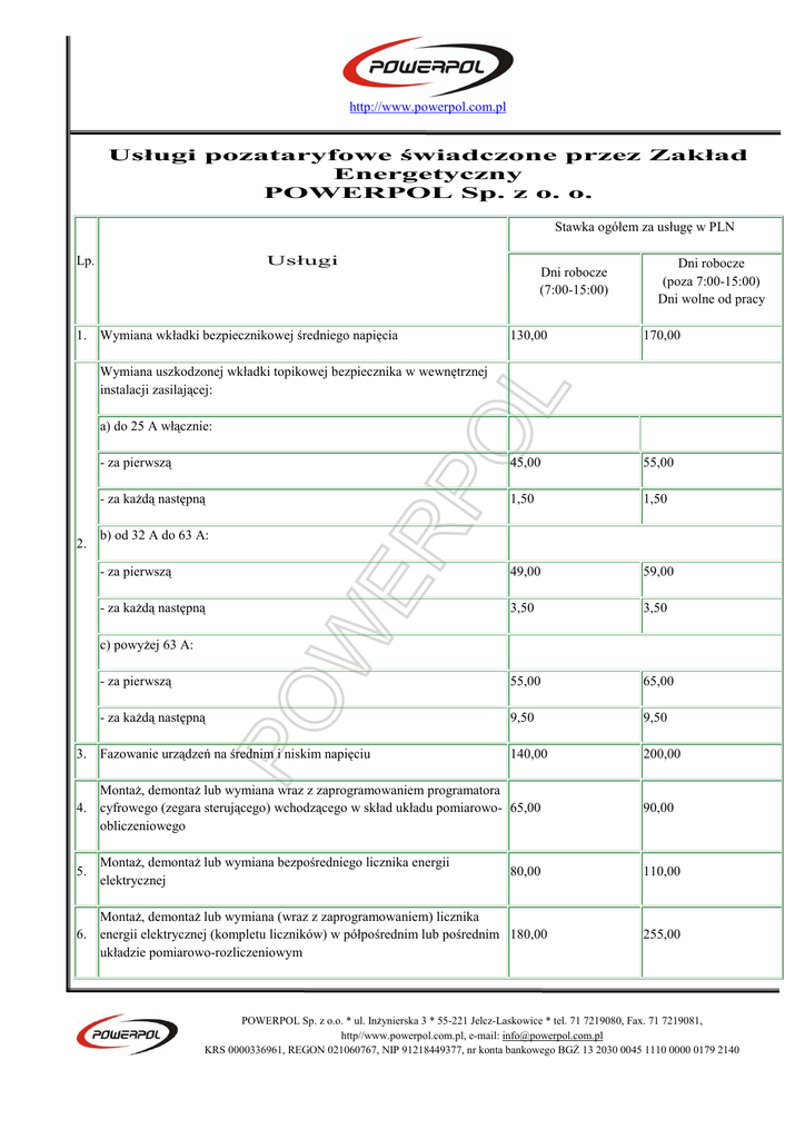 http://www.powerpol.com.pl Usługi pozataryfowe świadczone przez Zakład Energetyczny POWERPOL Sp. z o. o. Stawka ogółem za usługę w PLN Lp. Usługi 1. Wymiana wkładki bezpiecznikowej średniego napięcia Dni robocze (7:00-15:00) Dni robocze (poza 7:00-15:00) Dni wolne od pracy 130,00 170,00 - za pierwszą 45,00 55,00 - za każdą następną 1,50 1,50 - za pierwszą 49,00 59,00 - za każdą następną 3,50 3,50 - za pierwszą 55,00 65,00 - za każdą następną 9,50 9,50 140,00 200,00 Wymiana uszkodzonej wkładki topikowej bezpiecznika w wewnętrznej instalacji zasilającej: a) do 25 A włącznie: 2. b) od 32 A do 63 A: c) powyżej 63 A: 3. Fazowanie urządzeń na średnim i niskim napięciu Montaż, demontaż lub wymiana wraz z zaprogramowaniem programatora 4. cyfrowego (zegara sterującego) wchodzącego w skład układu pomiarowo- 65,00 obliczeniowego 5. Montaż, demontaż lub wymiana bezpośredniego licznika energii elektrycznej 80,00 Montaż, demontaż lub wymiana (wraz z zaprogramowaniem) licznika 6. energii elektrycznej (kompletu liczników) w półpośrednim lub pośrednim 180,00 układzie pomiarowo-rozliczeniowym 90,00 110,00 255,00 POWERPOL Sp. z o.o. * ul. Inżynierska 3 * 55-221 Jelcz-Laskowice * tel. 71 7219080, Fax. 71 7219081, http//www.powerpol.com.pl, e-mail: [email protected] KRS 0000336961, REGON 021060767, NIP 91218449377, nr konta bankowego BGŻ 13 2030 0045 1110 0000 0179 2140 http://www.powerpol.com.pl 7. Zaprogramowanie licznika elektronicznego, rejestratora lub przystawki rejestrującej 8. Nieuzasadnione wezwanie pogotowia energetycznego 9. Wymiana i naprawa uszkodzonego licznika lub innego urządzenia wchodzącego w skład układu pomiarowo-rozliczeniowego 100,00 140,00 65,00 100,00 Rzeczywiste koszty naprawy lub w przypadku nieopłacalności naprawy koszt nowego licznika lub innego urządzenia, powiększony o koszty wymiany 1. Uzgodnienie usytuowania (zbliżenia, skrzyżowania) obiektu z siecią elektroenergetyczną: 1. przy braku zbliżeń i skrzyżowań - 30,00 2. za pierwsze zbliżenie na długości do 100 m lub pierwsze skrzyżowanie - 30,00 1.1. obiekt liniowy7) 8) 3. za rozpoczęty 100 m odcinek zbliżenia, z wyłączeniem przypadku z pkt. 2) - 5,00 4. za każde skrzyżowanie, z wyłączeniem przypadku z pkt. 2) - 5,00 10. 1. za pierwsze 1000 m2 - 60,00 1.2. obiekt nieliniowy np. dom jednorodzinny, droga, staw itp.: 2. za każde następne 1000 m2 - 10,00 2. Uzgodnienie usytuowania projektowanych przyłączy do pojedynczego budynku: 1. za pierwsze przyłącze - 35,00 2. za każde następne przyłącze - 6,00 1. stawka za każdą rozpoczętą godzinę pracy – 40,00 3. Uzgodnienia pozostałe 2. koszt transportu ryczałtem za jazdę w obrębie Jelcza-Laskowice – 30,00/pojedynczy wyjazd. Wypożyczenie na dobę: - licznika energii elektrycznej bezpośredniego 11. - licznika energii elektrycznej półpośredniego lub pośredniego 2,00 3,00 - licznika energii elektrycznej 2 lub 4-kwadrantowego 4,00 - programatora cyfrowego (zegara sterującego) 1,02 POWERPOL Sp. z o.o. * ul. Inżynierska 3 * 55-221 Jelcz-Laskowice * tel. 71 7219080, Fax. 71 7219081, http//www.powerpol.com.pl, e-mail: [email protected] KRS 0000336961, REGON 021060767, NIP 91218449377, nr konta bankowego BGŻ 13 2030 0045 1110 0000 0179 2140 http://www.powerpol.com.pl Kolejne sprawdzenie gotowości do przyłączenia do sieci elektroenergetycznej instalacji Odbiorcy: 12. - grupy taryfowej A 445,00 - grupy taryfowej B 360,00 - grupy taryfowej C 45,00 Prace zlecone dodatkowo elektromonterom Pogotowia Energetycznego 13. w ramach wykonywania czynności określonych w Cenniku (np. lokalizacja i likwidacja uszkodzeń w instalacji zleceniodawcy) stawka za rozpoczętą rbg – 40,00 stawka za rozpoczętą rbg – 60,00 - w sieci nN 200,00 270,00 - w sieci SN 290,00 395,00 15. Za każdą godzinę nadzoru pełnionego nad pracami wykonywanymi na urządzeniach nie będących własnością POWERPOL 45,00 70,00 16. Założenie plomb na urządzeniach podlegających oplombowaniu na zlecenie podmiotów obcych (np. wykonawców robót elektrycznych): 14. Wyłączenie napięcia i przygotowanie miejsca pracy oraz likwidacja miejsca pracy wraz z ponownym załączeniem urządzeń (dla podmiotów, którym POWERPOL nie świadczy usługi dystrybucji energii elektrycznej): - za pierwszą plombę 25,00 - za każdą następną plombę 5,00 17. Wymiana lub zmiana nastawień zabezpieczenia przeciążeniowego w zestawie złączowo-pomiarowym POWERPOL, w przypadku zmniejszenia mocy na życzenie odbiorcy: - wymiana zabezpieczenia typu Z-TS 18. - wymiana zabezpieczenia typu S 19 235,00 180,00 - zmiana nastawień zabezpieczenia typu Z-TS 25,00 Wykonanie dodatkowego odczytu licznika na zlecenie Odbiorcy energii elektrycznej: 30,00 + ryczałt na dojazdy POWERPOL Sp. z o.o. * ul. Inżynierska 3 * 55-221 Jelcz-Laskowice * tel. 71 7219080, Fax. 71 7219081, http//www.powerpol.com.pl, e-mail: [email protected] KRS 0000336961, REGON 021060767, NIP 91218449377, nr konta bankowego BGŻ 13 2030 0045 1110 0000 0179 2140 http://www.powerpol.com.pl 1. POWERPOL Sp. z o. o.. wykonuje także inne niż wyżej wymienione czynności, których stawka zostanie skalkulowana po kosztach własnych. 2. Stawki podane są w wartościach netto. Do wartości usługi dolicza się podatek VAT w wysokości obowiązującej w dniu wystawienia faktury. 3. W przypadku, gdy w ramach jednego dojazdu do zleceniodawcy wykonywana jest więcej niż jedna czynność spośród wymienionych w cenniku, opłaty za wykonanie kolejnych czynności pomniejsza się o koszt dojazdu tj. 30,00 zł 4. W przypadku użycia materiałów POWERPOL, do stawki za wykonanie czynności należy doliczyć ich koszt, uwzględniając 10% zysku oraz koszty zakupu. 5. Wystąpienie więcej niż jednego skrzyżowania w obrębie 5 m należy traktować jako jedno skrzyżowanie. 6. Zbliżenie do więcej niż jednego obiektu sieci elektroenergetycznej na tym samym odcinku należy traktować jako jedno 