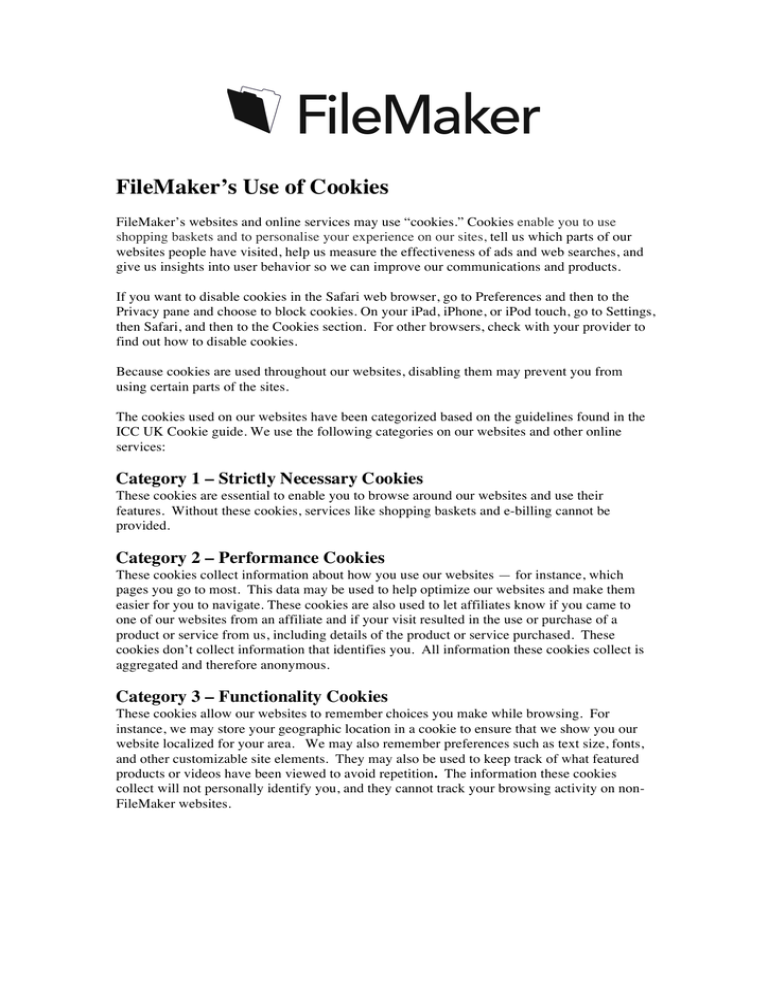 FileMaker’s Use of Cookies FileMaker’s websites and online services may use “cookies.” Cookies enable you to use shopping baskets and to personalise your experience on our sites, tell us which parts of our websites people have visited, help us measure the effectiveness of ads and web searches, and give us insights into user behavior so we can improve our communications and products. If you want to disable cookies in the Safari web browser, go to Preferences and then to the Privacy pane and choose to block cookies. On your iPad, iPhone, or iPod touch, go to Settings, then Safari, and then to the Cookies section. For other browsers, check with your provider to find out how to disable cookies. Because cookies are used throughout our websites, disabling them may prevent you from using certain parts of the sites. The cookies used on our websites have been categorized based on the guidelines found in the ICC UK Cookie guide. We use the following categories on our websites and other online services: Category 1 – Strictly Necessary Cookies These cookies are essential to enable you to browse around our websites and use their features. Without these cookies, services like shopping baskets and e-billing cannot be provided. Category 2 – Performance Cookies These cookies collect information about how you use our websites — for instance, which pages you go to most. This data may be used to help optimize our websites and make them easier for you to navigate. These cookies are also used to let affiliates know if you came to one of our websites from an affiliate and if your visit resulted in the use or purchase of a product or service from us, including details of the product or service purchased. These cookies don’t collect information that identifies you. All information these cookies collect is aggregated and therefore anonymous. Category 3 – Functionality Cookies These cookies allow our websites to remember choices you make while browsing. For instance, we may store your geographic location in a cookie to ensure that we show you our website localized for your area. We may also remember preferences such as text size, fonts, and other customizable site elements. They may also be used to keep track of what featured products or videos have been viewed to avoid repetition. The information these cookies collect will not personally identify you, and they cannot track your browsing activity on nonFileMaker websites.