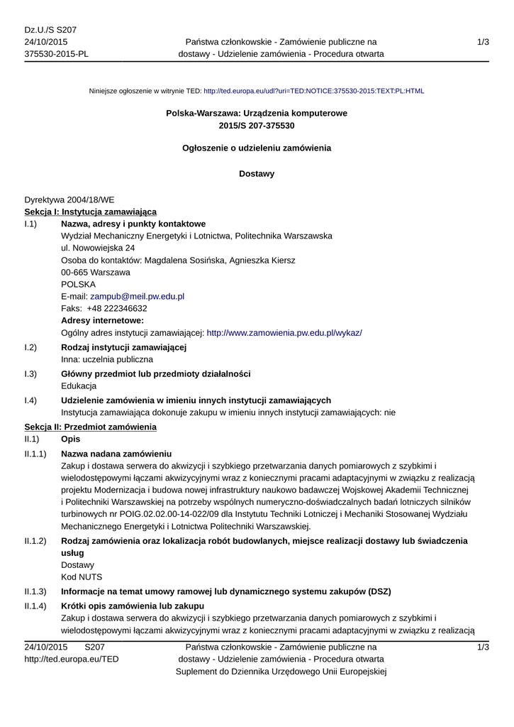 Dz.U./S S207 24/10/2015 375530-2015-PL Państwa członkowskie - Zamówienie publiczne na dostawy - Udzielenie zamówienia - Procedura otwarta 1/3 Niniejsze ogłoszenie w witrynie TED: http://ted.europa.eu/udl?uri=TED:NOTICE:375530-2015:TEXT:PL:HTML Polska-Warszawa: Urządzenia komputerowe 2015/S 207-375530 Ogłoszenie o udzieleniu zamówienia Dostawy Dyrektywa 2004/18/WE Sekcja I: Instytucja zamawiająca I.1) Nazwa, adresy i punkty kontaktowe Wydział Mechaniczny Energetyki i Lotnictwa, Politechnika Warszawska ul. Nowowiejska 24 Osoba do kontaktów: Magdalena Sosińska, Agnieszka Kiersz 00-665 Warszawa POLSKA E-mail: [email protected] Faks: +48 222346632 Adresy internetowe: Ogólny adres instytucji zamawiającej: http://www.zamowienia.pw.edu.pl/wykaz/ I.2) Rodzaj instytucji zamawiającej Inna: uczelnia publiczna I.3) Główny przedmiot lub przedmioty działalności Edukacja I.4) Udzielenie zamówienia w imieniu innych instytucji zamawiających Instytucja zamawiająca dokonuje zakupu w imieniu innych instytucji zamawiających: nie Sekcja II: Przedmiot zamówienia II.1) Opis II.1.1) Nazwa nadana zamówieniu Zakup i dostawa serwera do akwizycji i szybkiego przetwarzania danych pomiarowych z szybkimi i wielodostępowymi łączami akwizycyjnymi wraz z koniecznymi pracami adaptacyjnymi w związku z realizacją projektu Modernizacja i budowa nowej infrastruktury naukowo badawczej Wojskowej Akademii Technicznej i Politechniki Warszawskiej na potrzeby wspólnych numeryczno-doświadczalnych badań lotniczych silników turbinowych nr POIG.02.02.00-14-022/09 dla Instytutu Techniki Lotniczej i Mechaniki Stosowanej Wydziału Mechanicznego Energetyki i Lotnictwa Politechniki Warszawskiej. II.1.2) Rodzaj zamówienia oraz lokalizacja robót budowlanych, miejsce realizacji dostawy lub świadczenia usług Dostawy Kod NUTS II.1.3) Informacje na temat umowy ramowej lub dynamicznego systemu zakupów (DSZ) II.1.4) Krótki opis zamówienia lub zakupu Zakup i dostawa serwera do akwizycji i szybkiego przetwarzania danych pomiarowych z szybkimi i wielodostępowymi łączami akwizycyjnymi wraz z koniecznymi pracami adaptacyjnymi w związku z realizacją 24/10/2015 S207 http://ted.europa.eu/TED Państwa członkowskie - Zamówienie publiczne na dostawy - Udzielenie zamówienia - Procedura otwarta Suplement do Dziennika Urzędowego Unii Europejskiej 1/3 Dz.U./S S207 24/10/2015 375530-2015-PL Państwa członkowskie - Zamówienie publiczne na dostawy - Udzielenie zamówienia - Procedura otwarta 2/3 projektu Modernizacja i budowa nowej infrastruktury naukowo badawczej Wojskowej Akademii Technicznej i Politechniki Warszawskiej na potrzeby wspólnych numeryczno-doświadczalnych badań lotniczych silników turbinowych nr POIG.02.02.00-14-022/09 dla Instytutu Techniki Lotniczej i Mechaniki Stosowanej Wydziału Mechanicznego Energetyki i Lotnictwa Politechniki Warszawskiej. II.1.5) Wspólny Słownik Zamówień (CPV) 30200000 II.1.6) Informacje na temat Porozumienia w sprawie zamówień rządowych (GPA) II.2) Całkowita końcowa wartość zamówienia (zamówień) II.2.1) Całkowita końcowa wartość zamówienia (zamówień) Sekcja IV: Procedura IV.1) Rodzaj procedury IV.1.1) Rodzaj procedury Otwarta IV.2) Kryteria udzielenia zamówienia IV.2.1) Kryteria udzielenia zamówienia Oferta najkorzystniejsza ekonomicznie z uwzględnieniem kryteriów 1. Cena. Waga 85 2. Okres gwarancji. Waga 8 3. Termin dostawy. Waga 7 IV.2.2) Informacje na temat aukcji elektronicznej IV.3) Informacje administracyjne IV.3.1) Numer referencyjny nadany sprawie przez instytucję zamawiającą IV.3.2) Poprzednie publikacje dotyczące tego samego zamówienia Ogłoszenie o zamówieniu Numer ogłoszenia w Dz.U.: 2015/S 156-286559 z dnia 14.8.2015 Sekcja V: Udzielenie zamówienia V.1) Data decyzji o udzieleniu zamówienia: 19.10.2015 V.2) Informacje o ofertach Liczba otrzymanych ofert: 2 V.3) Nazwa i adres wykonawcy, na rzecz którego została wydana decyzja o udzieleniu zamówienia IT Systems and Solutions Sp. z o.o. ul. Puławska 469 02-844 Warszawa V.4) Informacje na temat wartości zamówienia Początkowa szacunkowa całkowita wartość zamówienia: Wartość: 1 950 000 PLN Bez VAT Całkowita końcowa wartość zamówienia: Wartość: 1 569 696 PLN Bez VAT V.5) Informacje na temat podwykonawstwa 24/10/2015 S207 http://ted.europa.eu/TED Państwa członkowskie - Zamówienie publiczne na dostawy - Udzielenie zamówienia - Procedura otwarta Suplement do Dziennika Urzędowego Unii Europejskiej 2/3 Dz.U./S S207 24/10/2015 375530-2015-PL Państwa członkowskie - Zamówienie publiczne na dostawy - Udzielenie zamówienia - Procedura otwarta 3/3 Sekcja VI: Informacje uzupełniające VI.1) Informacje o funduszach Unii Europejskiej Zamówienie dotyczy projektu/programu finansowanego ze środków Unii Europejskiej: tak Podać odniesienie do projektu (projektów) i/lub programu (programów): Zakup jest współfinansowany ze środków Europejskiego Funduszu Rozwoju Regionalnego w ramach Projektu Operacyjnego Innowacyjna Gospodarka 2007–2013 w związku z realizacją projektu Modernizacja i budowa nowej infrastruktury naukowo badawczej Wojskowej Akademii Technicznej i Politechniki Warszawskiej na potrzeby wspólnych numerycznodoświadczalnych badań lotniczych silników turbinowych nr POIG.02.02.00-14-022/09 dla Instytutu Techniki Lotniczej i Mechaniki Stosowanej Wydziału MEiL. VI.2) Informacje dodatkowe: VI.3) Procedury odwoławcze VI.3.1) Organ odpowiedzialny za procedury odwoławcze VI.3.2) Składanie odwołań VI.3.3) Źródło, gdzie można uzyskać informacje na temat składania odwołań VI.4) Data wysłania niniejszego ogłoszenia: 20.10.2015 24/10/2015 S207 http://ted.europa.eu/TED Państwa członkowskie - Zamówienie publiczne na dostawy - Udzielenie zamówienia - Procedura otwarta Suplement do Dziennika Urzędowego Unii Europejskiej 3/3