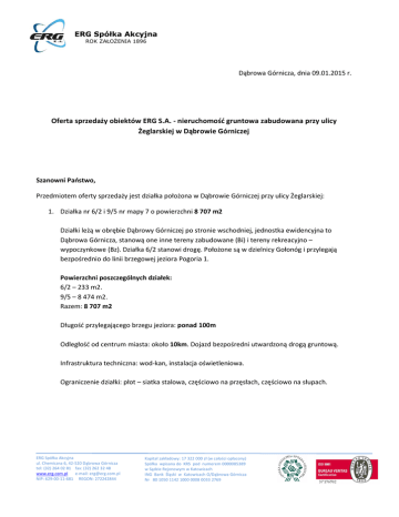 ERG Spółka Akcyjna ROK ZAŁOŻENIA 1896 Dąbrowa Górnicza, dnia 09.01.2015 r. Oferta sprzedaży obiektów ERG S.A. - nieruchomość gruntowa zabudowana przy ulicy Żeglarskiej w Dąbrowie Górniczej Szanowni Państwo, Przedmiotem oferty sprzedaży jest działka położona w Dąbrowie Górniczej przy ulicy Żeglarskiej: 1. Działka nr 6/2 i 9/5 nr mapy 7 o powierzchni 8 707 m2 Działki leżą w obrębie Dąbrowy Górniczej po stronie wschodniej, jednostka ewidencyjna to Dąbrowa Górnicza, stanową one inne tereny zabudowane (Bi) i tereny rekreacyjno – wypoczynkowe (Bz). Działka 6/2 stanowi drogę. Położone są w dzielnicy Gołonóg i przylegają bezpośrednio do linii brzegowej jeziora Pogoria 1. Powierzchni poszczególnych działek: 6/2 – 233 m2. 9/5 – 8 474 m2. Razem: 8 707 m2 Długość przylegającego brzegu jeziora: ponad 100m Odległość od centrum miasta: około 10km. Dojazd bezpośredni utwardzoną drogą gruntową. Infrastruktura techniczna: wod-kan, instalacja oświetleniowa. Ograniczenie działki: płot – siatka stalowa, częściowo na przęsłach, częściowo na słupach. ERG Spółka Akcyjna ul. Chemiczna 6, 42-520 Dąbrowa Górnicza tel: (32) 264 02 81 fax: (32) 262 32 48 www.erg.com.pl e-mail: [email protected] NIP: 629-00-11-681 REGON: 272242844 Kapitał zakładowy: 17 322 000 zł (w całości opłacony) Spółka wpisana do KRS pod numerem 0000085389 w Sądzie Rejonowym w Katowicach ING Bank Śląski w Katowicach O/Dąbrowa Górnicza Nr 80 1050 1142 1000 0008 0033 2769 ERG Spółka Akcyjna ROK ZAŁOŻENIA 1896 2. Budynki letniskowe i elementy wyposażenia: Budynki drewniane, rekreacyjne, na podmurówce typu TURBACZ. Powierzchnia użytkowa 37 m2, konstrukcja dwupoziomowa, z tarasem widokowym 25 m2. Domki całoroczne, ogrzewane kominkiem, ocieplone wełną mineralną o grubości 14cm. Konstrukcja drewniana. Układ pokoi dzieli je na: kuchnie, pokój dzienny, ubikację, oraz poddasze z sypialnią. 6 domków w pełni funkcjonalnych, 3 domki po demontażu nadbudowy drewnianej. Dodatkowo na działce znajdują się 2 podbudówki na domki typu Brda. Lokalizację działki i budynków przedstawia załączona mapka. Załączniki: - Mapka z lokalizacją działki i budynków Dodatkowe informacje i zdjęcia dostępne na życzenie. ERG Spółka Akcyjna ul. Chemiczna 6, 42-520 Dąbrowa Górnicza tel: (32) 264 02 81 fax: (32) 262 32 48 www.erg.com.pl e-mail: [email protected] NIP: 629-00-11-681 REGON: 272242844 Kapitał zakładowy: 17 322 000 zł (w całości opłacony) Spółka wpisana do KRS pod numerem 0000085389 w Sądzie Rejonowym w Katowicach ING Bank Śląski w Katowicach O/Dąbrowa Górnicza Nr 80 1050 1142 1000 0008 0033 2769