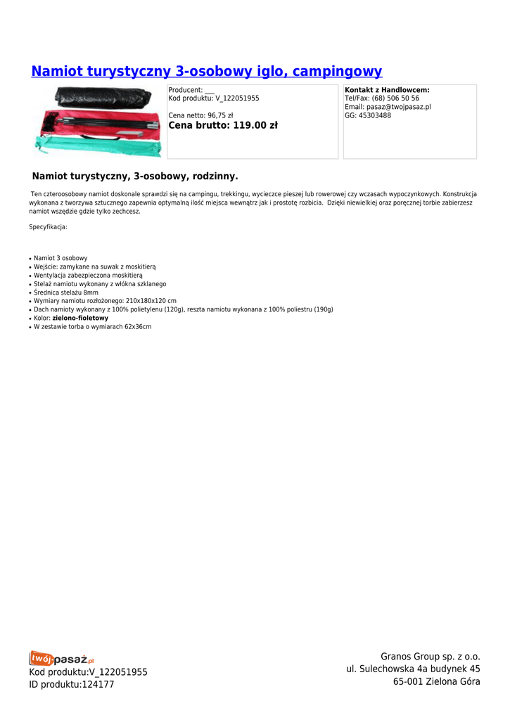 Namiot turystyczny 3-osobowy iglo, campingowy Producent: ___ Kod produktu: V_122051955 Cena netto: 96,75 zł Kontakt z Handlowcem: Tel/Fax: (68) 506 50 56 Email: [email protected] GG: 45303488 Cena brutto: 119.00 zł Namiot turystyczny, 3-osobowy, rodzinny. Ten czteroosobowy namiot doskonale sprawdzi się na campingu, trekkingu, wycieczce pieszej lub rowerowej czy wczasach wypoczynkowych. Konstrukcja wykonana z tworzywa sztucznego zapewnia optymalną ilość miejsca wewnątrz jak i prostotę rozbicia. Dzięki niewielkiej oraz poręcznej torbie zabierzesz namiot wszędzie gdzie tylko zechcesz. Specyfikacja: ● ● ● ● ● ● ● ● ● Namiot 3 osobowy Wejście: zamykane na suwak z moskitierą Wentylacja zabezpieczona moskitierą Stelaż namiotu wykonany z włókna szklanego Średnica stelażu 8mm Wymiary namiotu rozłożonego: 210x180x120 cm Dach namioty wykonany z 100% polietylenu (120g), reszta namiotu wykonana z 100% poliestru (190g) Kolor: zielono-fioletowy W zestawie torba o wymiarach 62x36cm Kod produktu:V_122051955 ID produktu:124177 Granos Group sp. z o.o. ul. Sulechowska 4a budynek 45 65-001 Zielona Góra