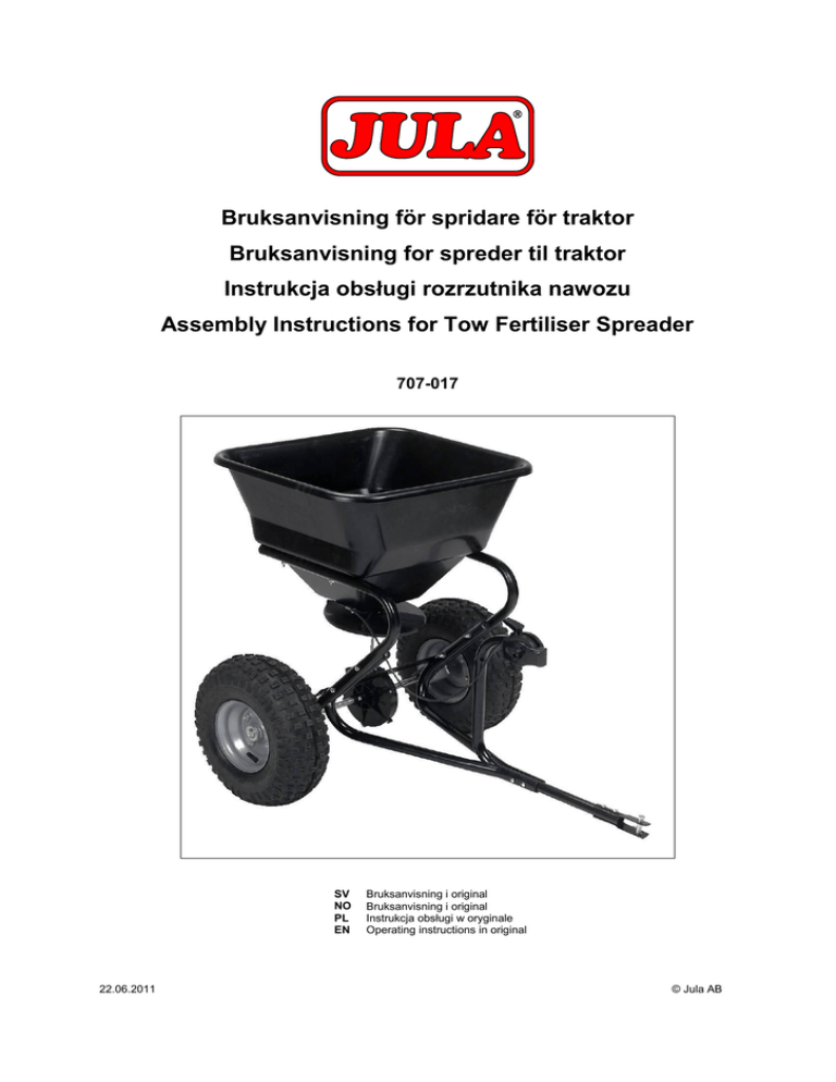 Bruksanvisning för spridare för traktor Bruksanvisning for spreder til traktor Instrukcja obsługi rozrzutnika nawozu Assembly Instructions for Tow Fertiliser Spreader 707-017 SV NO PL EN 22.06.2011 Bruksanvisning i original Bruksanvisning i original Instrukcja obsługi w oryginale Operating instructions in original © Jula AB SVENSKA SVENSK A SÄKERHETSANVISNINGAR Läs bruksanvisningen noggrant innan användning! Kärran får endast användas med trädgårdstraktor eller ATV. Kärran får inte köras på allmän väg. Smörj hjulaxel och lager regelbundet. Maxhastighet 8 km/h. BESKRIVNING 1. 2. 3. 4. 5. Horisontellt tvärstag Vagnskoppling Platt spridarstöd Axel och skovelhjul Ram 6. 7. 8. 9. 2 Axelfäste Spridartråg och flödesjustering Hjul Dragstång / handtag SVENSKA MONTERING Steg 1 Montera ihop dragstång, vagnskoppling och ram enligt bilden. Steg 2 Placera skovelaxeln i trågets botten. För in hjulaxeln genom axelfästenas hål. Skruva fast axelfästena i spridartråget. Axelfästenas böjda del ska vara riktad framåt, åt samma håll som wiren kommer ut ur spridartråget. Fäst de platta spridarstöden på axelfästena med spridartrågets främre bultar. Dra inte åt bultar och muttrar helt än! OBS! Ramens rör är välvda för att passa runt dragstången. Dra inte åt bultar och muttrar helt än! Steg 3 Montera ramen från steg ett på axelfästena från steg två. Montera även det horisontella tvärstaget (1). Montera matningsregulatorn på dragstången, se steg 4. Skjut in plastbussningarna på hjulaxeln och genom hålen i axelfästet (se steg 3A). Det ena hjulet monteras på axeln med en saxpinne. Det andra hjulet monteras med en bult. Dra åt alla bultar och muttrar! 3 SVENSKA Steg 4 Matningsregulator A Låsspak B Flödesjustering Med reservation för tryckfel och konstruktionsändringar som vi ej kan råda över. Vid eventuella problem, kontakta vår serviceavdelning på telefon: 0200-88 55 88. Jula AB, Box 363, 532 24 SKARA www.jula.se 4 NORSK NORSK SIKKERHETSANVISNINGER Les bruksanvisningen nøye før bruk! Transportvognen får kun benyttes med hagestraktor eller ATV. Transportvognen får ikke kjøres på alminnelig vei. Smør hjulakse og lag jevnlig. Makshastighet 8 km/t. BESKRIVELSE 1. 2. 3. 4. 5. Horisontalt tverrstag Vognkobling Flat sprederstøtte Aksel og skovlhjul Ramme 6. 7. 8. 9. 5 Akselfeste Sprederbeholder og mengdejustering Hjul Trekkstang / håndtak NORSK MONTERING Trinn 1 Monter sammen trekkstang, ramme som vist på bildet. vognkobling Trinn 2 Plasser skovlakselen i bunnen av beholderen. Stikk hjulakselen gjennom hullene på akselfestene. Skru fast akselfestene i sprederbeholderen. Den bøyde delen på akselfestene skal være rettet fremover i samme retning som wiren kommer ut av sprederbeholderen. Fest de flate sprederstøttene på akselfestene med de fremre boltene på sprederbeholderen. Ikke trekk skruene og mutrene helt til ennå! og OBS! Rammerørene er hvelvet slik at de passer rundt trekkstangen. Ikke trekk skruene og mutrene helt til ennå! Trinn 3 Monter rammen fra trinn 1 på akselfestene fra trinn 2. Monter det horisontale tverrstaget (1). Monter innstillingen for justering av vannmengde på trekkstangen. Sett plastbøssingene på hjulakselen og før dem gjennom hullene i akselfestet (se trinn 3A). Det ene hjulet monteres på akselen med en saksesplint. Det andre hjulet monteres med en bolt. Trekk til alle bolter og mutre! 6 NORSK Trinn 4 Materegulator A Låsespak B Mengdejustering Med forbehold om trykkfeil og konstruksjonsendringer utenfor vår kontroll. Ved eventuelle problemer, kontakt vår serviceavdeling på telefon 67 90 01 34. Jula Norge AS, Solheimsveien 6–8, 1471 LØRENSKOG www.jula.no 7 POLSKI POL SKI ZASADY BEZPIECZEŃSTWA Przed użyciem uważnie przeczytaj instrukcję obsługi! Przyczepy można używać wyłącznie z traktorami ogrodowymi lub quadami. Przyczepa nie może być używana na drogach publicznych. Regularnie smaruj oś i łożyska. Maksymalna szybkość 8 km/h. OPIS 1. 2. 3. 4. 5. Poprzeczka pozioma Złącze Płaski wspornik rozrzutnika Oś i koło łopatkowe Rama 6. 7. 8. 9. 8 Uchwyt osi Koryto rozrzutnika i regulacja strumienia Koło Dyszel/uchwyt POLSKI MONTAŻ Krok 1 Zmontuj razem dyszel, złącze i ramę według rysunku. Krok 2 Umieść oś koła łopatkowego w dnie koryta. Włóż oś koła przez otwory w uchwytach osi. Dokręć uchwyty do rozrzutnika. Zgięta część uchwytów osi powinna być skierowana do przodu, w kierunku, w którym wychodzą kable. Zamocuj płaskie wsporniki rozrzutnika na uchwytach osi za pomocą przednich śrub koryta. Nie dokręcaj jeszcze całkowicie śrub i nakrętek. UWAGA! Rurki ramy są wygięte, aby pasowały do dyszla. Nie dokręcaj jeszcze całkowicie śrub i nakrętek. Krok 3 Zamontuj ramę (krok 1) na uchwytach osi (krok 2). Zamontuj także poziomą poprzeczkę (1). Zamontuj regulator podajnika na dyszlu, patrz krok 4. Nałóż plastikowe tuleje na oś przez otwory w uchwytach osi (patrz krok 3A). Jedno koło jest montowane na osi za pomocą zawleczki. Drugie koło jest montowane za pomocą śruby. 9 POLSKI Dokręć wszystkie śruby i nakrętki Krok 4 Regulator podajnika A Dźwignia blokująca B Regulator strumienia Z zastrzeżeniem prawa do błędów w druku i zmian konstrukcyjnych, które są od nas niezależne. W razie ewentualnych problemów skontaktuj się telefonicznie z naszym działem obsługi klienta pod numerem: 801 600 500. Jula Poland Sp. z o.o., ul. Malborska 49, 03-286 Warszawa, Polska www.jula.pl 10 ENGLISH ENGLISH SAFETY INSTRUCTIONS Read these instructions carefully before use! The spreader must only be used with a garden tractor or ATV. The spreader must not be driven on public roads. Lubricate the wheel axle and bearings regularly. Max. speed 8 km/h DESCRIPTION 1. 2. 3. 4. 5. Horizontal crossbar Hitch bracket Flat support arms Axle and spinner Frame 6. 7. 8. 9. 11 Axle bracket Hopper and flow control Wheels Drawbar/handle ENGLISH ASSEMBLY Step 1 Assemb