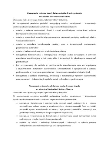 Wymagania wstępne kandydata na studia drugiego stopnia na kierunku Inżynieria Materiałowa Ukończone studia pierwszego stopnia, tytuł zawodowy inżyniera. W szczególności powinien posiadać następującą wiedzę, umiejętności i kompetencje społeczne określone efektami kształcenia na poziomie I stopnia studiów: • wiedzę z zakresu matematyki, fizyki i chemii umożliwiającą zrozumienie podstaw teoretycznych inżynierii materiałowej • wiedzę o materiałach umożliwiającą zrozumienie zależności pomiędzy strukturą i właściwościami materiałów • wiedzę o metodach kształtowania struktury oraz o technologiach wytwarzania, przetwórstwa materiałów • wiedzę o badaniu struktury oraz właściwości materiałów • umiejętność formułowania i rozwiązywania prostych zadań związanych z doborem materiałów umożliwiającą wybór materiałów i technologii do określonych zastosowań praktycznych • jest przygotowany do udziału w projektowaniu materiałowym oraz do współpracy z użytkownikami materiałów inżynierskich, konstruktorami i specjalistami z zakresu projektowania, wytwarzania, przetwórstwa i zastosowania materiałów inżynierskich • umiejętności z zakresu interpretacji, prezentacji i dokumentacji wyników eksperymentu oraz prezentacji i dokumentacji wyników zadań o charakterze projektowym Wymagania wstępne kandydata na studia drugiego stopnia na kierunku Mechanika i Budowa Maszyn Ukończone studia pierwszego stopnia, tytuł zawodowy inżyniera. W szczególności powinien posiadać następującą wiedzę, umiejętności i kompetencje społeczne określone efektami kształcenia na poziomie I stopnia studiów: • umiejętność formułowania i rozwiązywania prostych zadań projektowych z zakresu mechaniki oraz budowy maszyn w oparciu o wiedzę z zakresu matematyki, fizyki, mechaniki, mechaniki płynów, termodynamiki technicznej, wytrzymałości materiałów, konstrukcji oraz grafiki inżynierskiej potrzebnych do opisu zagadnień inżynierskich; • umiejętność wykorzystania do formułowania i rozwiązywania zadań inżynierskich metod analitycznych, symulacyjnych i eksperymentalnych; • wykazać się wiedzą z technologii informacyjnych i informatyki w zakresie podstaw funkcjonowania sprzętu komputerowego oraz oprogramowania; • potrafi dobierać i stosować: technologie wytwarzania, maszyny i urządzenia technologiczne do realizacji procesów produkcyjnych w oparciu o szczegółową wiedzę z zakresu technik wytwarzania, maszyn i urządzeń technologicznych, elektrotechniki i elektroniki, automatyki i robotyki oraz automatyzacji maszyn i procesów technologicznych; • potrafi dobierać materiały inżynierskie do zastosowań w mechanice i budowie maszyn na podstawie wiedzy z zakresu nauki o materiałach; • potrafi posługiwać się aparaturą pomiarową, metrologią warsztatową i metodami szacowania błędów pomiaru w oparciu o wiedzę z zakresu metrologii i systemów pomiarowych; • ma wiedzę w zakresie zarządzania, prowadzenia działalności gospodarczej, zna podstawy organizacji produkcji i zarządzania jakością oraz ma wiedzę w zakresie zarządzania środowiskiem; • posiada umiejętności interpretacji, prezentacji i dokumentacji wyników eksperymentu oraz prezentacji i dokumentacji wyników zadania o charakterze projektowym; • potrafi pozyskiwać informacje z literatury, baz danych oraz innych właściwie dobranych źródeł (także w języku obcym) w zakresie mechaniki i budowy maszyn oraz innych zagadnień inżynierskich i technicznych. Wymagania wstępne kandydata na studia na kierunku Mechatronika Ukończone studia I stopnia, tytuł zawodowy inżyniera. W szczególności powinien posiadać następującą wiedzę, umiejętności i kompetencje społeczne określone efektami kształcenia na poziomie I stopnia studiów: • umiejętność formułowania i rozwiązywania prostych zadań projektowych z zakresu mechaniki, automatyki i elektroniki, • umiejętność przeprowadzenia pomiarów, analizy, symulacji zaprojektowania prostych elementów i układów mechanicznych oraz elektronicznych, • umiejętność wykorzystania do formułowania i rozwiązywania zadań inżynierskich metod analitycznych, symulacyjnych i eksperymentalnych, • wiedza z zakresu mechaniki, elektrotechniki, elektroniki, automatyki, informatyki i metrologii warsztatowej, • wiedza na temat budowy i działania zautomatyzowanych maszyn technologicznych, a w szczególności stacji obróbczych, montażowych i robotów, • umiejętność projektowania układów automatyzacji, napędów elektrycznych i płynowych, stacji diagnostycznych i pomiarowych, • projektowanie urządzeń mechanicznych (tworzenie rysunków w CAD, dobór materiałów, obliczenia wytrzymałościowe, dobór elementów typowych, np.: napędów, przekładni, łożysk, śrub itp.), • znajomość technik wytwarzania w zakresie: odlewnictwa, obróbki cieplnej, ubytkowej i bezubytkowej, tworzyw sztucznych, łączenia elementów i montażu, • umiejętność programowania w języku C, • wiedza na temat budowy i umiejętność projektowania i programowania sterowników mikroprocesorowych, • umiejętność projektowania elektronicznych, analogowych układów pomiarowych i mocy, • umiejętność w zakresie użytkowania oprogramowania przeznaczonego do zastosowań inżynierskich typu CAx, • umiejętność programowania sterowników: przemysłowych (PLC) oraz robotów. Wymagania wstępne kandydata na studia drugiego stopnia na kierunku Zarządzanie i Inżynieria Produkcji Ukończone studia pierwszego stopnia, tytuł zawodowy inżyniera. W szczególności powinien posiadać następującą wiedzę, umiejętności i kompetencje społeczne określone efektami kształcenia na poziomie I stopnia studiów: • znajomość podstawowych technik wytwarzania z zakresu różnych technologii oraz umiejętność określenia obszaru zastosowania tych technologii w procesach wytwarz