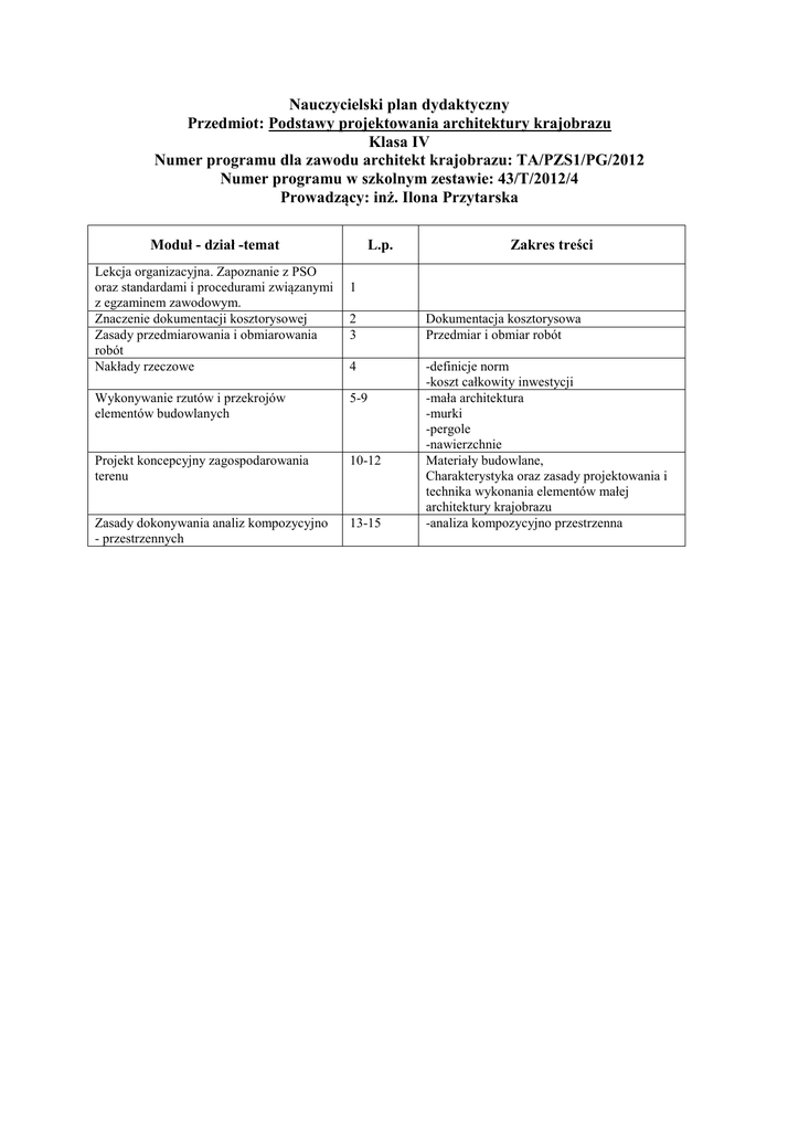 Nauczycielski plan dydaktyczny Przedmiot: Podstawy projektowania architektury krajobrazu Klasa IV Numer programu dla zawodu architekt krajobrazu: TA/PZS1/PG/2012 Numer programu w szkolnym zestawie: 43/T/2012/4 Prowadzący: inż. Ilona Przytarska Moduł - dział -temat Lekcja organizacyjna. Zapoznanie z PSO oraz standardami i procedurami związanymi z egzaminem zawodowym. Znaczenie dokumentacji kosztorysowej Zasady przedmiarowania i obmiarowania robót Nakłady rzeczowe L.p. Zakres treści 1 2 3 Dokumentacja kosztorysowa Przedmiar i obmiar robót 4 -definicje norm -koszt całkowity inwestycji -mała architektura -murki -pergole -nawierzchnie Materiały budowlane, Charakterystyka oraz zasady projektowania i technika wykonania elementów małej architektury krajobrazu -analiza kompozycyjno przestrzenna Wykonywanie rzutów i przekrojów elementów budowlanych 5-9 Projekt koncepcyjny zagospodarowania terenu 10-12 Zasady dokonywania analiz kompozycyjno - przestrzennych 13-15
