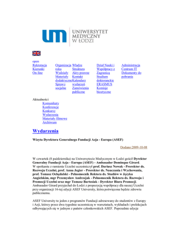 open Rekrutacja Kierunki On-line Organizacja Wladze roku Struktura Wydziały Akty prawne Materiały Kontakt dydaktyczneKalendarz Sprawy wydarzeń socjalne Zamówienia publiczne Dział Nauki i Współpracy z Zagranicą Studium doktoranckie ERASMUS Komisje bioetyczne Administracja Centrum IT Dokumenty do pobrania Aktualności Komunikaty Konferencje Konkursy Wydarzenia Materiały filmowe Archiwum Wydarzenia Wizyta Dyrektora Generalnego Fundacji Azja - Europa (ASEF) Dodano:2009-10-08 W czwartek (8 października) na Uniwersytecie Medycznym w Łodzi gościł Dyrektor Generalny Fundacji Azja - Europa (ASEF) - Ambasador Dominque Girard. W spotkaniu z ramienia Uczelni uczestniczył prof. Dariusz Nowak - Prorektor ds. Rozwoju Uczelni, prof. Anna Jegier - Prorektor ds. Nauczania i Wychowania, prof. Tomasz Ochędalski - Pełnomocnik Rektora ds. Studiów w Języku Angielskim, mgr Przemysław Andrzejak - Pełnomocnik Rektora ds. Rozwoju i Promocji Uczelni oraz mgr Tomasz Bartosiak - Dyrektor Biura Promocji. Ambasador Girard przyjechał do Łodzi z propozycją współpracy dla naszej Uczelni przy organizacji 16-tej edycji ASEF University, która poświęcona będzie zdrowiu publicznemu. ASEF University to jeden z programów Fundacji adresowany do studentów z Europy i Azji, którzy przez dwa tygodnie uczestniczą w warsztatach, wykładach i prelekcjach odbywających się w jednym z państw członkowskich ASEF. Poprzednie edycje programu miały miejsce m. in. w Korei, Hiszpanii, Niemczech, Japonii i Tajlandii. Polska edycja ASEF University ma odbyć się w Łodzi, w lipcu 2010 r., a Władze Uniwersytetu Medycznego wyraziły chęć współpracy z Fundacją przy organizacji tego projektu. Ambasador Girard podkreślał, że nasza Uczelnia została wybrana nie tylko ze względu na tematykę przyszłorocznej edycji, ale również ze względu na to, że projekt ten nigdy dotąd nie był realizowany w Europie Środkowo-Wschodniej. Fundacja Azja - Europa (ASEF, www.asef.org) z siedzibą w Singapurze, utworzona została w lutym 1997 r. w ramach dialogu europejsko-azjatyckiego ASEM (Asia Europe Meeting). Celem Fundacji jest promowanie kontaktów pomiędzy społeczeństwami Azji i Europy oraz rozwoju wzajemnego zrozumienia między obu kontynentami w obszarze wymiany kulturowej, intelektualnej i społecznej. Obecnie ASEF realizuje ok. 300 projektów, w których uczestniczy blisko 15 tys. Azjatów i Europejczyków. Działalność Fundacji finansowana jest ze składek krajów członkowskich, a także dobrowolnych wpłat instytucji prywatnych. Polska współpracuje z ASEF od 2002 r. BIP Wyszukaj Biblioteka UM Prasa Kontakt Kalendarz wydarzeń Proces Boloński Fundusze UE Projekt i wykonanie Serwisu [0.004019] © 2001- 2009 Biuro Promocji Uniwersytetu Medycznego
