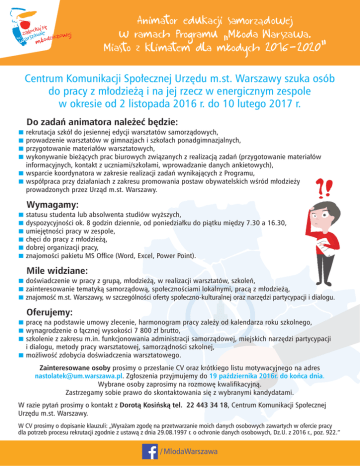 Centrum Komunikacji Społecznej Urzędu m.st. Warszawy szuka osób do pracy z młodzieżą i na jej rzecz w energicznym zespole w okresie od 2 listopada 2016 r. do 10 lutego 2017 r. Do zadań animatora należeć będzie: n rekrutacja szkół do jesiennej edycji warsztatów samorządowych, n prowadzenie warsztatów w gimnazjach i szkołach ponadgimnazjalnych, n przygotowanie materiałów warsztatowych, n wykonywanie bieżących prac biurowych związanych z realizacją zadań (przygotowanie materiałów informacyjnych, kontakt z uczniami/szkołami, wprowadzanie danych ankietowych), n wsparcie koordynatora w zakresie realizacji zadań wynikających z Programu, n współpraca przy działaniach z zakresu promowania postaw obywatelskich wśród młodzieży prowadzonych przez Urząd m.st. Warszawy. Wymagamy: n statusu studenta lub absolwenta studiów wyższych, n dyspozycyjności ok. 8 godzin dziennie, od poniedziałku do piątku między 7.30 a 16.30, n umiejętności pracy w zespole, n chęci do pracy z młodzieżą, n dobrej organizacji pracy, n znajomości pakietu MS Office (Word, Excel, Power Point). Mile widziane: n doświadczenie w pracy z grupą, młodzieżą, w realizacji warsztatów, szkoleń, n zainteresowanie tematyką samorządową, społecznościami lokalnymi, pracą z młodzieżą, n znajomość m.st. Warszawy, w szczególności oferty społeczno-kulturalnej oraz narzędzi partycypacji i dialogu. Oferujemy: n pracę na podstawie umowy zlecenie, harmonogram pracy zależy od kalendarza roku szkolnego, n wynagrodzenie o łącznej wysokości 7 800 zł brutto, n s zkolenie z zakresu m.in. funkcjonowania administracji samorządowej, miejskich narzędzi partycypacji i dialogu, metody pracy warsztatowej, samorządności szkolnej, n możliwość zdobycia doświadczenia warsztatowego. Zainteresowane osoby prosimy o przesłanie CV oraz krótkiego listu motywacyjnego na adres [email protected]. Zgłoszenia przyjmujemy do 19 października 2016r. do końca dnia. Wybrane osoby zaprosimy na rozmowę kwalifikacyjną. Zastrzegamy sobie prawo do skontaktowania się z wybranymi kandydatami. W razie pytań prosimy o kontakt z Dorotą Kosińską tel. 22 443 34 18, Centrum Komunikacji Społecznej Urzędu m.st. Warszawy. W CV prosimy o dopisanie klauzuli: „Wyrażam zgodę na przetwarzanie moich danych osobowych zawartych w ofercie pracy dla potrzeb procesu rekrutacji zgodnie z ustawą z dnia 29.08.1997 r. o ochronie danych osobowych, Dz.U. z 2016 r., poz. 922.” / MlodaWarszawa
