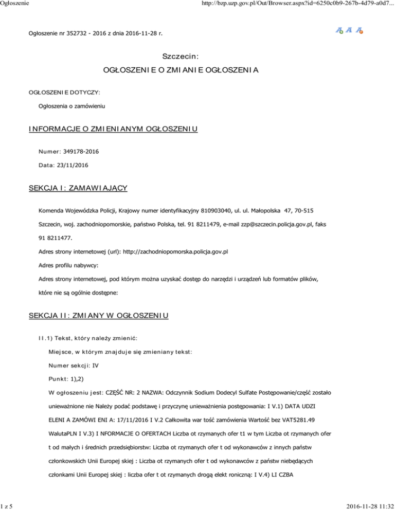 Ogłoszenie 1z5 http://bzp.uzp.gov.pl/Out/Browser.aspx?id=6250c0b9-267b-4d79-a0d7... Ogłoszenie nr 352732 - 2016 z dnia 2016-11-28 r. Szczecin: OGŁOSZENI E O ZMI ANI E OGŁOSZENI A OGŁOSZENI E DOTYCZY: Ogłoszenia o zamówieniu I NFORMACJE O ZMI ENI ANYM OGŁOSZENI U Nu m er : 349178-2016 Dat a: 23/11/2016 SEKCJA I : ZAMAWI AJĄCY Komenda Wojewódzka Policji, Krajowy numer identyfikacyjny 810903040, ul. ul. Małopolska 47, 70-515 Szczecin, woj. zachodniopomorskie, państwo Polska, tel. 91 8211479, e-mail [email protected], faks 91 8211477. Adres strony internetowej (url): http://zachodniopomorska.policja.gov.pl Adres profilu nabywcy: Adres strony internetowej, pod którym można uzyskać dostęp do narzędzi i urządzeń lub formatów plików, które nie są ogólnie dostępne: SEKCJA I I : ZMI ANY W OGŁOSZENI U I I .1) Tek st , k t ór y n ależy zm ien ić: Miej sce, w k t ór ym zn aj du j e się zm ien ian y t ek st : Nu m er sek cj i: IV Pu n k t : 1),2) W ogł oszen iu j est : CZĘŚĆ NR: 2 NAZWA: Odczynnik Sodium Dodecyl Sulfate Postępowanie/część zostało unieważnione nie Należy podać podstawę i przyczynę unieważnienia postępowania: I V.1) DATA UDZI ELENI A ZAMÓWI ENI A: 17/11/2016 I V.2 Całkowita war tość zamówienia Wartość bez VAT5281.49 WalutaPLN I V.3) I NFORMACJE O OFERTACH Liczba ot rzymanych ofer t1 w tym Liczba ot rzymanych ofer t od małych i średnich przedsiębiorstw: Liczba ot rzymanych ofer t od wykonawców z innych państw członkowskich Unii Europej skiej : Liczba ot rzymanych ofer t od wykonawców z państw niebędących członkami Unii Europej skiej : liczba ofer t ot rzymanych drogą elekt roniczną: I V.4) LI CZBA 2016-11-28 11:32 Ogłoszenie 2z5 http://bzp.uzp.gov.pl/Out/Browser.aspx?id=6250c0b9-267b-4d79-a0d7... ODRZUCONYCH OFERT: I V.5) NAZWA I ADRES WYKONAWCY, KTÓREMU UDZI ELONO ZAMÓWI ENI A Zamówienie zostało udzielone wykonawcom wspólnie ubiegającym się o udzielenie: nie VWR International p. z o.o., , ul. Limbowa 5, 80-175, Gdańsk, kraj/woj. pomorskie Wykonawca jest małym/średnim przedsiębiorcą: nie Wykonawca pochodzi z innego państwa członkowskiego Unii Europejskiej: nie Skrót literowy nazwy państwa: Wykonawca pochodzi z innego państwa nie będącego członkiem Unii Europejskiej: nie Skrót literowy nazwy państwa: , , , , , kraj/woj. Wykonawca jest małym/średnim przedsiębiorcą: nie Wykonawca pochodzi z innego państwa członkowskiego Unii Europejskiej: nie Skrót literowy nazwy państwa: Wykonawca pochodzi z innego państwa nie będącego członkiem Unii Europejskiej: nie Skrót literowy nazwy państwa: I V.6) I NFORMACJA O CENI E WYBRANEJ OFERTY/ WARTOŚCI ZAWARTEJ UMOWY ORAZ O OFERTACH Z NAJNI ŻSZĄ I NAJWYŻSZĄ CENĄ/ KOSZTEM Cena wybranej ofer ty/ war tość umowy 5281.49 Ofer ta z naj niższą ceną/ kosztem 5281.49 > Ofer ta z najwyższą ceną/ kosztem 5281.49 Waluta: PLN I V.7) I nformacj e na temat podwykonawstwa Wykonawca przewiduj e powierzenie wykonania części zamówienia podwykonawcy/ podwykonawcom War tość lub procentowa część zamówienia, j aka zostanie powierzona podwykonawcy lub podwykonawcom: I V.8) I nformacj e dodatkowe: CZĘŚĆ NR: 5 NAZWA: Odczynniki NARKO 2 Postępowanie/część zostało unieważnione nie Należy podać podstawę i przyczynę unieważnienia postępowania: I V.1) DATA UDZI ELENI A ZAMÓWI ENI A: 14/11/2016 I V.2 Całkowita war tość zamówienia War tość bez VAT8718.24 WalutaPLN I V.3) I NFORMACJE O OFERTACH Liczba ot rzymanych ofer t1 w tym Liczba ot rzymanych ofer t od małych i średnich przedsiębiorstw: Liczba ot rzymanych ofer t od wykonawców z innych państw członkowskich Unii Europej skiej : Liczba ot rzymanych ofer t od wykonawców z państw niebędących członkami Unii Europej skiej : liczba ofer t ot rzymanych drogą elekt roniczną: I V.4) LI CZBA ODRZUCONYCH OFERT: I V.5) NAZWA I ADRES WYKONAWCY, KTÓREMU UDZI ELONO ZAMÓWI ENI A Zamówienie zostało udzielone wykonawcom wspólnie ubiegającym się o udzielenie: nie TRANSFARM Sp. z o.o, , ul. Puławska 370, 02-819, Warszawa, kraj/woj. mazowieckie Wykonawca jest małym/średnim przedsiębiorcą: nie Wykonawca pochodzi z innego państwa członkowskiego Unii Europejskiej: nie Skrót literowy nazwy państwa: Wykonawca pochodzi z innego państwa nie będącego członkiem Unii Europejskiej: nie Skrót literowy nazwy państwa: I V.6) I NFORMACJA O CENI E WYBRANEJ OFERTY/ WARTOŚCI ZAWARTEJ UMOWY ORAZ O OFERTACH Z NAJNI ŻSZĄ I NAJWYŻSZĄ CENĄ/ KOSZTEM Cena wybranej ofer ty/ war tość umowy 8718.24 Ofer ta z naj niższą ceną/ kosztem 8718.24 > Ofer ta z najwyższą ceną/ kosztem 8718.24 Waluta: PLN I V.7) I nformacj e na temat podwykonawstwa Wykonawca przewiduj e powierzenie wykonania części zamówienia podwykonawcy/ podwykonawcom War tość lub procentowa część zamówienia, j aka zostanie powierzona podwykonawcy lub podwykonawcom: I V.8) I nformacj e dodatkowe: CZĘŚĆ NR: 6 NAZWA: Pakiety kryminalistyczne do zabezpieczenia śladów przestępstwa na tle seksualnym Postępowanie/część zostało unieważnione nie Należy podać podstawę i przyczynę unieważnienia postępowania: I V.1) DATA UDZI 2016-11-28 11:32 Ogłoszenie 3z5 http://bzp.uzp.gov.pl/Out/Browser.aspx?id=6250c0b9-267b-4d79-a0d7... ELENI A ZAMÓWI ENI A: 23/11/2016 I V.2 Całkowita war tość zamówienia War tość bez VAT22680.00 WalutaPL I V.3) I NFORMACJE O OFERTACH Liczba ot rzymanych ofer t1 w tym Liczba ot rzymanych ofer t od małych i średnich przedsiębiorstw: Liczba ot rzymanych ofer t od wykonawców z innych państw członkowskich Unii Europej skiej : Liczba ot rzymanych ofer t od wykonawców z państw niebędących członkami Unii Europej skiej : liczba ofer t ot rzymanych drogą elekt roniczną: Ogłoszenie http://bzp.uzp.gov.pl/Out/Browser.aspx?id=d3c56020-8a5d-4070-a780... 5 z 6 2016-11-23 09:16 I V.4) LI CZBA ODRZUCONYCH OFERT: I V.5) NAZWA I ADRES WYKONAWCY, KTÓREMU UDZI ELONO ZAMÓWI ENI A Zamówienie zo