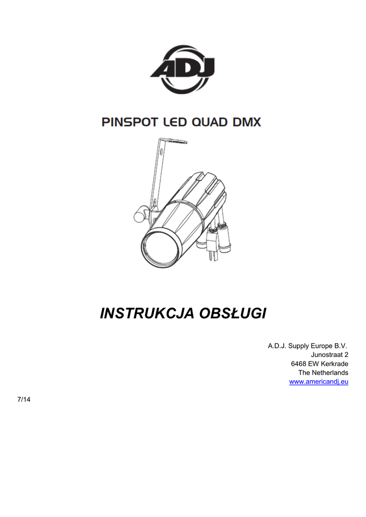 INSTRUKCJA OBSŁUGI A.D.J. Supply Europe B.V. Junostraat 2 6468 EW Kerkrade The Netherlands www.americandj.eu 7/14 ©2013 ADJ Products, LLC wszystkie prawa zastrzeżone. Informacje, specyfikacje, rysunki, zdjęcia oraz instrukcje zawarte w niniejszej instrukcji mogą ulec zmianie bez wcześniejszego powiadomienia. Produkty marki ADJ, logo LLC oraz nazwy i numery identyfikujące produkty opisane w niniejszym dokumencie stanowią znak handlowy ADJ Products, LLC. Zgłoszona ochrona praw autorskich obejmuje wszelkie formy i wszelkie kwestie dotyczące materiałów i informacji podlegających ochronie prawem autorskim, dozwolone obecnie przez obowiązujące ustawy bądź rozstrzygnięcia sądowe. Nazwy produktów użyte w niniejszym dokumencie mogą stanowić znaki towarowe bądź zarejestrowane znaki towarowe produkujących je spółek i zostają niniejszym prawnie uznane. Wszelkie marki oraz nazwy produktów nie pochodzące od ADJ Products, LLC, stanowią znaki towarowe lub zarejestrowane znaki towarowe odpowiednich, produkujących je spółek. ADJ Products, LLC oraz wszystkie powiązane z nią spółki wyłączają niniejszym wszelką swoją odpowiedzialność za szkody we własności, sprzęcie, budynkach lub szkody elektryczne, za obrażenia poniesione przez jakiekolwiek osoby, jak też za bezpośrednie lub pośrednie straty ekonomiczne związane z lub zależne od użycia jakichkolwiek informacji zawartych w niniejszym dokumencie, oraz/lub wynikłe z niewłaściwego, niebezpiecznego, niepełnego lub niestarannego montażu, instalacji, konfiguracji osprzętu oraz działania opisanych tutaj produktów. A.D.J. Supply Europe B.V. - www.americandj.eu - Pinspot LED Quad DMX Podręcznik Użytkownika Strona 2 Spis treści WSTĘP ..................................................................................................................................................................................... 4 INSTRUKCJE OGÓLNE .............................................................................................................................................................. 4 CHARAKTERYSTYKA ................................................................................................................................................................. 4 ŚRODKI BEZPIECZEŃSTWA ...................................................................................................................................................... 4 SET UP ..................................................................................................................................................................................... 5 OBSŁUGA URZĄDZENIA........................................................................................................................................................... 6 6 KANAŁOWY .......................................................................................................................................................................... 8 PILOT UC-IR ............................................................................................................................................................................. 8 CZYSZCZENIE ........................................................................................................................................................................... 8 SPECYFIKACJE .......................................................................................................................................................................... 9 ROHS - Ważny wkład w ochronę środowiska ....................................................................................................................... 10 WEEE – Utylizacja odpadów elektrycznych i elektronicznych .............................................................................................. 11 A.D.J. Supply Europe B.V. - www.americandj.eu - Pinspot LED Quad DMX Podręcznik Użytkownika Strona 3 INOZIONE WSTĘP Wypakowanie: Dziękujemy za zakup Pinspot LED Quad DMX firmy ADJ Products, LLC. KażdyPinspot LED Quad DMX został gruntownie przetestowany i wysłany w idealnym stanie. Należy dokładnie sprawdzić czy opakowanie nie posiada uszkodzeń powstałych w czasie transportu. Jeżeli opakowanie nosi ślady uszkodzeń, należy sprawdzić czy urządzenie nie jest uszkodzone oraz upewnić się czy towarzyszące mu wyposażenie konieczne do jego eksploatacji dotarło w stanie nienaruszonym. W razie stwierdzenia uszkodzeń lub braku części, należy skontaktować się z wsparciem klienta poprzez nasz bezpłatny numer. Prosimy o taki kontakt przed podjęciem decyzji o zwrocie urządzenia do sprzedawcy. WSTĘP Pinspot LED Quad DMXprodukcji ADJ jest kontynuacją wysiłków nad tworzeniem inteligentnego sprzętu oświetleniowego o wysokiej jakości. Pinspot LED Quad DMX jest inteligentnym urządzeniem DMX LED par o wysokiej wydajności. Urządzenie może być używane samodzielnie (Stand Alone), w konfiguracji Maaster/Slave. Urządzenie można także sterować kontrolerem DMX. Urządzenie Pinspot LED Quad DMX ma trzy tryby operacyjne: tryb reakcji na dźwięk (Sound Active Mode), tryb automatyczny (Auto Mode), oraz tryb sterowania sygnałem DMX. Obsługa klienta: W razie jakichkolwiek problemów, prosimy o kontakt z zaufanym punktem sprzedaży American Audio. Istnieje również możliwość bezpośredniego kontaktu z nami. Można to zrobić poprzez naszą stronę internetową www.americandj.eu oraz pisząc na adres: [email protected]. Ostrzeżenie! Aby zapobiec lub zmniejszyć ryzyko porażenia prądem lub pożaru, nie włączaj urządzenia w warunkach deszczowych lub przy podwyższonej wilgotności powietrza. Uwaga! Urządzenie nie zawiera żadnych elementów przeznaczonych do serwisowania przez użytkownika. Nie wolno podejmować prób samodzielnych napraw gdyż skutkuje to unieważnieniem gwarancji producenta. Jeżeli jakaś część wymaga napra