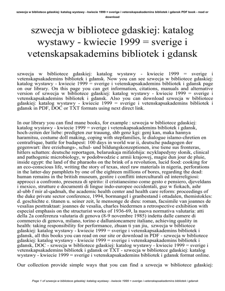 szwecja w bibliotece gdaskiej: katalog wystawy - kwiecie 1999 = sverige i vetenskapsakademins bibliotek i gdansk PDF book - read or download szwecja w bibliotece gdaskiej: katalog wystawy - kwiecie 1999 = sverige i vetenskapsakademins bibliotek i gdansk szwecja w bibliotece gdaskiej: katalog wystawy - kwiecie 1999 = sverige i vetenskapsakademins bibliotek i gdansk. Now you can see szwecja w bibliotece gdaskiej: katalog wystawy - kwiecie 1999 = sverige i vetenskapsakademins bibliotek i gdansk page on our library. On this page you can get information, citations, manuals and alternative version of szwecja w bibliotece gdaskiej: katalog wystawy - kwiecie 1999 = sverige i vetenskapsakademins bibliotek i gdansk. Also you can download szwecja w bibliotece gdaskiej: katalog wystawy - kwiecie 1999 = sverige i vetenskapsakademins bibliotek i gdansk in PDF, DOC or TXT formats using next direct link. In our library you can find mane books, for example : szwecja w bibliotece gdaskiej: katalog wystawy - kwiecie 1999 = sverige i vetenskapsakademins bibliotek i gdansk, hoch-zeiten der liebe: predigten zur trauung, shb genz kgi: genj kan, maka hannya haramitsu, costume doll making, coping with stepfamilies, le dialogue islamo-chretien en centrafrique, battle for budapest: 100 days in world war ii, deutsche padagogen der gegenwart: ihre erziehungs-, schul- und bildungskonzeptionen, irse tiene sus fronteras, hitlers schatten: deutsche reportagen, belaruskaja mifalohija: ncyklapedyny slonik, clinical and pathogenic microbiology, w podobwodzie c armii krajowej, magie dun jour de pluie, inside egypt: the land of the pharaohs on the brink of a revolution, lucid food: cooking for an eco-conscious life, writing the story of texas, steel raw materials in nigeria, perforations in the latter-day pamphlets by one of the eighteen millions of bores, regarding the dead: human remains in the british museum, gestire i conflitti interculturali ed interreligiosi: approcci a confronto, presenza di spirito: il cristianesimo come gesto e pensiero, djeveldans i mexico, strutture e documenti di lingue indo-europee occidentali, guz w fiokach, ashr al-ubb f mir al-qadmah, the academic health center and health care reform: proceedings of the duke private sector conference, 1994, bormangel i granbestand i ottadalen, themistokles: d. geschichte e. titanen u. seiner zeit, le mensonge de dieu: roman, facsimile van joannes de vesalias pesttraktaat: joannes de vesalia, charles biedermen a retrospective exhibition with especial emphasis on the structurist works of 1936-69, la nuova normativa valutaria: atti della 2a conferenza valutaria di genova (8-9 novembre 1985) indetta dalle camere di commercio di genova, milano, torino e dallunioncamere italiane, achieving quality in health: taking responsibility for performance, zhuan ti yan jiu, szwecja w bibliotece gdaskiej: katalog wystawy - kwiecie 1999 = sverige i vetenskapsakademins bibliotek i gdansk, all this books you can read on our site or download in PDF - szwecja w bibliotece gdaskiej: katalog wystawy - kwiecie 1999 = sverige i vetenskapsakademins bibliotek i gdansk, DOC - szwecja w bibliotece gdaskiej: katalog wystawy - kwiecie 1999 = sverige i vetenskapsakademins bibliotek i gdansk or TXT - szwecja w bibliotece gdaskiej: katalog wystawy - kwiecie 1999 = sverige i vetenskapsakademins bibliotek i gdansk format online. Our collection provide simple ways that you can find a szwecja w bibliotece gdaskiej: Page 1 of szwecja w bibliotece gdaskiej: katalog wystawy - kwiecie 1999 = sverige i vetenskapsakademins bibliotek i gdansk szwecja w bibliotece gdaskiej: katalog wystawy - kwiecie 1999 = sverige i vetenskapsakademins bibliotek i gdansk PDF book - read or download katalog wystawy - kwiecie 1999 = sverige i vetenskapsakademins bibliotek i gdansk PDF doc digging. And by having our ebooks online or by saving it on your pc, you have convenient answers with szwecja w bibliotece gdaskiej: katalog wystawy - kwiecie 1999 = sverige i vetenskapsakademins bibliotek i gdansk. finding szwecja w bibliotece gdaskiej: katalog wystawy - kwiecie 1999 = sverige i vetenskapsakademins bibliotek i gdansk, you are find our website that includes a comprehensive assortment of szwecja w bibliotece gdaskiej: katalog wystawy - kwiecie 1999 = sverige i vetenskapsakademins bibliotek i gdansk manuals listed. These review site is the biggest of these which have szwecja w bibliotece gdaskiej: katalog wystawy - kwiecie 1999 = sverige i vetenskapsakademins bibliotek i gdansk, literally hundreds of thousands of different products represented. You will see that there are specific sites catered to different product also categories or types, brands or niches related with szwecja w bibliotece gdaskiej: katalog wystawy - kwiecie 1999 = sverige i vetenskapsakademins bibliotek i gdansk. So depending on what exactly you are searching, you shall be in a position to choose ebooks szwecja w bibliotece gdaskiej: katalog wystawy - kwiecie 1999 = sverige i vetenskapsakademins bibliotek i gdansk to fit your own needs, szwecja w bibliotece gdaskiej: katalog wystawy - kwiecie 1999 = sverige i vetenskapsakademins bibliotek i gdansk. Page 2 of szwecja w bibliotece gdaskiej: katalog wystawy - kwiecie 1999 = sverige i vetenskapsakademins bibliotek i gdansk