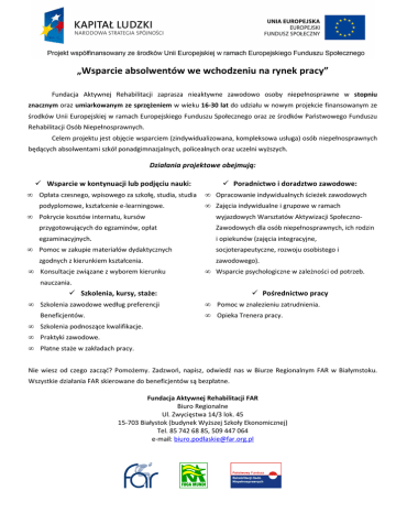 „Wsparcie absolwentów we wchodzeniu na rynek pracy” Fundacja Aktywnej Rehabilitacji zaprasza nieaktywne zawodowo osoby niepełnosprawne w stopniu znacznym oraz umiarkowanym ze sprzężeniem w wieku 16-30 lat do udziału w nowym projekcie finansowanym ze środków Unii Europejskiej w ramach Europejskiego Funduszu Społecznego oraz ze środków Państwowego Funduszu Rehabilitacji Osób Niepełnosprawnych. Celem projektu jest objęcie wsparciem (zindywidualizowana, kompleksowa usługa) osób niepełnosprawnych będących absolwentami szkół ponadgimnazjalnych, policealnych oraz uczelni wyższych. Działania projektowe obejmują: Wsparcie w kontynuacji lub podjęciu nauki: • • • • Poradnictwo i doradztwo zawodowe: Opłata czesnego, wpisowego za szkołę, studia, studia • Opracowanie indywidualnych ścieżek zawodowych podyplomowe, kształcenie e-learningowe. • Zajęcia indywidualne i grupowe w ramach Pokrycie kosztów internatu, kursów wyjazdowych Warsztatów Aktywizacji Społeczno- przygotowujących do egzaminów, opłat Zawodowych dla osób niepełnosprawnych, ich rodzin egzaminacyjnych. i opiekunów (zajęcia integracyjne, Pomoc w zakupie materiałów dydaktycznych socjoterapeutyczne, rozwoju osobistego i zgodnych z kierunkiem kształcenia. zawodowego). Konsultacje związane z wyborem kierunku • Wsparcie psychologiczne w zależności od potrzeb. nauczania. Szkolenia, kursy, staże: • Szkolenia zawodowe według preferencji Beneficjentów. • Szkolenia podnoszące kwalifikacje. • • Praktyki zawodowe. Pośrednictwo pracy • • Pomoc w znalezieniu zatrudnienia. Opieka Trenera pracy. Płatne staże w zakładach pracy. Nie wiesz od czego zacząć? Pomożemy. Zadzwoń, napisz, odwiedź nas w Biurze Regionalnym FAR w Białymstoku. Wszystkie działania FAR skierowane do beneficjentów są bezpłatne. Fundacja Aktywnej Rehabilitacji FAR Biuro Regionalne Ul. Zwycięstwa 14/3 lok. 45 15-703 Białystok (budynek Wyższej Szkoły Ekonomicznej) Tel. 85 742 68 85, 509 447 064 e-mail: [email protected]