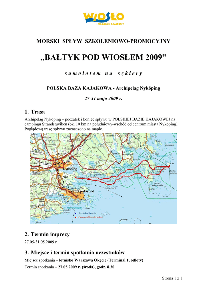 MORSKI SPŁYW SZKOLENIOWO-PROMOCYJNY „BAŁTYK POD WIOSŁEM 2009” samolotem na szkiery POLSKA BAZA KAJAKOWA - Archipelag Nyköping 27-31 maja 2009 r. 1. Trasa Archipelag Nyköping – początek i koniec spływu w POLSKIEJ BAZIE KAJAKOWEJ na campingu Strandstuviken (ok. 10 km na południowy-wschód od centrum miasta Nyköping). Poglądową trasę spływu zaznaczono na mapie. 2. Termin imprezy 27.05-31.05.2009 r. 3. Miejsce i termin spotkania uczestników Miejsce spotkania – lotnisko Warszawa Okęcie (Terminal 1, odloty) Termin spotkania – 27.05.2009 r. (środa), godz. 8.30. Strona 1 z 1 4. Cel • • • • • Szkolenie z kajakarstwa morskiego ze szczególnym uwzględnieniem aspektów bezpieczeństwa i nawigacji. Promocja i propagowanie kajakarstwa morskiego oraz czynnego wypoczynku. Poznanie uroków szwedzkich szkierów. Integracja środowiska polskich kajakarzy morskich w celu organizacji wspólnych wypraw. Testy sprzętu. 5. Organizator spływu Po stronie szwedzkiej: Grzegorz Rózik Po stronie polskiej: Adam Biedrzycki i Adam Grzegorzewski Redakcja Magazynu Kajakowego WIOSŁO ul. Samsonowicza 2 25-564 Kielce tel. 041-362-78-38 www.szkiery.pl e-mail: [email protected] 6. Warunki uczestnictwa • • • • • Umiejętność pływania kajakiem po wodach nizinnych (nie jest wymagane wcześniejsze pływanie kajakiem po morzu). Umiejętność pływania wpław. Doświadczenie turystyczno-biwakowe. Posiadanie obowiązkowego wyposażenia. Pozytywna weryfikacja, wykupienie biletu lotniczego oraz uiszczenie wpisowego. 7. Koszty uczestnictwa i wykupienie biletów lotniczych 790 zł – wpisowe od osoby (płatne przelewem). Kwota wpisowego obejmuje: wypożyczenie morskiego kajaka jednoosobowego z wiosłem, fartuchem i kamizelką asekuracyjną (5 dni – od środy do niedzieli), transport uczestników z lotniska Sztokholm-Skavsta na camping Strandstuviken (ok. 20 km) i z powrotem, dwa noclegi na campingu Stranstuviken w namiocie z możliwością korzystania z komfortowo wyposażonej kuchni i łazienek, prowadzenie szkoleń z kajakarstwa morskiego, opiekę doświadczonego instruktora w kajakarstwie morskim, przygotowanie dla każdego uczestnika map w skali 1:50 000, skorzystanie z sauny, formalności itp. Ceny wypożyczenia kajaków w Szwecji znacząco odbiegają od cen w Polsce. Dla porównania cena wypożyczenia morskiego kajaka jednoosobowego (bez transportu) w okolicach Nyköping za jeden dzień wynosi 250 SEK, czyli 95 zł (np. w firmie Hälgö Kajakkafé, http://www.paddling.se). Kurs: 1 SEK – ok. 0.38 PLN Wpisowe należy wpłacać na podany rachunek bankowy po potwierdzeniu u organizatora wstępnej weryfikacji uczestnictwa (wówczas należy również wykupić bilet lotniczy we własnym zakresie). Strona 2 z 2 Ze względu na ograniczoną ilość miejsc (11 osób maksimum wraz z kadrą) organizator prowadzi dwie listy – podstawową i rezerwową. Wszystkie osoby z listy podstawowej proszone są o wykupienie biletów lotniczych i wpłatę wpisowego do dnia 30 kwietnia 2009 r. Po tym terminie zostanie odblokowana lista rezerwowa. Dane do przelewu (tylko wpisowe): Magazyn Kajakowy WIOSŁO ul. Samsonowicza 2, Kielce nr rach.: 50 10205558 1111144404300088 tytuł przelewu: BPW 2009 – imię, nazwisko Bilety lotnicze Linie lotnicze Wizz Air. Rezerwacja i wykupienie biletów przez Internet. Adres strony: http://www.wizzair.com Na dzień 16.04.2009 r. koszt przelotu w jedną stronę wynosił 39 zł. Cena ta może ulec zmianie. Im wcześniej wykupimy bilet tym mamy lepszą ceną. Należy również pamiętać o wykupieniu dodatkowego bagażu w obie strony (20 kg). Poniżej załączona jest rezerwacja wykupiona dla organizatorów z Polski: Przelot Numer Lotu Wylot z Data wylotu Przylot do Data przylotu W6 425 Warsaw Śr 27 Maj 09 10:10 Sztokholm - Skavsta Śr 27 Maj 09 11:40 W6 426 Sztokholm - Skavsta Nd 31 Maj 09 12:05 Warsaw Nd 31 Maj 09 13:35 Uczestnicy powinni wykupić bilet dokładnie na powyższe przeloty. W razie trudności z rezerwacją prosimy o kontakt. 8. Skrócony program spływu 27 maja, środa godz. 8.30 – zbiórka uczestników na lotnisku Warszawa Okęcie (Terminal 1, odloty) godz. 10.10 – odlot samolotu WIZZ AIR (lot W6 425) na lotnisko Sztokholm-Skavsta godz. 11.40 – przylot samolotu na lotnisko Sztokholm-Skavsta Po przylocie transport uczestników na camping Strandstuviken. O godzinie 15.00 rozpoczęcie szkolenia (praktyczne na płytkiej zatoce i teoretyczne w sali konferencyjnej wraz z filmem szkoleniowym). 28-30 maja, czwartek-sobota Płyniecie w formie pętli na Archipelagu Nyköping z noclegami na wyspach (pełne 3 dni). Podczas płynięcia przewidziano dalsze szkolenia z kajakarstwa morskiego ze szczególnym uwzględnieniem aspektów bezpieczeństwa i nawigacji. W planach jest również dokładniejsza eksploracja Rezerwatu Przyrody Stendorrens (nazwa pochodzi od „stone door”, czyli kamiennych drzwi – przejścia, które umożliwiało statkom dostanie się na spokojne wody przy silnych sztormach). W sobotę wieczorem gorąca sauna na campingu Strandstuviken. 31 maja, niedziela Zakończenie spływu, zdanie sprzętu, transport uczestników na lotnisko Sztokholm-Skavsta. godz. 10.45 – zbiórka uczestników na lotnisku Sztokholm-Skavsta godz. 12.05 – odlot samolotu WIZZ AIR (lot W6 426) na lotnisko Warszawa Okęcie godz. 13.35 – przylot samolotu na lotnisko Warszawa Okęcie Strona 3 z 3 9. • • • • • • • • Wyposażenie obowiązkowe uczestnika: telefon komórkowy z obudową wodoszczelną i aktywnym roamingiem, gwizdek, kompas płaski (umożliwiający jednoczesne posługiwanie się mapą), mapnik wodoszczelny formatu min. A4, sprzęt biwakowy (namiot, śpiwór itp.), żywność na czas trwania spływu, kurtka chroniąca od wiatru i deszczu, okrycie głowy (ochrona przed słońcem). 10. Wyposażenie dodatkowe uczestnika: • • • • • • • • • • • • • • • • • własna, dopasowana kamizelka asekuracyjna (mimo, że kam