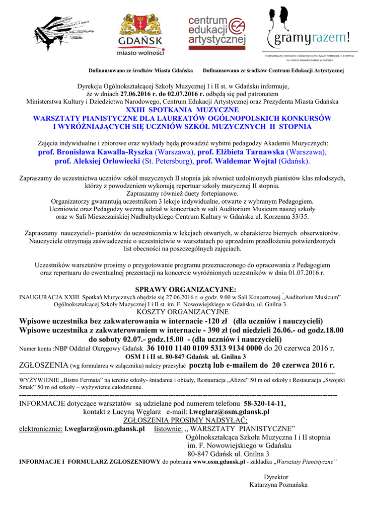 Dofinansowano ze środków Miasta Gdańska Dofinansowano ze środków Centrum Edukacji Artystycznej Dyrekcja Ogólnokształcącej Szkoły Muzycznej I i II st. w Gdańsku informuje, że w dniach 27.06.2016 r. do 02.07.2016 r. odbędą się pod patronatem Ministerstwa Kultury i Dziedzictwa Narodowego, Centrum Edukacji Artystycznej oraz Prezydenta Miasta Gdańska XXIII SPOTKANIA MUZYCZNE WARSZTATY PIANISTYCZNE DLA LAUREATÓW OGÓLNOPOLSKICH KONKURSÓW I WYRÓŻNIAJĄCYCH SIĘ UCZNIÓW SZKÓŁ MUZYCZNYCH II STOPNIA Zajęcia indywidualne i zbiorowe oraz wykłady będą prowadzić wybitni pedagodzy Akademii Muzycznych: prof. Bronisława Kawalla-Ryszka (Warszawa), prof. Elżbieta Tarnawska (Warszawa), prof. Aleksiej Orłowiecki (St. Petersburg), prof. Waldemar Wojtal (Gdańsk). Zapraszamy do uczestnictwa uczniów szkół muzycznych II stopnia jak również uzdolnionych pianistów klas młodszych, którzy z powodzeniem wykonują repertuar szkoły muzycznej II stopnia. Zapraszamy również duety fortepianowe. Organizatorzy gwarantują uczestnikom 3 lekcje indywidualne, otwarte z wybranym Pedagogiem. Uczniowie oraz Pedagodzy wezmą udział w koncertach w sali Auditorium Musicum naszej szkoły oraz w Sali Mieszczańskiej Nadbałtyckiego Centrum Kultury w Gdańsku ul. Korzenna 33/35. Zapraszamy nauczycieli- pianistów do uczestniczenia w lekcjach otwartych, w charakterze biernych obserwatorów. Nauczyciele otrzymają zaświadczenie o uczestnictwie w warsztatach po uprzednim przedłożeniu potwierdzonych list obecności na poszczególnych zajęciach. Uczestników warsztatów prosimy o przygotowanie programu przeznaczonego do opracowania z Pedagogiem oraz repertuaru do ewentualnej prezentacji na koncercie wyróżnionych uczestników w dniu 01.07.2016 r. SPRAWY ORGANIZACYJNE: INAUGURACJA XXIII Spotkań Muzycznych obędzie się 27.06.2016 r. o godz. 9.00 w Sali Koncertowej „Auditorium Musicum” Ogólnokształcącej Szkoły Muzycznej I i II st. im. F. Nowowiejskiego w Gdańsku, ul. Gnilna 3. KOSZTY ORGANIZACYJNE Wpisowe uczestnika bez zakwaterowania w internacie -120 zł (dla uczniów i nauczycieli) Wpisowe uczestnika z zakwaterowaniem w internacie - 390 zł (od niedzieli 26.06.- od godz.18.00 do soboty 02.07.- godz.15.00 - (dla uczniów i nauczycieli) Numer konta :NBP Oddział Okręgowy Gdańsk 36 1010 1140 0109 5313 9134 0000 do 20 czerwca 2016 r. OSM I i II st. 80-847 Gdańsk ul. Gnilna 3 ZGŁOSZENIA (wg formularza w załączniku) należy przesyłać pocztą lub e-mailem do 20 czerwca 2016 r. ----------------------------------------------------------------------------------------------------------------------------- -----------------------------WYŻYWIENIE „Bistro Fermata” na terenie szkoły- śniadania i obiady, Restauracja „Alizze” 50 m od szkoły i Restauracja „Swojski Smak” 50 m od szkoły – wyżywienie całodzienne. ---------------------------------------------------------------------------------------------------------------------------------INFORMACJE dotyczące warsztatów są udzielane pod numerem telefonu 58-320-14-11, kontakt z Lucyną Węglarz e-mail: [email protected] ZGŁOSZENIA PROSIMY NADSYŁAĆ: elektronicznie: [email protected] listownie: „ WARSZTATY PIANISTYCZNE” Ogólnokształcąca Szkoła Muzyczna I i II stopnia im. F. Nowowiejskiego w Gdańsku 80-847 Gdańsk ul. Gnilna 3 INFORMACJE I FORMULARZ ZGŁOSZENIOWY do pobrania www.osm.gdansk.pl - zakładka „Warsztaty Pianistyczne” Dyrektor Katarzyna Poznańska
