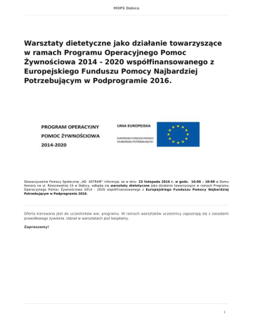 MOPS Dębica Warsztaty dietetyczne jako działanie towarzyszące w ramach Programu Operacyjnego Pomoc Żywnościowa 2014 - 2020 współfinansowanego z Europejskiego Funduszu Pomocy Najbardziej Potrzebującym w Podprogramie 2016. Stowarzyszenie Pomocy Społecznej „AD ASTRAM” informuje, że w dniu 23 listopada 2016 r. w godz. 16:00 – 18:00 w Domu Seniora na ul. Rzeszowskiej 15 w Dębicy, odbędą się warsztaty dietetyczne jako działanie towarzyszące w ramach Programu Operacyjnego Pomoc Żywnościowa 2014 - 2020 współfinansowanego z Europejskiego Funduszu Pomocy Najbardziej Potrzebującym w Podprogramie 2016. Oferta kierowana jest do uczestników ww. programu. W ramach warsztatów uczestnicy zapoznają się z zasadami prawidłowego żywienia. Udział w warsztatach jest bezpłatny. Zapraszamy! 1