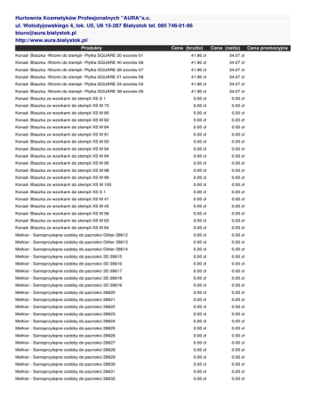 Hurtownia Kosmetyków Profesjonalnych "AURA"s.c. ul. Wołodyjowskiego 4, lok. U5, U6 15-287 Białystok tel. 085 746-01-86 [email protected] http://www.aura.bialystok.pl/ Produkty Cena (brutto) Cena (netto) Konad- Blaszka -Wzorki do stempli- Płytka SQUARE 20 wzorów 01 41.90 zł 34.07 zł Konad- Blaszka -Wzorki do stempli- Płytka SQUARE 40 wzorów 06 41.90 zł 34.07 zł Konad- Blaszka -Wzorki do stempli- Płytka SQUARE 28 wzorów 07 41.90 zł 34.07 zł Konad- Blaszka -Wzorki do stempli- Płytka SQUARE 21 wzorów 08 41.90 zł 34.07 zł Konad- Blaszka -Wzorki do stempli- Płytka SQUARE 34 wzorów 03 41.90 zł 34.07 zł Konad- Blaszka -Wzorki do stempli- Płytka SQUARE 38 wzorów 05 41.90 zł 34.07 zł Konad- Blaszka ze wzorkami do stempli XS S 1 0.00 zł 0.00 zł Konad- Blaszka ze wzorkami do stempli XS M 73 0.00 zł 0.00 zł Konad- Blaszka ze wzorkami do stempli XS M 80 0.00 zł 0.00 zł Konad- Blaszka ze wzorkami do stempli XS M 82 0.00 zł 0.00 zł Konad- Blaszka ze wzorkami do stempli XS M 84 0.00 zł 0.00 zł Konad- Blaszka ze wzorkami do stempli XS M 91 0.00 zł 0.00 zł Konad- Blaszka ze wzorkami do stempli XS M 93 0.00 zł 0.00 zł Konad- Blaszka ze wzorkami do stempli XS M 94 0.00 zł 0.00 zł Konad- Blaszka ze wzorkami do stempli XS M 94 0.00 zł 0.00 zł Konad- Blaszka ze wzorkami do stempli XS M 95 0.00 zł 0.00 zł Konad- Blaszka ze wzorkami do stempli XS M 98 0.00 zł 0.00 zł Konad- Blaszka ze wzorkami do stempli XS M 99 0.00 zł 0.00 zł Konad- Blaszka ze wzorkami do stempli XS M 100 0.00 zł 0.00 zł Konad- Blaszka ze wzorkami do stempli XS S 1 0.00 zł 0.00 zł Konad- Blaszka ze wzorkami do stempli XS M 41 0.00 zł 0.00 zł Konad- Blaszka ze wzorkami do stempli XS M 45 0.00 zł 0.00 zł Konad- Blaszka ze wzorkami do stempli XS M 56 0.00 zł 0.00 zł Konad- Blaszka ze wzorkami do stempli XS M 63 0.00 zł 0.00 zł Konad- Blaszka ze wzorkami do stempli XS M 64 0.00 zł 0.00 zł Melkior - Samoprzylepne ozdoby do paznokci Glitter 28612 0.00 zł 0.00 zł Melkior - Samoprzylepne ozdoby do paznokci Glitter 28613 0.00 zł 0.00 zł Melkior - Samoprzylepne ozdoby do paznokci Glitter 28614 0.00 zł 0.00 zł Melkior - Samoprzylepne ozdoby do paznokci 3D 28615 0.00 zł 0.00 zł Melkior - Samoprzylepne ozdoby do paznokci 3D 28616 0.00 zł 0.00 zł Melkior - Samoprzylepne ozdoby do paznokci 3D 28617 0.00 zł 0.00 zł Melkior - Samoprzylepne ozdoby do paznokci 3D 28618 0.00 zł 0.00 zł Melkior - Samoprzylepne ozdoby do paznokci 3D 28619 0.00 zł 0.00 zł Melkior - Samoprzylepne ozdoby do paznokci 28620 0.00 zł 0.00 zł Melkior - Samoprzylepne ozdoby do paznokci 28621 0.00 zł 0.00 zł Melkior - Samoprzylepne ozdoby do paznokci 28622 0.00 zł 0.00 zł Melkior - Samoprzylepne ozdoby do paznokci 28623 0.00 zł 0.00 zł Melkior - Samoprzylepne ozdoby do paznokci 28624 0.00 zł 0.00 zł Melkior - Samoprzylepne ozdoby do paznokci 28625 0.00 zł 0.00 zł Melkior - Samoprzylepne ozdoby do paznokci 28626 0.00 zł 0.00 zł Melkior - Samoprzylepne ozdoby do paznokci 28627 0.00 zł 0.00 zł Melkior - Samoprzylepne ozdoby do paznokci 28628 0.00 zł 0.00 zł Melkior - Samoprzylepne ozdoby do paznokci 28629 0.00 zł 0.00 zł Melkior - Samoprzylepne ozdoby do paznokci 28630 0.00 zł 0.00 zł Melkior - Samoprzylepne ozdoby do paznokci 28631 0.00 zł 0.00 zł Melkior - Samoprzylepne ozdoby do paznokci 28632 0.00 zł 0.00 zł Cena promocyjna Melkior - Samoprzylepne ozdoby do paznokci 28633 0.00 zł 0.00 zł Melkior - Samoprzylepne ozdoby do paznokci 28634 0.00 zł 0.00 zł Melkior - Samoprzylepne ozdoby do paznokci 28635 0.00 zł 0.00 zł Melkior - Samoprzylepne ozdoby do paznokci 28636 0.00 zł 0.00 zł Melkior - Samoprzylepne ozdoby do paznokci 28637 0.00 zł 0.00 zł Melkior - Samoprzylepne ozdoby do paznokci 28638 0.00 zł 0.00 zł Melkior - Samoprzylepne ozdoby do paznokci 28639 0.00 zł 0.00 zł Melkior - Samoprzylepne ozdoby do paznokci 28640 0.00 zł 0.00 zł Melkior - Samoprzylepne ozdoby do paznokci Water 28642 0.00 zł 0.00 zł Melkior - Samoprzylepne ozdoby do paznokci Water 28643 0.00 zł 0.00 zł Melkior - Samoprzylepne ozdoby do paznokci Water 28644 0.00 zł 0.00 zł Melkior - Samoprzylepne ozdoby do paznokci Water 28646 0.00 zł 0.00 zł Melkior - Samoprzylepne ozdoby do paznokci Water 28648 0.00 zł 0.00 zł Melkior - Samoprzylepne ozdoby do paznokci Water 28650 0.00 zł 0.00 zł Swarovski - Crystal Pixie - Deluxe Rush - perełki i kryształki 119.00 zł 96.75 zł Swarovski - Crystal Pixie - Rock Shock - perełki i kryształki 119.00 zł 96.75 zł Swarovski - Crystal Pixie - Cute Mood - perełki i kryształki 119.00 zł 96.75 zł Swarovski - Crystal Pixie - Classy Sassy - perełki i kryształki 119.00 zł 96.75 zł