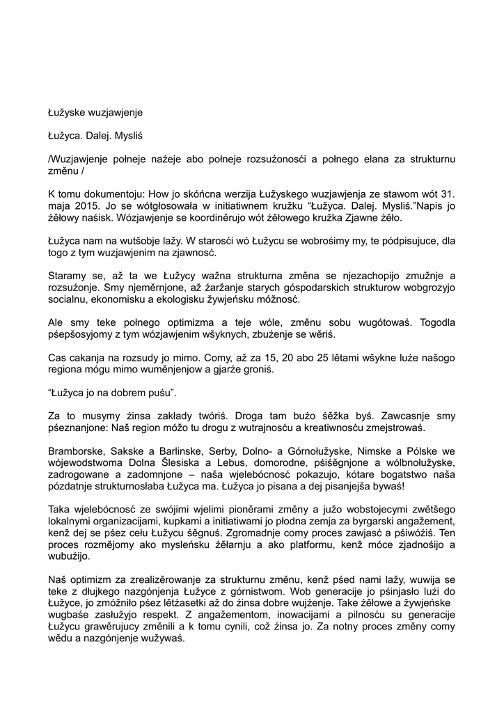 Łužyske wuzjawjenje Łužyca. Dalej. Mysliś /Wuzjawjenje połneje naźeje abo połneje rozsuźonosći a połnego elana za strukturnu změnu / K tomu dokumentoju: How jo skóńcna werzija Łužyskego wuzjawjenja ze stawom wót 31. maja 2015. Jo se wótgłosowała w initiatiwnem kružku “Łužyca. Dalej. Mysliś.”Napis jo źěłowy naśisk. Wózjawjenje se koordiněrujo wót źěłowego kružka Zjawne źěło. Łužyca nam na wutšobje lažy. W starosći wó Łužycu se wobrośimy my, te pódpisujuce, dla togo z tym wuzjawjenim na zjawnosć. Staramy se, až ta we Łužycy wažna strukturna změna se njezachopijo zmužnje a rozsuźonje. Smy njeměrnjone, až źaržanje starych góspodarskich strukturow wobgrozyjo socialnu, ekonomisku a ekologisku žywjeńsku móžnosć. Ale smy teke połnego optimizma a teje wóle, změnu sobu wugótowaś. Togodla pśepšosyjomy z tym wózjawjenim wšyknych, zbuźenje se wěriś. Cas cakanja na rozsudy jo mimo. Comy, až za 15, 20 abo 25 lětami wšykne luźe našogo regiona mógu mimo wuměnjenjow a gjarźe groniś. “Łužyca jo na dobrem puśu”. Za to musymy źinsa zakłady twóriś. Droga tam buźo śěžka byś. Zawcasnje smy pśeznanjone: Naš region móžo tu drogu z wutrajnosću a kreatiwnosću zmejstrowaś. Bramborske, Sakske a Barlinske, Serby, Dolno- a Górnołužyske, Nimske a Pólske we wójewodstwoma Dolna Šlesiska a Lebus, domorodne, pśiśěgnjone a wólbnołužyske, zadrogowane a zadomnjone – naša wjelebócnosć pokazujo, kótare bogatstwo naša pózdatnje strukturnosłaba Łužyca ma. Łužyca jo pisana a dej pisanjejša bywaś! Taka wjelebócnosć ze swójimi wjelimi pioněrami změny a južo wobstojecymi zwětšego lokalnymi organizacijami, kupkami a initiatiwami jo płodna zemja za byrgarski angažement, kenž dej se pśez cełu Łužycu śěgnuś. Zgromadnje comy proces zawjasć a pśiwóźiś. Ten proces rozmějomy ako mysleńsku źěłarnju a ako platformu, kenž móce zjadnośijo a wubuźijo. Naš optimizm za zrealizěrowanje za strukturnu změnu, kenž pśed nami lažy, wuwija se teke z dłujkego nazgónjenja Łužyce z górnistwom. Wob generacije jo pśinjasło luźi do Łužyce, jo zmóžniło pśez lětźasetki až do źinsa dobre wujźenje. Take źěłowe a žywjeńske wugbaśe zasłužyjo respekt. Z angažementom, inowacijami a pilnosću su generacije Łužycu grawěrujucy změnili a k tomu cynili, což źinsa jo. Za notny proces změny comy wědu a nazgónjenje wužywaś. Zawcasnje jo bólosne nazgónjenje, až stary, dominěrujucy góspodarski model našogo regiona njejo na dłujki glěd nosecy. Bóli se, až nastupnosći jadnotliwego góspodarskego gałuza su polarizěrowali ceły region, teke do wejsnych zgromadnosćow a familijow. Bóli se, až musymy póznaś: Z ekologiski pśenjasliwym žywjenim w našom regionje a na kóńcu na našom planeśe njedajo take se zjadnośiś. Pśed tym njesmějomy, njamóžomy a njocomy naše wócy zacyniś. Musymy tak ako pśecej wěcej luźi na našom swěśe wiźeś, až aktualna klimatiska změna nas a naše źiśi akutnje wobgrozyjo. Wšuźi pśiběrajuce proce za pśetwaŕ energijowego systema a za reducěrowanje emisijow wuglowego oksida njejsu jano za Łužycu wjelike wupominanje. Jo wažnje se tomu wupominanju aktiwnje stajiś a wuspěšny pozitiwny pśikład daś. Togodla apelěrujomy na zmužnosć a rozsuźonosć luźi, kenž se zasajźiju za rozglědnu politiku: Łužyca trjeba wěcej wjelebócnosći a pśewinjenje wót wjelikostrukturow, kenž wótwisnje cynje. Na droze tam trjebatej góspodarstwo a towaristwo skoboźenje, wěrnosć a politiske zbuźenje. Politiske zbuźenje, kótarež se žycymy, zachopijo se z wěcownosću. K tomu licy rozměśe: Tysace derje zapłaśonych industrielnych źěłowych městnow w górnistwje dajo se stoprocentiski ekwiwalentnje z drugimi industrielnymi źěłowymi městnami narownaś. Pśestup na wěcej małoźělnych góspodarskich strukturow a na lokalne stwórjenje gódnotow buźo połnje procow. Za to njedajo žeden masterski plan. Weto: Naša wutrajnosć jo na kóńcu. Njocomy dlej pśenjasć, až se wugrajo źěło pśeśiwo pśiroźe, derjeměśe pśeśiwo znicenju našych žywjeńskich zakładow. Sajźimy na wědobne nawjedowanje a wugótowanje pśeměnjenja. Nawołajomy luźi we wšych źělach Łužyce, našu zagórjetosć źěliś. Zgromadnje comy wó tom pśemysliś, co jo trěbne, aby “dobre žywjenje we Łužycy” zmóžniło. A pón comy wó tom wójowaś, z kótarymi dobrymi kšacami móžomy region dalej wjasć. Pśi tom gronimy jasnje: Tema brunicoweje jamy jo nam wjelgin wažny. My Łužyske comy pokazowaś, až towarišnosć móžo weto mócnych konfliktow groble pśewinuś a zgromadnje pśichod wuwijaś. Nic jano za źinsa žywych, ale teke za naše źiśi a źiśiźiśi. Tak móžomy za druge regiony na swěśe z pódobnymi wupominanjami sam pśikład byś. Žycymy se take “My” za Łužycu. Wokrejse, komuny a wšykne wobydlarje njedeje ako wuběžowarje a kontrahenty nastupaś, ale ako wjelika móc zgromadnego kulturnego ruma, komuž se Łužyca groni a Łužyca mysli: Łužyca. Dalej. Mysliś. Pśi tom dajo wjelike potenciale, kótarež móžomy wužywaś: Nejwětša móc regiona smy my mimo pšašanja sami – luźe Łužyce. Luźe, kenž how bydle a źěłaju, pśinjasu wšykno sobu, což se trjeba za wuwiśe z pśichodom. Žywjenja gódny pśichod mógu jano Łužyske sami twóriś. Pokazujomy kreatiwnu bogatosć našogo regiona, až do togo pódgódnośony duch pśedewześarjow a initiatiwow a potential wjelebócnosći – wšykno pokazujo w zawodach a wusokich šulach, w ciwilno-towarišnistnych prijektach a initiatiwach, w komunach a wósadach móc zbuźenja. Pokazujomy na nazgónjenje z 25 lět pśeměnjenja. Twarde złamanje pó kóńcu DDR-góspodarstwa jo za wjelich śěžke było. Te nazgónjenja pak su dali nas wěcownjejše byś. Pokazujomy teke na industrielne derbstwo, traděrowany inow