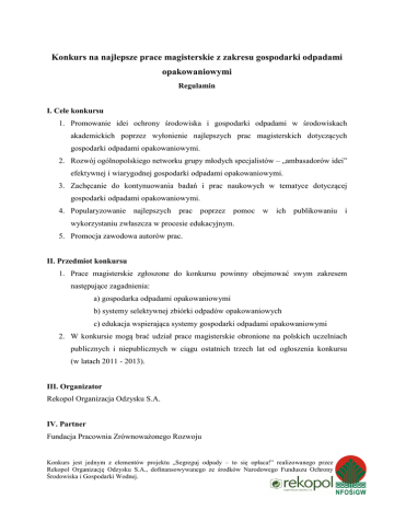Konkurs na najlepsze prace magisterskie z zakresu gospodarki odpadami opakowaniowymi Regulamin I. Cele konkursu 1. Promowanie idei ochrony środowiska i gospodarki odpadami w środowiskach akademickich poprzez wyłonienie najlepszych prac magisterskich dotyczących gospodarki odpadami opakowaniowymi. 2. Rozwój ogólnopolskiego networku grupy młodych specjalistów – „ambasadorów idei” efektywnej i wiarygodnej gospodarki odpadami opakowaniowymi. 3. Zachęcanie do kontynuowania badań i prac naukowych w tematyce dotyczącej gospodarki odpadami opakowaniowymi. 4. Popularyzowanie najlepszych prac poprzez pomoc w ich publikowaniu i wykorzystaniu zwłaszcza w procesie edukacyjnym. 5. Promocja zawodowa autorów prac. II. Przedmiot konkursu 1. Prace magisterskie zgłoszone do konkursu powinny obejmować swym zakresem następujące zagadnienia: a) gospodarka odpadami opakowaniowymi b) systemy selektywnej zbiórki odpadów opakowaniowych c) edukacja wspierająca systemy gospodarki odpadami opakowaniowymi 2. W konkursie mogą brać udział prace magisterskie obronione na polskich uczelniach publicznych i niepublicznych w ciągu ostatnich trzech lat od ogłoszenia konkursu (w latach 2011 - 2013). III. Organizator Rekopol Organizacja Odzysku S.A. IV. Partner Fundacja Pracownia Zrównoważonego Rozwoju Konkurs jest jednym z elementów projektu „Segreguj odpady – to się opłaca!” realizowanego przez Rekopol Organizację Odzysku S.A., dofinansowywanego ze środków Narodowego Funduszu Ochrony Środowiska i Gospodarki Wodnej. V. Zasady, tryb zgłaszania, przebieg konkursu 1. Konkurs jest konkursem ogólnopolskim. 2. Przez zgłoszenie pracy do konkursu należy rozumieć nadesłanie kopii pracy wraz z zapisem elektronicznym oraz wypełnioną kartą zgłoszenia udziału w konkursie. Karta stanowi załącznik do niniejszego regulaminu. 3. Prace wraz z kartą zgłoszenia należy przesyłać na adres: Rekopol Organizacja Odzysku S.A. 02 – 758 Warszawa ul. Mangalia 4 z dopiskiem „Konkurs na prace magisterskie” 4. Termin nadsyłania prac mija 30 czerwca 2013 r. 5. Zgłoszone do konkursu prace recenzują członkowie Jury Konkursowego. 6. Jury Konkursowe oceniać będzie według następujących kryteriów: • Zgodność z formalnymi wymogami konkursu • Zgodność tematu pracy z przedmiotem konkursu VI. Nagrody i wyróżnienia 1. Najlepsze prace zostaną nagrodzone nagrodami pieniężnymi w wysokości: a) I Miejsce – 15 tysięcy złotych b) II Miejsce – 10 tysięcy złotych c) III Miejsce – 5 tysięcy złotych Nagrody pieniężne zostaną pomniejszone o 10 proc. zryczałtowany podatek dochodowy zgodnie z art. 30 ust 1 pkt 2 ustawy o podatku dochodowym od osób fizycznych. 2. Jury Konkursowe może zadecydować o przyznaniu dodatkowych nagród i wyróżnień. 3. Wszyscy uczestnicy zostaną powiadomieni o wynikach konkursu. Informacja dotycząca wyników konkursu zostanie podana do publicznej wiadomości poprzez umieszczenie na stronie internetowej Rekopol Organizacja Odzysku S.A. www.rekopol.pl VII. Postanowienia końcowe 1. Zgłoszenie pracy do konkursu, przyznanie nagrody, czy wyróżnienia nie pozbawia Konkurs jest jednym z elementów projektu „Segreguj odpady – to się opłaca!” realizowanego przez Rekopol Organizację Odzysku S.A., dofinansowywanego ze środków Narodowego Funduszu Ochrony Środowiska i Gospodarki Wodnej. autora pracy uprawnień wynikających z prawa autorskiego oraz uczestniczenia w innych konkursach. 2. Rekopol zastrzega sobie prawo, po dokonaniu wcześniejszych uzgodnień z autorem, do wykorzystania pracy lub jej fragmentów w działaniach z zakresu edukacji ekologicznej. 3. W sprawach dotyczących konkursu, a nie uregulowanych niniejszym regulaminem, rozstrzyga Jury Konkursowe. Konkurs jest jednym z elementów projektu „Segreguj odpady – to się opłaca!” realizowanego przez Rekopol Organizację Odzysku S.A., dofinansowywanego ze środków Narodowego Funduszu Ochrony Środowiska i Gospodarki Wodnej.