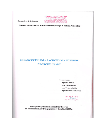 2 §1 Oceniając zachowanie uczniów w ciągu roku szkolnego punktuje się funkcjonowanie ucznia w środowisku szkolnym oraz respektowanie zasad współżycia społecznego i ogólnie przyjętych norm etycznych. Na koniec semestru i koniec roku szkolnego ustala się według punktacji oceny z zachowania: wzorową, bardzo dobrą, dobrą, poprawną, nieodpowiednią i naganną. §2 Uczeń uzyskuje wyjściowo 100 punktów i przyjmuje się następującą skalę ocen z zachowania w przeliczeniu na punkty: wzorowe- 151pkt. i więcej bardzo dobre- 121-150 pkt. dobrepoprawne- 100-120 pkt. 70-99 pkt. nieodpowiednie- 40-69 pkt. naganne- 39 i mniej §3 Wychowawca klasy na początku każdego roku szkolnego informuje uczniów oraz ich rodziców(prawnych opiekunów) o: 1) warunkach i sposobie oraz kryteriach oceniania zachowania; 2) warunkach i trybie uzyskania wyższej niż przewidywana rocznej oceny klasyfikacyjnej zachowania; 3) skutkach ustalenia uczniowi nagannej rocznej oceny klasyfikacyjnej zachowania §4 3 Oceny są jawne dla ucznia i jego rodziców (prawnych opiekunów) 1) na wniosek ucznia lub jego rodziców (prawnych opiekunów) nauczyciel uzasadnia ustaloną ocenę w sposób określony w statucie szkoły. §5 Oceny klasyfikacyjne z zajęć edukacyjnych nie mają wpływu na ocenę klasyfikacyjną zachowania 1) śródroczna i roczna ocena klasyfikacyjna zachowania uwzględnia w szczególności: a) wywiązywanie się z obowiązków ucznia; b) postępowanie zgodne z dobrem społeczności szkolnej c) dbałość o honor i tradycje szkoły d) dbałość o piękno mowy ojczystej; e) dbałość o bezpieczeństwo i zdrowie własne oraz innych osób f) okazywanie szacunku innym osobom 2) w klasach I – III szkoły podstawowej śródroczne i roczne oceny klasyfikacyjne zachowania są ocenami opisowymi §6 Rada pedagogiczna może podjąć uchwałę o niepromowaniu do klasy programowo wyższej lub nieukończeniu szkoły przez ucznia, któremu w danej szkole po raz drugi ustalono naganną roczną ocenę klasyfikacyjną zachowania 1) uczeń, któremu w danej szkole po raz trzeci z rzędu ustalono naganną roczną ocenę klasyfikacyjną zachowania, nie otrzymuje promocji do klasy programowo wyższej, a uczeń klasy programowo najwyższej w danym typie szkoły nie kończy szkoły 2) ustalona prze wychowawcę klasy roczna ocena klasyfikacyjna zachowania jest ostateczna 3) uczeń lub jego rodzice (prawni opiekunowie) mogą zgłosić zastrzeżenia do dyrektora szkoły, jeżeli uznają, że roczna (semestralna) ocena klasyfikacyjna 4 z zajęć edukacyjnych lub roczna ocena klasyfikacyjna zachowania została ustalona niezgodnie z przepisami prawa dotyczącymi trybu ustalania tej oceny. Zastrzeżenia mogą być zgłoszone w terminie 7 dni od zakończenia zajęć dydaktyczno – wychowawczych 4) w przypadku stwierdzenia, że roczna (semestralna) ocena klasyfikacyjna z zajęć edukacyjnych lub roczna ocena klasyfikacyjna zachowania została ustalona niezgodnie z przepisami prawa dotyczącymi trybu ustalania tej oceny, dyrektor szkoły powołuje komisję, która: a) w przypadku rocznej (semestralnej) oceny klasyfikacyjnej z zajęć edukacyjnych – przeprowadza sprawdzian wiadomości i umiejętności ucznia, w formie pisemnej i ustnej, oraz ustala roczną(semestralną) ocenę klasyfikacyjną z danych zajęć edukacyjnych b) w przypadku rocznej oceny klasyfikacyjnej zachowania – ustala roczną ocenę klasyfikacyjną zachowania w drodze głosowania zwykłą większością głosów; w przypadku równej liczby głosów decyduje głos przewodniczącego komisji. §7 NAGRODY I KARY 3.1. Nagrody i wyróżnienia. Nagrody i wyróżnienia są formą uznania dla uczniów za ich dobre wyniki w nauce i osiągnięcia zarówno szkolne jak i pozaszkolne oraz działalność na rzecz klasy i szkoły. Formy nagradzania Pochwała udzielona przez nauczyciela na forum klasy Pochwała z wpisem do dziennika Pochwała wychowawcy 5 Pochwała na forum szkoły udzielona przez dyrektora szkoły (apel) Świadectwo z wyróżnieniem, List pochwalny do rodziców; Wpis dodatnich punktów do dzienniczka Pozytywna ocena z zachowania Ucznia nagradza się za: 1. Udział w szkolnym konkursie szkolnym ( 2p.) - I miejsce – 10 p - II miejsce - 8 p - III miejsce - 5p 2. Udział w konkursie rejonowym (10) - I miejsce - 30 p. - II miejsce - 25 p - III miejsce – 20 p. 3. Udział w konkursie wojewódzkim ( 20 p) - I miejsce - 50 p. - II miejsce – 40 p. - III miejsce - 35 p. 4. Udział w konkursie ogólnopolskim (30 p) - I miejsce - 100 p. - II miejsce - 80 p - III miejsce - 60 p 5. Praca na rzecz klasy i szkoły: (od +5 do +15) 6 6. Reprezentowanie szkoły na imprezach środowiskowych: (od +10 do +20) 7. Pełniona funkcja w klasie i szkole: punkty (od +2 do +10) 8. Udział w zajęciach na terenie szkoły i poza nią : punkty (od +2 do +10); 9. Systematyczna pomoc koledze w nauce: punkty (+10) 10. Pomoc w przeprowadzeniu akcji charytatywnej: (od +10 do +30) 3.2 Kary Kary są wyrazem negatywnej oceny przewinień bądź postawy ucznia a stopień kary uzależniony jest od stopnia winy, rodzaju przewinienia, rozmiaru szkody, sposobu działania, pobudki czynu. Nie mogą być stosowane: 1. Kary naruszające nietykalność cielesną i godność osobistą ucznia. 2. Kary za kulturalne głoszenie własnych przekonań czy obronę praw godności swojej czy kolegów. Formy karania Upomnienie wychowawcy klasy Pisemna nagana wychowawcy klasy Zakaz brania udziału na czas określony w imprezach szkolnych, pozalekcyjnych i wycieczkach klasowych; 7 Upomnienie dyrektora szkoły Nagana dyrektora szkoły. Przeniesienie do innego zespołu klasowego, jeżeli nie wystąpi element chęci poprawy i współpracy rodziców; Naprawa szkody Prace społeczne na rzecz szkoły po lekcjach; Ucznia karze się za: 1. Brak stroju uroczystego (kamizelki, białej koszuli, spodni, spódniczki) punkty -20p 2. Brak mundurka szkolnego – 5 3. Noszenie dużej biżuterii, farbowanie włosów i paznok