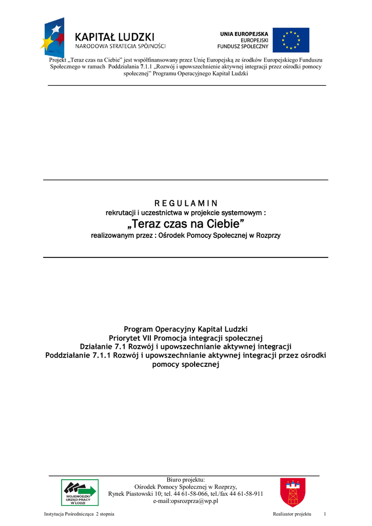 Projekt „Teraz czas na Ciebie” jest wspó finansowany przez Uni Europejsk ze rodków Europejskiego Funduszu Spo ecznego w ramach Poddzia ania 7.1.1 „Rozwój i upowszechnienie aktywnej integracji przez o rodki pomocy spo ecznej” Programu Operacyjnego Kapita Ludzki REGULAMIN rekrutacji i uczestnictwa w projekcie systemowym : „Teraz czas na Ciebie” realizowanym przez : O rodek Pomocy Spo ecznej w Rozprzy Program Operacyjny Kapita Ludzki Priorytet VII Promocja integracji spo ecznej Dzia anie 7.1 Rozwój i upowszechnianie aktywnej integracji Poddzia anie 7.1.1 Rozwój i upowszechnianie aktywnej integracji przez o rodki pomocy spo ecznej Biuro projektu: rodek Pomocy Spo ecznej w Rozprzy, Rynek Piastowski 10; tel. 44 61-58-066, tel./fax 44 61-58-911 e-mail:[email protected] Instytucja Po rednicz ca 2 stopnia Realizator projektu 1 Projekt „Teraz czas na Ciebie” jest wspó finansowany przez Uni Europejsk ze rodków Europejskiego Funduszu Spo ecznego w ramach Poddzia ania 7.1.1 „Rozwój i upowszechnienie aktywnej integracji przez o rodki pomocy spo ecznej” Programu Operacyjnego Kapita Ludzki 1. Informacje o projekcie 1. Projekt pod nazw „Teraz czas na Ciebie” realizowany jest przez O rodek Pomocy Spo ecznej w Rozprzy, Rynek Piastowski 10, 97-340 Rozprza. 2. Biuro projektu znajduje si w budynku O rodka Pomocy Spo ecznej w Rozprzy, Rynek Piastowski 10, 97-340 Rozprza. 3. Biuro czynne jest od poniedzia ku do pi tku w godzinach 7.30–15.30 telefon:(44) 615 80 66,fax: (44) 615 89 11. 4. Pracownicy zaanga owani do realizacji projektu urz duj w budynku O rodka Pomocy Spo ecznej w Rozprzy. 5. Projekt wspó finansowany jest ze rodków Europejskiego Funduszu Spo ecznego oraz bud etu pa stwa. 6. yte w regulaminie okre lenia oznaczaj : 1) Beneficjent – O rodek Pomocy Spo ecznej w Rozprzy. 2) Projekt – Projekt systemowy pt.: „Teraz czas na Ciebie” realizowany przez O rodek Pomocy Spo ecznej w Rozprzy w ramach Programu Operacyjnego Kapita Ludzki, priorytet VII. Promocja integracji spo ecznej, Dzia anie 7.1 Rozwój i upowszechnianie aktywnej integracji, Poddzia anie 7.1.1 Rozwój i upowszechnianie aktywnej integracji przez o rodki pomocy spo ecznej, wspó finansowany z Europejskiego Funduszu Spo ecznego oraz bud etu pa stwa. 3) Biuro projektu – budynek O rodka Pomocy Spo ecznej w Rozprzy, Rynek Piastowski 10 , 97-340 Rozprza. 4) Kierownik OPS – osoba odpowiedzialna za zarz dzanie ca ci projektu oraz za jego sta y nadzór. 5) Koordynator projektu, zespó projektowy – osoby odpowiedzialne za dzia ania merytoryczne : zainicjowanie, planowanie, organizowanie, monitoring, zamkni cie projektu. 6) Ksi gowy projektu – osoba odpowiedzialna za prowadzenie ksi gowo ci, rozliczanie projektu oraz sprawozdawczo finansow projektu. 7) Szkolenie zawodowe – szkolenie umo liwiaj ce nabycie kwalifikacji w okre lonym zawodzie. 8) Warsztaty psychologiczne – konsultacje i rozmowy z psychologiem maj ce na celu poszukiwanie predyspozycji indywidualnych do wykonywania okre lonego zawodu, wzmocnienie motywacji do poszukiwania i podj cia pracy. Biuro projektu: rodek Pomocy Spo ecznej w Rozprzy, Rynek Piastowski 10; tel. 44 61-58-066, tel./fax 44 61-58-911 e-mail:[email protected] Instytucja Po rednicz ca 2 stopnia Realizator projektu 2 Projekt „Teraz czas na Ciebie” jest wspó finansowany przez Uni Europejsk ze rodków Europejskiego Funduszu Spo ecznego w ramach Poddzia ania 7.1.1 „Rozwój i upowszechnienie aktywnej integracji przez o rodki pomocy spo ecznej” Programu Operacyjnego Kapita Ludzki 9) Warsztaty z zakresu doradztwa zawodowego – konsultacje i rozmowy z doradc zawodowym maj ce przede wszystkim na celu wybór w ciwego szkolenia zawodowego. 10) Kandydat – osoba ubiegaj ca si o zakwalifikowanie do udzia u w projekcie. 11) Beneficjent ostateczny – kandydat, który spe ni wszystkie wymogi formalne okre lone we wniosku o dofinansowanie projektu oraz otrzyma pozytywn opini kwalifikacyjn wydan przez komisj rekrutacyjn . 12) Komisja rekrutacyjna – zespó w sk adzie : Kierownik oraz cz onkowie zespo u projektowego, którego zadaniem jest wybór kandydatów spe niaj cych wymogi kwalifikacyjne do udzia u w projekcie. 13) Deklaracja uczestnictwa w projekcie – dokument stanowi cy wyra enie zgody na udzia w projekcie. 2. Postanowienia ogólne 1. Niniejszy regulamin okre la zasady rekrutacji kandydatów, zasady uczestnictwa w projekcie oraz prawa i obowi zki Beneficjentów Ostatecznych. 2. Projekt realizowany jest w okresie od 01 stycznia 2008 roku do 31 grudnia 2012 roku. 3. Udzia Beneficjentów Ostatecznych w projekcie jest bezp atny. 4. Koszt uczestnictwa Beneficjentów Ostatecznych w projekcie ponosi Beneficjent projektu ze rodków otrzymanych na realizacj projektu. 5. Celem g ównym projektu jest uaktywnienie osób korzystaj cych ze wiadcze pomocy spo ecznej zagro onych wykluczeniem spo ecznym z mo liwo ci powrotu na rynek pracy poprzez uzyskanie nowych kwalifikacji i umiej tno ci zawodowych. 6. Celem szczegó owym projektu jest zwi kszenie umiej tno ci spo ecznych poprzez treningi, wzmocnienie wiary we w asne mo liwo ci poprzez udzia zwi kszenie aktywizacji w warsztatach psychologicznych , zawodowej poprzez udzia w spotkaniach z doradc zawodowym, wsparcie uczestników projektu w zakresie podniesienia kompetencji yciowych umo liwiaj cych powrót na rynek pracy i do ycia spo ecznego. 7. Ka da osoba sk adaj ca dokumenty rekrutacyjne zobowi zana jest do zapoznania si z niniejszym Regulaminem. 8. W projekcie zaplanowano organizacj nast puj cych dzia : Biuro projektu: rodek Pomocy Spo ecznej w Rozprzy, Rynek Piastowski 10; tel. 44 61-58-066, tel./fax 44 61-58-911 e-mail:[email protected] Instytucja Po rednicz ca 2 stopnia Realizator projektu 3 Projekt „Teraz czas na Ciebie” jest wspó finansowany przez Uni Europejsk ze rodków Europejskiego Funduszu Spo ecznego w ramach Poddzia ania 7.1.1 „Rozwój i upowszechnienie aktywnej integracji przez o rodki pomocy spo ecznej” Programu