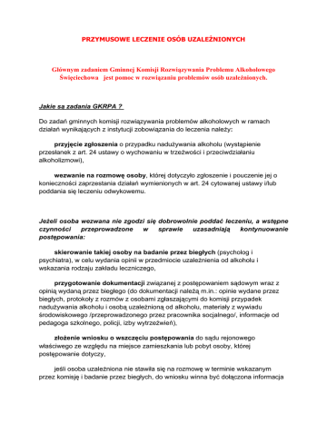 PRZYMUSOWE LECZENIE OSÓB UZALEŻNIONYCH Głównym zadaniem Gminnej Komisji Rozwiązywania Problemu Alkoholowego Święciechowa jest pomoc w rozwiązaniu problemów osób uzależnionych. Jakie są zadania GKRPA ? Do zadań gminnych komisji rozwiązywania problemów alkoholowych w ramach działań wynikających z instytucji zobowiązania do leczenia należy: przyjęcie zgłoszenia o przypadku nadużywania alkoholu (wystąpienie przesłanek z art. 24 ustawy o wychowaniu w trzeźwości i przeciwdziałaniu alkoholizmowi), wezwanie na rozmowę osoby, której dotyczyło zgłoszenie i pouczenie jej o konieczności zaprzestania działań wymienionych w art. 24 cytowanej ustawy i/lub poddania się leczeniu odwykowemu. Jeżeli osoba wezwana nie zgodzi się dobrowolnie poddać leczeniu, a wstępne czynności przeprowadzone w sprawie uzasadniają kontynuowanie postępowania: skierowanie takiej osoby na badanie przez biegłych (psycholog i psychiatra), w celu wydania opinii w przedmiocie uzależnienia od alkoholu i wskazania rodzaju zakładu leczniczego, przygotowanie dokumentacji związanej z postępowaniem sądowym wraz z opinią wydaną przez biegłego (do dokumentacji należą m.in.: opinie wydane przez biegłych, protokoły z rozmów z osobami zgłaszającymi do komisji przypadek nadużywania alkoholu i osobą uzależnioną od alkoholu, materiały z wywiadu środowiskowego /przeprowadzonego przez pracownika socjalnego/, informacje od pedagoga szkolnego, policji, izby wytrzeźwień), złożenie wniosku o wszczęciu postępowania do sądu rejonowego właściwego ze względu na miejsce zamieszkania lub pobyt osoby, której postępowanie dotyczy, jeśli osoba uzależniona nie stawiła się na rozmowę w terminie wskazanym przez komisję i badanie przez biegłych, do wniosku winna być dołączona informacja o podjętych w tej sprawie czynnościach (liczbę i terminy wezwań wraz z informacją o niestawieniu się osoby). Kto może złożyć wniosek o leczenie odwykowe? Wniosek może złożyć dowolna osoba (sąsiad, daleki krewny, członek rodziny itp.) lub instytucja (zakład pracy, pomoc społeczna, Policja, Prokuratura), która wie o osobie nadużywającej alkoholu i powodującej rozkład życia rodzinnego, demoralizację małoletnich, uchylającej się od pracy albo systematycznie zakłócającej spokój lub porządek publiczny. Gdzie złożyć wniosek? Wniosek należy złożyć w siedzibie Gminnej Komisji Rozwiązywania Problemów Alkoholowych, właściwej ze względu na miejsce zamieszkania lub pobytu osoby, której wniosek dotyczy ( pok. nr 11 Urzędu Gminy w Święciechowie ) I. Kierowanie na przymusowe leczenie odwykowe osób uzależnionych od alkoholu Artykuł 21.2. ustawy z dnia 26 października 1982r. o wychowaniu w trzeźwości i przeciwdziałaniu alkoholizmowi ustanawia zasadę dobrowolności leczenia odwykowego osób uzależnionych od alkoholu. Jednym z wyjątków od tej zasady jest instytucja zobowiązania do leczenia odwykowego uregulowana w art. 24 - 36 w/w ustawy. Jak funkcjonuje instytucja zobowiązania do leczenia odwykowego? Zobowiązanie nie ma charakteru przymusu w sensie prawnym. Funkcja społeczna tej instytucji polega na instytucjonalnym motywowaniu do podjęcia terapii odwykowej. Przymus polegający na doprowadzeniu przez policję można zastosować zgodnie z zapisami ustawy na etapie doprowadzania osoby uzależnionej od alkoholu na badanie przez biegłych (o ile odbywa się na zlecenie sądu), na rozprawę w sądzie i do zakładu leczniczego na podjęcie kuracji za każdym razem, gdy oddali się ona samowolnie z zakładu. Nie ma możliwości (zarówno prawnych jak i organizacyjnych) zatrzymania pacjenta w zakładzie leczniczym wbrew jego woli (placówki lecznictwa odwykowego nie są aresztami). Podstawowym celem terapii uzależnienia od alkoholu jest uzyskanie poprawy zdrowia pacjenta (niezależnie od tego, czy pacjent został zobowiązany do leczenia przez sąd, czy też zgłosił się dobrowolnie). Zobowiązanie do leczenia odwykowego nie jest metodą przeciwdziałania przemocy w rodzinie. Stanowi jeden z wielu elementów pomagania ofiarom przemocy. Postępowanie zobowiązujące do podjęcia leczenia odwykowego dotyczy osób, które zgodnie z art. 24 ustawy powodują: - rozkład życia rodzinnego, - demoralizację małoletnich, - uchylanie się od pracy, - systematycznie zakłócają spokój lub porządek publiczny. O zastosowaniu w/w procedury wobec osoby uzależnionej stanowi sąd rejonowy, właściwy miejscu zamieszkania lub przebywania tej osoby. Wydawanie opinii przez biegłych Listy biegłych orzekających w przedmiocie uzależnienia od alkoholu zatwierdza Prezes Sądu Okręgowego. W/w listy znajdują się w Sądzie Okręgowym. Koszty sporządzenia opinii, także na etapie postępowania sądowego, finansuje gmina kierująca sprawę do sądu. Zaleca się, aby gminne komisje rozwiązywania problemów alkoholowych podejmując czynności zobowiązania do leczenia odwykowego i powołując biegłych posługiwały się listą rekomendowaną przez sąd, z uwagi na rzetelność opinii i unikanie podwójnego finansowania opinii w razie konieczności powołania drugiego zespołu biegłych w trakcie postępowania sądowego. Osoba wobec której wszczęto postępowanie w przedmiocie uzależnienia od alkoholu, jest poddawana badaniu psychologicznemu i psychiatrycznemu. Wynik tych badań (opinia – w przedmiocie uzależnienia od alkoholu) – ma służyć sądowi za podstawę do ewentualnego orzeczenia o obowiązku poddania się przez tę osobę leczeniu odwykowemu. W sytuacji niemożności wydania opinii o fakcie uzależnienia, biegli mogą skorzystać z opinii specjalisty psychoterapii uzależnień. Osoba uzależniona od alkoholu lub poszukująca pomocy może zgłosić się do: Gminnej Komisji Rozwiązywania Problemów Alkoholowych Problemów Alkoholowych w Święciechowie , ul. Ułańska 4 , pok.nr 11 , lub telefonicznie 65 5333 519 .