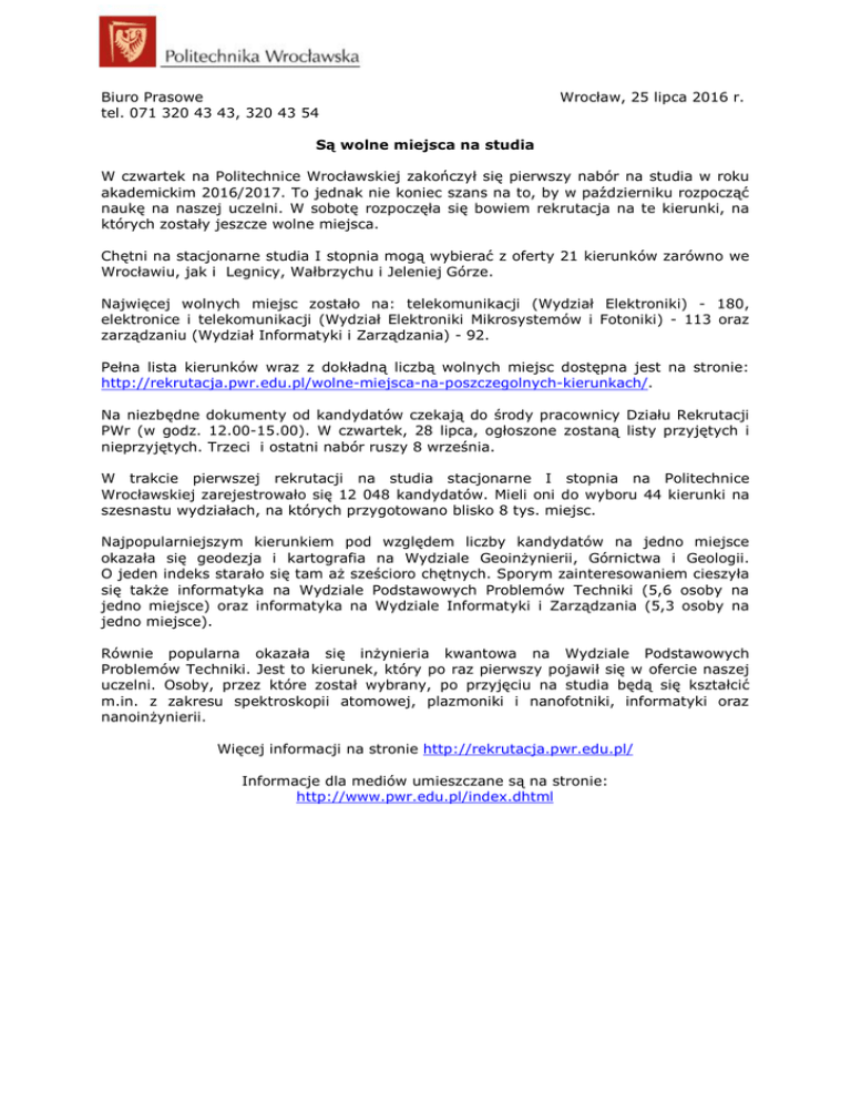 Biuro Prasowe tel. 071 320 43 43, 320 43 54 Wrocław, 25 lipca 2016 r. Są wolne miejsca na studia W czwartek na Politechnice Wrocławskiej zakończył się pierwszy nabór na studia w roku akademickim 2016/2017. To jednak nie koniec szans na to, by w październiku rozpocząć naukę na naszej uczelni. W sobotę rozpoczęła się bowiem rekrutacja na te kierunki, na których zostały jeszcze wolne miejsca. Chętni na stacjonarne studia I stopnia mogą wybierać z oferty 21 kierunków zarówno we Wrocławiu, jak i Legnicy, Wałbrzychu i Jeleniej Górze. Najwięcej wolnych miejsc zostało na: telekomunikacji (Wydział Elektroniki) - 180, elektronice i telekomunikacji (Wydział Elektroniki Mikrosystemów i Fotoniki) - 113 oraz zarządzaniu (Wydział Informatyki i Zarządzania) - 92. Pełna lista kierunków wraz z dokładną liczbą wolnych miejsc dostępna jest na stronie: http://rekrutacja.pwr.edu.pl/wolne-miejsca-na-poszczegolnych-kierunkach/. Na niezbędne dokumenty od kandydatów czekają do środy pracownicy Działu Rekrutacji PWr (w godz. 12.00-15.00). W czwartek, 28 lipca, ogłoszone zostaną listy przyjętych i nieprzyjętych. Trzeci i ostatni nabór ruszy 8 września. W trakcie pierwszej rekrutacji na studia stacjonarne I stopnia na Politechnice Wrocławskiej zarejestrowało się 12 048 kandydatów. Mieli oni do wyboru 44 kierunki na szesnastu wydziałach, na których przygotowano blisko 8 tys. miejsc. Najpopularniejszym kierunkiem pod względem liczby kandydatów na jedno miejsce okazała się geodezja i kartografia na Wydziale Geoinżynierii, Górnictwa i Geologii. O jeden indeks starało się tam aż sześcioro chętnych. Sporym zainteresowaniem cieszyła się także informatyka na Wydziale Podstawowych Problemów Techniki (5,6 osoby na jedno miejsce) oraz informatyka na Wydziale Informatyki i Zarządzania (5,3 osoby na jedno miejsce). Równie popularna okazała się inżynieria kwantowa na Wydziale Podstawowych Problemów Techniki. Jest to kierunek, który po raz pierwszy pojawił się w ofercie naszej uczelni. Osoby, przez które został wybrany, po przyjęciu na studia będą się kształcić m.in. z zakresu spektroskopii atomowej, plazmoniki i nanofotniki, informatyki oraz nanoinżynierii. Więcej informacji na stronie http://rekrutacja.pwr.edu.pl/ Informacje dla mediów umieszczane są na stronie: http://www.pwr.edu.pl/index.dhtml