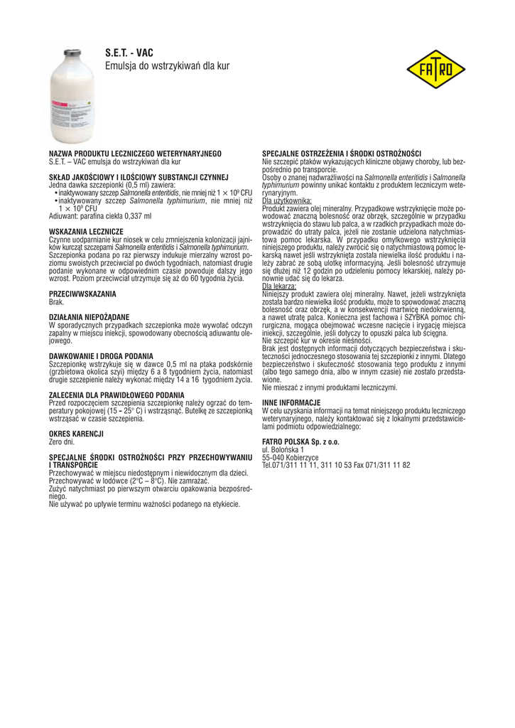 S.E.T. - VAC Emulsja do wstrzykiwań dla kur NAZWA PRODUKTU LECZNICZEGO WETERYNARYJNEGO S.E.T. – VAC emulsja do wstrzykiwań dla kur SKŁAD JAKOŚCIOWY I ILOŚCIOWY SUBSTANCJI CZYNNEJ Jedna dawka szczepionki (0,5 ml) zawiera: •inaktywowany szczep Salmonella enteritidis, nie mniej niż 1 × 109 CFU •inaktywowany szczep Salmonella typhimurium, nie mniej niż 1 × 109 CFU Adiuwant: parafina ciekła 0,337 ml WSKAZANIA LECZNICZE Czynne uodparnianie kur niosek w celu zmniejszenia kolonizacji jajników kurcząt szczepami Salmonella enteritidis i Salmonella typhimurium. Szczepionka podana po raz pierwszy indukuje mierzalny wzrost poziomu swoistych przeciwciał po dwóch tygodniach, natomiast drugie podanie wykonane w odpowiednim czasie powoduje dalszy jego wzrost. Poziom przeciwciał utrzymuje się aż do 60 tygodnia życia. PRZECIWWSKAZANIA Brak. DZIAŁANIA NIEPOŻĄDANE W sporadycznych przypadkach szczepionka może wywołać odczyn zapalny w miejscu iniekcji, spowodowany obecnością adiuwantu olejowego. DAWKOWANIE I DROGA PODANIA Szczepionkę wstrzykuje się w dawce 0,5 ml na ptaka podskórnie (grzbietowa okolica szyi) między 6 a 8 tygodniem życia, natomiast drugie szczepienie należy wykonać między 14 a 16 tygodniem życia. ZALECENIA DLA PRAWIDŁOWEGO PODANIA Przed rozpoczęciem szczepienia szczepionkę należy ogrzać do temperatury pokojowej (15 ‐ 25° C) i wstrząsnąć. Butelkę ze szczepionką wstrząsać w czasie szczepienia. OKRES KARENCJI Zero dni. SPECJALNE ŚRODKI OSTROŻNOŚCI PRZY PRZECHOWYWANIU I TRANSPORCIE Przechowywać w miejscu niedostępnym i niewidocznym dla dzieci. Przechowywać w lodówce (2°C – 8°C). Nie zamrażać. Zużyć natychmiast po pierwszym otwarciu opakowania bezpośredniego. Nie używać po upływie terminu ważności podanego na etykiecie. SPECJALNE OSTRZEŻENIA I ŚRODKI OSTROŻNOŚCI Nie szczepić ptaków wykazujących kliniczne objawy choroby, lub bezpośrednio po transporcie. Osoby o znanej nadwrażliwości na Salmonella enteritidis i Salmonella typhimurium powinny unikać kontaktu z produktem leczniczym weterynaryjnym. Dla użytkownika: Produkt zawiera olej mineralny. Przypadkowe wstrzyknięcie może powodować znaczną bolesność oraz obrzęk, szczególnie w przypadku wstrzyknięcia do stawu lub palca, a w rzadkich przypadkach może doprowadzić do utraty palca, jeżeli nie zostanie udzielona natychmiastowa pomoc lekarska. W przypadku omyłkowego wstrzyknięcia niniejszego produktu, należy zwrócić się o natychmiastową pomoc lekarską nawet jeśli wstrzyknięta została niewielka ilość produktu i należy zabrać ze sobą ulotkę informacyjną. Jeśli bolesność utrzymuje się dłużej niż 12 godzin po udzieleniu pomocy lekarskiej, należy ponownie udać się do lekarza. Dla lekarza: Niniejszy produkt zawiera olej mineralny. Nawet, jeżeli wstrzyknięta została bardzo niewielka ilość produktu, może to spowodować znaczną bolesność oraz obrzęk, a w konsekwencji martwicę niedokrwienną, a nawet utratę palca. Konieczna jest fachowa i SZYBKA pomoc chirurgiczna, mogąca obejmować wczesne nacięcie i irygację miejsca iniekcji, szczególnie, jeśli dotyczy to opuszki palca lub ścięgna. Nie szczepić kur w okresie nieśności. Brak jest dostępnych informacji dotyczących bezpieczeństwa i skuteczności jednoczesnego stosowania tej szczepionki z innymi. Dlatego bezpieczeństwo i skuteczność stosowania tego produktu z innymi (albo tego samego dnia, albo w innym czasie) nie zostało przedstawione. Nie mieszać z innymi produktami leczniczymi. INNE INFORMACJE W celu uzyskania informacji na temat niniejszego produktu leczniczego weterynaryjnego, należy kontaktować się z lokalnymi przedstawicielami podmiotu odpowiedzialnego: FATRO POLSKA Sp. z o.o. ul. Bolońska 1 55-040 Kobierzyce Tel.071/311 11 11, 311 10 53 Fax 071/311 11 82