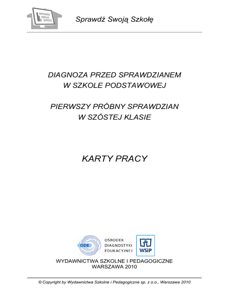 Sprawdź Swoją Szkołę DIAGNOZA PRZED SPRAWDZIANEM W SZKOLE PODSTAWOWEJ PIERWSZY PRÓBNY SPRAWDZIAN W SZÓSTEJ KLASIE KARTY PRACY WYDAWNICTWA SZKOLNE I PEDAGOGICZNE WARSZAWA 2010 © Copyright by Wydawnictwa Szkolne i Pedagogiczne sp. z o.o., Warszawa 2010 Pierwszy próbny sprawdzian w szóstej klasie szkoły podstawowej Karty pracy Strefa wyników niskich Zestaw I Tekst I Podróżnik Marek Kamiński wraz z Jankiem Melą, niepełnosprawnym piętnastolatkiem, wyruszył 15 kwietnia 2004 roku na biegun północny. Wyprawa zakończyła się sukcesem 28 kwietnia 2004 roku. 15 kwietnia 2004 Zaczęła się nasza wędrówka na biegun północny. Gdy opuszczamy „Borneo”, pogoda jest dobra. Świeci słońce, temperatura -25°C, lekki wiatr. Nie wiem, jak damy sobie radę. Może się tak wiele wydarzyć. Każdego dnia najwyżej godzina dzieli sukces od porażki. Jasiu dzielnie daje sobie radę. Sam szuka drogi, dobrze reaguje na nowe sytuacje. Cały czas musimy uważać. Przychodzą chmury i robi się zimno i ponuro. Po czterech godzinach marszu rozbijamy namioty. Na razie wszystko działa i jest nadzieja, że może wyprawa skończy się szczęśliwie. Przed nami dziewięć długich dni. 20 kwietnia 2004 Nasza wiara została wystawiona na poważną próbę. Po całym dniu ciężkiego marszu posunęliśmy się od wczoraj o 2 km w stronę bieguna. Wczoraj wieczorem byliśmy o 30,5 km, a dzisiaj o tej samej porze jesteśmy 28,7 km od bieguna. Cały dzień przedzierania się przez przedsionek piekła i staliśmy w miejscu. Wszystko przez wiatr i dryf1, który przemieszcza nas z prędkością 0,5 km na godzinę. Czyli w ciągu 8 godzin snu możemy zdryfować o 4 km. Chaos potworny, czyściec, trzęsienie ziemi, kataklizm to słowa, które przychodzą mi na myśl, kiedy oglądam ten krajobraz. Teren wygląda okropnie, tym bardziej że mało widać, wszystko jest skąpane w ponurej sinej poświacie. Do tego mocny wiatr i czasem miecie śniegiem. Wystarczy, żeby człowiek zastanowił się: co ja tutaj robię? Jasiek świetnie daje sobie radę. Nie narzeka, maszeruje, czasem się przewraca, wstaje i idzie dalej. I tak wędrujemy. Każdy ma swój bagaż. Czy dojdziemy, dokąd i co nas tam spotka? Zobaczymy. 23 kwietnia 2004 Czy biegun nam odpuści? W nocy znowu dryf. Znowu 21,7 km do bieguna. Czarna rozpacz. Ale też nadzieja i wiara. Ciężki dzień. Trudny dzień. Ale dobry. Wstajemy wcześniej, o 10:00 jesteśmy gotowi do wymarszu. Zostawiam jeszcze kurtkę puchową, żeby odnowić przymierze puchowe z biegunem i przebłagać go. Teren na początku ciężki, potem puszcza. Wypłaszcza się. Już nie staje dęba, ale jest mniej więcej równy. 23 maja 2004 Bohaterem się bywa, człowiekiem się jest. Jakoś nie bardzo pociągał mnie „heroiczny” wymiar wypraw albo to, że trzeba się sprawdzać czy szukać adrenaliny. Raczej poznawanie innych światów, innych stanów świadomości, zobaczenie tego, co jest za horyzontem. Planowanie, wymyślanie szczegółów ekwipunku, drobiazgi to pociągało mnie bardziej niż ryzyko czy chęć udowodnienia komuś czegoś o sobie. M. Kamiński, Razem na biegun. 1 dryf – znoszenie, zboczenie z linii pod wpływem np. wiatru. 2 Sprawdź Swoją Szkołę – 2010/2011 Pierwszy próbny sprawdzian w szóstej klasie szkoły podstawowej Karty pracy Zadania od 1. do 6. wykonaj na podstawie tekstu I. Zadanie 1. (1.1) Czy osoba opisująca wydarzenia uczestniczyła w wyprawie na biegun północny? Podkreśl TAK lub NIE. TAK NIE Zadanie 2. (1.1) Co odczuwał pierwszego dnia autor dziennika podróży? A. Radość. B. Niepewność. C. Smutek. D. Rozczarowanie. C. Bagaż. D. Śnieg. Zadanie 3. (1.1) Co przede wszystkim opóźniało wyprawę? A. Dryf. B. Mróz. Zadanie 4. (1.1) Krajobraz opisany 20 kwietnia budził w uczestniku wyprawy A. grozę. B. radość. C. zachwyt. D. smutek. Zadanie 5. (1.1) Zaangażowanie autora tekstu podczas organizowania kolejnych wypraw daje możliwość A. sprawdzenia się w trudnych warunkach. B. poznawania nowych miejsc. C. dostarczania sobie mocnych wrażeń. D. stania się bohaterem. Zadanie 6. (1.1) Oceń prawdziwość poniższych informacji dotyczących wyprawy na biegun północny. Podkreśl TAK, jeśli zdanie zawiera informację prawdziwą, lub NIE, jeśli zdanie jest fałszywe. Janek Mela jest niepełnosprawnym chłopcem. TAK NIE Część drogi Janek pokonał, jadąc na saniach. TAK NIE 20 kwietnia do bieguna mieli 28,7 km. TAK NIE Wyprawa zakończyła się sukcesem. TAK NIE Zadanie 7. (1.1) Uczestnicy wyprawy codziennie musieli pokonywać trudności. Którym wyrazem można zastąpić wyraz trudności, nie zmieniając sensu zdania? A. Wstydliwość. B. Przeciwności. C. Niezręczności. Sprawdź Swoją Szkołę – 2010/2011 D. Nieśmiałość. 3 Pierwszy próbny sprawdzian w szóstej klasie szkoły podstawowej Karty pracy Zadanie 8. (4.1) Pisownię wyrazów takich jak: bohater, podróż, biegun czy północ najlepiej sprawdzić w słowniku A. poprawnej polszczyzny. B. wyrazów obcych. C. wyrazów bliskoznacznych. D. ortograficznym. Zadanie 9. (3.2) W dwóch zdaniach napisz, jakie korzyści może przynieść wyprawa turystyczna. ___________________________________________________________________ ___________________________________________________________________ ___________________________________________________________________ Tekst II Zdumiewające wydaje się, że europejscy żeglarze aż do XII wieku n.e. nie posiadali wskazujących im właściwą drogę kompasów. Podróże morskie musiały być wtedy niezwykle trudne i niebezpieczne. Pierwszymi ludźmi, którzy użyli kompasu do nawigacji, byli prawdopodobnie podróżnicy chińscy. W chińskiej księdze z IV wieku p.n.e. znaleźć można najwcześniejszą wzmiankę o tym przyrządzie. Początkowo igły kompasu wykonywano z magnetytu, naturalnie magnetycznej postaci tlenku żelaza o czarnym zabarwieniu. Chińczycy odkryli, że pozostawiony swobodnie kawałek magnetytu zawsze ustawi