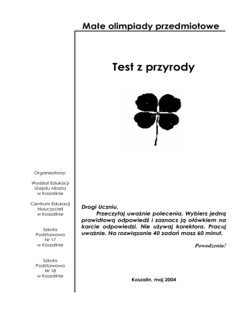 Małe olimpiady przedmiotowe Test z przyrody Organizatorzy: Wydział Edukacji Urzędu Miasta w Koszalinie Centrum Edukacji Nauczycieli w Koszalinie Szkoła Podstawowa Nr 17 w Koszalinie Szkoła Podstawowa Nr 18 w Koszalinie Drogi Uczniu, Przeczytaj uwaŜnie polecenia. Wybierz jedną prawidłową odpowiedź i zaznacz ją ołówkiem na karcie odpowiedzi. Nie uŜywaj korektora. Pracuj uwaŜnie. Na rozwiązanie 40 zadań masz 60 minut. Powodzenia! Koszalin, maj 2004 1. W jakim miesiącu obchodzi się Światowy Tydzień Zwierząt ? A. listopadzie B. wrześniu C. kwietniu D. październiku 2.”Czerwona Księga” zawiera spis gatunków: A. B. C. D. występujących wyłącznie w parkach narodowych zagroŜonych wyginięciem będącymi pomnikami przyrody objętych częściową ochroną gatunkową 3. W odcinku szyjnym kręgosłupa ssaków ilość kręgów: A. jest róŜna B. zaleŜy od długości szyi C. zawsze wynosi 7 D. zwykle wynosi 6 4. Które z przedstawionych rysunków owoców naleŜy do klonu? 5. Łodygi niektórych roślin okrytonasiennych mogą występować w formie zmodyfikowanej. WskaŜ szereg, w którym znajdują się wyłącznie łodygi przekształcone. A. głąb, bulwa łodygowa, kolec B. pień, źdźbło, ssawka C. łodyga wijąca, łuska, cebula D. kłącza, rozłogi, piętka 6.Upiększanie sypialni duŜą ilością roślin doniczkowych jest: A. wskazane, poniewaŜ rośliny wzbogacają powietrze w tlen B. niewskazane, poniewaŜ nocą rośliny oddychając, zuŜywają tlen C. obojętne dla zdrowia, poniewaŜ roślina nocą nie przeprowadza fotosyntezy D. poŜądane, poniewaŜ nocą roślina intensywnie oddycha i wzbogaca powietrze w tlen 7. W procesie fotosyntezy głównym produktem jest: A. cukier- glukoza B. tlen C. dwutlenek węgla D. woda 8. Jaką częścią i skąd róŜa pobiera wodę z solami mineralnymi? A. liśćmi z padającego deszczu B. łodygą z porannej rosy C. korzeniem z podłoŜa D. całą powierzchnią z powietrza o postaci pary wodnej 2 9. W komórce zwierzęcej ( wybierz właściwą odpowiedź): A. błona komórkowa znajduje się na zewnętrzu komórki, a ściana komórkowa wewnątrz B. ściana komórkowa znajduje się na zewnątrz komórki, a błona komórkowa wewnątrz C. nie ma w ogóle błony, tylko ściana komórkowa otacza komórkę D. nie ma w ogóle ściany komórkowej, jest tylko błona otaczająca komórkę 10. Organizmy zwane pierwotniakami zbudowane są z: A. wielu komórek B. jednej komórki C. dwóch warstw komórek D. jednej warstwy komórek 11. Rysunek przedstawia budowę kwiatu rośliny okrytonasiennej, która z liter oznacza działki kielicha: D A C B 12. Na kwiatach w ogrodzie pojawiły się mszyce. Który owad jest ich wrogiem? A. stonka B. bielinek C. pszczoła D. biedronka 13. Który rysunek przedstawia gałązkę cisa? A B C 14. Który rysunek przedstawia typ kwiatostanu – koszyczek? A B C 3 D D 15.Owoce występują tylko u: A. mszaków B. okrytozaląŜkowych C. nagozaląŜkowych D. paprotników 16.Czy znane są jajorodne ssaki? A. tak np. dziobak B. tak, ale juŜ dawno wymarły C. nie poniewaŜ ssaki są Ŝyworodne D. nie, poniewaŜ ssaki nie posiadają warunków do znoszenia jaj 17. Dlaczego w tradycyjną noc świętojańską ( 24 czerwca) nie moŜna znaleźć kwiatu paproci? A. paproć kwitnie tylko w sierpniu B. paproć nie wytwarza kwiatów C. kwiaty paproci są bardzo dobrze ukryte D. kwiaty paproci zamykają się na noc 18. Co to są oziminy? A. rośliny rosnące zimą B. rośliny siane jesienią na zbiór letni C. zwierzęta zimujące w ukryciu D. owady zimujące w ziemi 19. Porosty, mchy, karłowate brzozy i wierzby to roślinność charakterystyczna dla: A. prerii B. tajgi C. tundry D. stepu 20. Zamarznięta bielizna wysycha na mrozie dzięki zjawisku zwanym: C. topnieniem D. napięciem powierzchniowym A. sublimacją B. parowaniem 21. 1 litr wody o temperaturze 4oC waŜy więcej niŜ 1 litr wody w innej temperaturze, poniewaŜ: A. woda o temperaturze 4oC ma najmniejszą gęstość B. woda o temperaturze 4oC ma największą gęstość C. woda zamarzając zwiększa swoją objętość D. woda zamarzając zmniejsza swoją objętość 22. Który rysunek przedstawia prawidłowy bieg promienia światła przechodzącego przez szklany pryzmat z powietrza. A B C 23. Gdzie nie moŜna zaobserwować zjawiska rozszczepienia światła ? A. w głębiach oceanu C. przy wodospadzie B. w wodzie ze zraszaczy trawników D. przy fontannie 4 D 24. W powstawaniu kwaśnych deszczów biorą udział: A. zanieczyszczenia gleby B. ścieki z fabryki C. zanieczyszczenia powietrza D. zanieczyszczenia wody 25.Wzrost temperatury powietrza na kuli ziemskiej(efekt cieplarniany) jest wynikiem: A. zwiększania ilości tlenków siarki wydobywających się z kominów fabrycznych B. zwiększenia ilości dwutlenku węgla w powietrzu C. dzikich wysypisk śmieci D. zwiększenia ilości wszystkich gazów wydobywających się z kominów fabrycznych 26. Agata będąc na wycieczce, oglądała wschód i zachód Słońca. Zanotowała, Ŝe Słońce wzeszło o godzinie 314, a zaszło o godzinie 2002. Jak długo trwała noc? A. 7 godzin 48 minut B. 16 godzin 48 minut C. 7 godzin 12 minut D. 17 godzin 12 minut 27. W nawiązaniu do zadania 26 odpowiedz w jakiej porze roku Agata była na wycieczce? A. latem B. zimą C. wczesną wiosną D. późną jesienią 28. Adam przez cały dzień obserwował cień, jaki rzucał gnomon. Zaznacz, który rysunek przedstawia cień w południe. 29. Ola będąc na zimowisku, obserwowała wysokość Słońca na sklepieniu niebieskim i przedstawiła to na rysunku. Wybierz rysunek Oli. 5 30. Rysunek przedstawia zaćmienie: A. KsięŜyca B. Słońca C. Ziemi D. Komety 31. W jakiej odległości od Słońca znajduje się Ziemia? Promień światła przebywa tę odległość w czasie 8 minut 20 sekund. Światło porusza się z prędkością 300 000 km/s. A. 151 mln km B. 150 mln km C. 149 mln km D. 15 mln km Karolina wie, Ŝe Ziemia w swojej rocznej wędrów