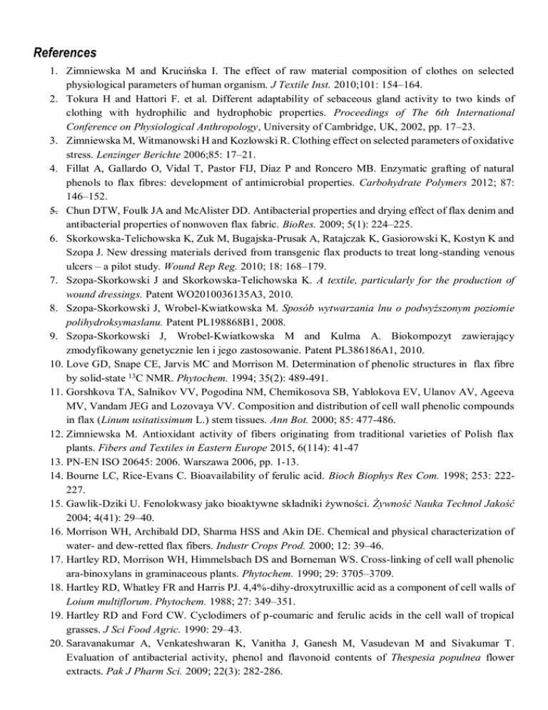 References 1. Zimniewska M and Krucińska I. The effect of raw material composition of clothes on selected physiological parameters of human organism. J Textile Inst. 2010;101: 154–164. 2. Tokura H and Hattori F. et al. Different adaptability of sebaceous gland activity to two kinds of clothing with hydrophilic and hydrophobic properties. Proceedings of The 6th International Conference on Physiological Anthropology, University of Cambridge, UK, 2002, pp. 17–23. 3. Zimniewska M, Witmanowski H and Kozlowski R. Clothing effect on selected parameters of oxidative stress. Lenzinger Berichte 2006;85: 17–21. 4. Fillat A, Gallardo O, Vidal T, Pastor FIJ, Díaz P and Roncero MB. Enzymatic grafting of natural phenols to flax fibres: development of antimicrobial properties. Carbohydrate Polymers 2012; 87: 146–152. 5. Chun DTW, Foulk JA and McAlister DD. Antibacterial properties and drying effect of flax denim and antibacterial properties of nonwoven flax fabric. BioRes. 2009; 5(1): 224–225. 6. Skorkowska-Telichowska K, Zuk M, Bugajska-Prusak A, Ratajczak K, Gasiorowski K, Kostyn K and Szopa J. New dressing materials derived from transgenic flax products to treat long-standing venous ulcers – a pilot study. Wound Rep Reg. 2010; 18: 168–179. 7. Szopa-Skorkowski J and Skorkowska-Telichowska K. A textile, particularly for the production of wound dressings. Patent WO2010036135A3, 2010. 8. Szopa-Skorkowski J, Wrobel-Kwiatkowska M. Sposób wytwarzania lnu o podwyższonym poziomie polihydroksymaslanu. Patent PL198868B1, 2008. 9. Szopa-Skorkowski J, Wrobel-Kwiatkowska M and Kulma A. Biokompozyt zawierający zmodyfikowany genetycznie len i jego zastosowanie. Patent PL386186A1, 2010. 10. Love GD, Snape CE, Jarvis MC and Morrison M. Determination of phenolic structures in flax fibre by solid-state 13C NMR. Phytochem. 1994; 35(2): 489-491. 11. Gorshkova TA, Salnikov VV, Pogodina NM, Chemikosova SB, Yablokova EV, Ulanov AV, Ageeva MV, Vandam JEG and Lozovaya VV. Composition and distribution of cell wall phenolic compounds in flax (Linum usitatissimum L.) stem tissues. Ann Bot. 2000; 85: 477-486. 12. Zimniewska M. Antioxidant activity of fibers originating from traditional varieties of Polish flax plants. Fibers and Textiles in Eastern Europe 2015, 6(114): 41-47 13. PN-EN ISO 20645: 2006. Warszawa 2006, pp. 1-13. 14. Bourne LC, Rice-Evans C. Bioavailability of ferulic acid. Bioch Biophys Res Com. 1998; 253: 222227. 15. Gawlik-Dziki U. Fenolokwasy jako bioaktywne składniki żywności. Żywność Nauka Technol Jakość 2004; 4(41): 29–40. 16. Morrison WH, Archibald DD, Sharma HSS and Akin DE. Chemical and physical characterization of water- and dew-retted flax fibers. Industr Crops Prod. 2000; 12: 39–46. 17. Hartley RD, Morrison WH, Himmelsbach DS and Borneman WS. Cross-linking of cell wall phenolic ara-binoxylans in graminaceous plants. Phytochem. 1990; 29: 3705–3709. 18. Hartley RD, Whatley FR and Harris PJ. 4,4%-dihy-droxytruxillic acid as a component of cell walls of Loium multiflorum. Phytochem. 1988; 27: 349–351. 19. Hartley RD and Ford CW. Cyclodimers of p-coumaric and ferulic acids in the cell wall of tropical grasses. J Sci Food Agric. 1990: 29–43. 20. Saravanakumar A, Venkateshwaran K, Vanitha J, Ganesh M, Vasudevan M and Sivakumar T. Evaluation of antibacterial activity, phenol and flavonoid contents of Thespesia populnea flower extracts. Pak J Pharm Sci. 2009; 22(3): 282-286. 21. Amin Alnajar ZA, Abdulla MA, Ali HM, Alshawsh MA and Hadi HA. Acute toxicity evaluation, antibacterial, antioxidant and immunomodulatory effects of Melastoma malabathricum. Molecules. 2012; 17: 3547-3559. 22. Sharma HSS, Lefevre J and Boucaud J. Role of micro-bial enzymes during retting and their effects on fiber characteristics. In: Sharma, H.S.S., Van Sumere, C.F. (Eds.), The Biology and Processing of Flax. M Publications, Belfast, UK, 1992, pp. 157 – 198. 23. Akin D E. Linen Most Useful: Perspectives on Structure, Chemistry, and Enzymes for Retting Flax, Hindawi Publishing Corporation, ISRN Biotechnology, 2013,Article ID186534, http://dx.doi.org/10.5402/2013/186534 24. Verma Vijay C and Gange Alan C. Advances in Endophytic Research, Springer Science & Business Media, 12.11.2013 – 454, 25. Bergeron Z H and Lau PC. Alternaria alternata as a new fungal enzyme system for the release of phenolic acids from wheat and triticale brans, Antonie van Leeuwenhoek 2012; 101, 4: 837. 26. Konczewicz W, Wojtysiak J. The effect of physical factors on the process of physical-mechanical degumming of flax fibers, Textile Research Journal published online 21 August 2014, DOI: 10.1177/0040517514547214.