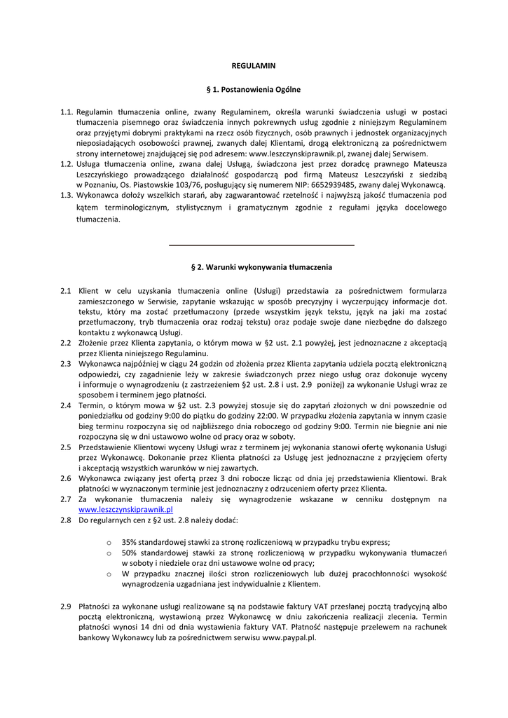 REGULAMIN § 1. Postanowienia Ogólne 1.1. Regulamin tłumaczenia online, zwany Regulaminem, określa warunki świadczenia usługi w postaci tłumaczenia pisemnego oraz świadczenia innych pokrewnych usług zgodnie z niniejszym Regulaminem oraz przyjętymi dobrymi praktykami na rzecz osób fizycznych, osób prawnych i jednostek organizacyjnych nieposiadających osobowości prawnej, zwanych dalej Klientami, drogą elektroniczną za pośrednictwem strony internetowej znajdującej się pod adresem: www.leszczynskiprawnik.pl, zwanej dalej Serwisem. 1.2. Usługa tłumaczenia online, zwana dalej Usługą, świadczona jest przez doradcę prawnego Mateusza Leszczyńskiego prowadzącego działalność gospodarczą pod firmą Mateusz Leszczyński z siedzibą w Poznaniu, Os. Piastowskie 103/76, posługujący się numerem NIP: 6652939485, zwany dalej Wykonawcą. 1.3. Wykonawca dołoży wszelkich starań, aby zagwarantować rzetelność i najwyższą jakość tłumaczenia pod kątem terminologicznym, stylistycznym i gramatycznym zgodnie z regułami języka docelowego tłumaczenia. § 2. Warunki wykonywania tłumaczenia 2.1 Klient w celu uzyskania tłumaczenia online (Usługi) przedstawia za pośrednictwem formularza zamieszczonego w Serwisie, zapytanie wskazując w sposób precyzyjny i wyczerpujący informacje dot. tekstu, który ma zostać przetłumaczony (przede wszystkim język tekstu, język na jaki ma zostać przetłumaczony, tryb tłumaczenia oraz rodzaj tekstu) oraz podaje swoje dane niezbędne do dalszego kontaktu z wykonawcą Usługi. 2.2 Złożenie przez Klienta zapytania, o którym mowa w §2 ust. 2.1 powyżej, jest jednoznaczne z akceptacją przez Klienta niniejszego Regulaminu. 2.3 Wykonawca najpóźniej w ciągu 24 godzin od złożenia przez Klienta zapytania udziela pocztą elektroniczną odpowiedzi, czy zagadnienie leży w zakresie świadczonych przez niego usług oraz dokonuje wyceny i informuje o wynagrodzeniu (z zastrzeżeniem §2 ust. 2.8 i ust. 2.9 poniżej) za wykonanie Usługi wraz ze sposobem i terminem jego płatności. 2.4 Termin, o którym mowa w §2 ust. 2.3 powyżej stosuje się do zapytań złożonych w dni powszednie od poniedziałku od godziny 9:00 do piątku do godziny 22:00. W przypadku złożenia zapytania w innym czasie bieg terminu rozpoczyna się od najbliższego dnia roboczego od godziny 9:00. Termin nie biegnie ani nie rozpoczyna się w dni ustawowo wolne od pracy oraz w soboty. 2.5 Przedstawienie Klientowi wyceny Usługi wraz z terminem jej wykonania stanowi ofertę wykonania Usługi przez Wykonawcę. Dokonanie przez Klienta płatności za Usługę jest jednoznaczne z przyjęciem oferty i akceptacją wszystkich warunków w niej zawartych. 2.6 Wykonawca związany jest ofertą przez 3 dni robocze licząc od dnia jej przedstawienia Klientowi. Brak płatności w wyznaczonym terminie jest jednoznaczny z odrzuceniem oferty przez Klienta. 2.7 Za wykonanie tłumaczenia należy się wynagrodzenie wskazane w cenniku dostępnym na www.leszczynskiprawnik.pl 2.8 Do regularnych cen z §2 ust. 2.8 należy dodać: o o o 35% standardowej stawki za stronę rozliczeniową w przypadku trybu express; 50% standardowej stawki za stronę rozliczeniową w przypadku wykonywania tłumaczeń w soboty i niedziele oraz dni ustawowe wolne od pracy; W przypadku znacznej ilości stron rozliczeniowych lub dużej pracochłonności wysokość wynagrodzenia uzgadniana jest indywidualnie z Klientem. 2.9 Płatności za wykonane usługi realizowane są na podstawie faktury VAT przesłanej pocztą tradycyjną albo pocztą elektroniczną, wystawioną przez Wykonawcę w dniu zakończenia realizacji zlecenia. Termin płatności wynosi 14 dni od dnia wystawienia faktury VAT. Płatność następuje przelewem na rachunek bankowy Wykonawcy lub za pośrednictwem serwisu www.paypal.pl. 2.10 W przypadku przekroczenia terminu płatności, Wykonawca zastrzega sobie prawo do naliczania odsetek umownych w wysokości 0,5% wartości zlecenia za każdy dzień zwłoki. 2.11 W przypadku dużych zleceń Wykonawca zastrzega sobie prawo do pobrania zaliczki na poczet wykonania zlecenia przed przystąpieniem do jego realizacji. Wysokość i sposób zapłaty zaliczki zostanie podany przez Wykonawcę drogą elektroniczną na adres mailowy Klienta. Pojęcie „duże zlecenie” jest definiowane przez Wykonawcę. 2.12 Dłuższy termin płatności lub wystawianie miesięcznych faktur VAT wymaga indywidualnych uzgodnień. 2.13 Wykonawca w każdym czasie ma prawo do zadawania Klientowi pytań odnośnie przedstawionego zagadnienia i w razie konieczności wezwania go do uzupełnienia niezbędnych danych lub dokumentów. 2.14 Przyjęcie oferty przez Klienta skutkuje zawarciem umowy pomiędzy Wykonawcą, a Klientem, przedmiotem której jest wykonanie Usługi. Strona obliczeniowa tłumaczenia zwykłego oraz tłumaczenia specjalistycznego to 1800 znaków komputerowych ze spacjami. Za znak uważa się wszystkie widoczne znaki drukarskie (litery, znaki przestankowe, cyfry, znaki przeniesienia itp.) oraz uzasadnione budową zdań przerwy między nimi. 2.15 O ile nie ustalono inaczej, długość tłumaczonego tekstu liczona jest z dokładnością do pół strony, zaokrąglając w górę. 2.16 Usługa udzielana jest w formie załącznika do poczty elektronicznej, skierowanej na adres email wskazany przez Klienta. Usługa realizowana jest w trybie zwykłym do 3 dni roboczych, jednakże nie więcej niż 10 stron rozliczeniowych albo w trybie express do 1 dnia roboczego, jednakże nie więcej niż 5 stron rozliczeniowych, liczone od dnia zawarcia umowy przez Wykonawcę z Klientem, z zastrzeżeniem postanowień §2 ust. 2.12 w tym wypadku termin liczony jest od dnia zaksięgowania zaliczki na rachunku bankowym lub otrzymania potwierdzenia o dokonaniu przez Klienta wpłaty za pośrednictwem systemu www.paypal.pl 2.17 W razie szczególnej zawiłości sprawy lub konieczności uzupełnienia przez Klienta opisu zagadnienia możliwe jest wydłużenie