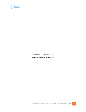 INSTRUKCJA MONTAŻU TABLIC EMALIOWANYCH Instrukcja montażu tablic emaliowanych I 28.1 1/3 1. Ogólne wytyczne dotyczące montażu Tablice emaliowane należy przewozić zawinięte folią typu „strecz” pakowane maksymalnie po 6 szt. W celu uniknięcia ewentualnego uszkodzenia tablic, zaleca się przewożenie spakowanych znaków pojazdem wyposażonym w plandekę, w pozycji pionowej w sposób uniemożliwiający ich samowolne przemieszczanie się po pojeździe. Czytelność tablic należy utrzymać poprzez okresowe przecieranie lica miękką szmatką (niedopuszczalne jest stosowanie jakichkolwiek rozpuszczalników i środków żrących). Warunkiem uznania gwarancji na tablice emaliowane jest właściwy (zgodny z niniejszą instrukcją) jego montaż na odpowiednio dobranej konstrukcji wsporczej i prawidłowe jego ustawienie na pasie drogowym. 2. Montaż Rys. 1. Rysunek montażowy tablic emaliowanych Fundament Słupek stalowy ocynkowany musi być zamocowany do fundamentu. Fundamenty wykonać zgodnie z obowiązującymi przepisami oraz normami. Producent zaleca wykonanie fundamentu o wymiarach 20 cm x 20 cm x 70 cm, ale wymiary uzależnione są od rodzaju podłoża. Instrukcja montażu tablic emaliowanych I 28.1 2/3 Rys. 2. Wymiary fundamentu Mocowanie elementów Konstrukcję należy montować zgodnie z przepisami BHP i Ppoż. Montaż konstrukcji należy wykonać po osiągnięciu przez fundament żelbetowy 80% wytrzymałości końcowej na ściskanie. Do zamontowania tablicy emaliowanej na słupku służy specjalny stelaż z pół obejmą, do którego przykręcana jest tablica. Następnie stelaż zostaje przykręcona przy pomocy drugiej pół obejmy do słupka. Rys. 3. Tablica emaliowana wraz ze stelażem Procedura mocowania tablicy na słupku przebiega następująco: - wykopać dół pod fundament, - słupek ustawić w osi otworu, - ustawić pion słupka i zalać betonem B20, - nałożyć ramkę na słupek wraz z drugą pół obejmą i ustawić odpowiednią wysokość, - przykręcić tablicę do stelaża. 3. Ochrona przed korozją Wymagane jest, aby: - fundamenty betonowe zabezpieczyć przed działaniem agresywnym wód przez dwukrotne pokrycie ich abizolem na zimno. Wszystkie łączniki metalowe przewidywane do mocowania miedzy sobą elementów konstrukcji wsporczej i znaku jak śruby, nakrętki itp. powinny być czyste, gładkie, bez pęknięć, naderwań, rozwarstwień i wypukłych karbów. Łączniki powinny być ocynkowane ogniowo lub wykonane z materiałów odpornych na korozje w czasie nie krótszym niż konstrukcja wsporcza. Instrukcja montażu tablic emaliowanych I 28.1 3/3