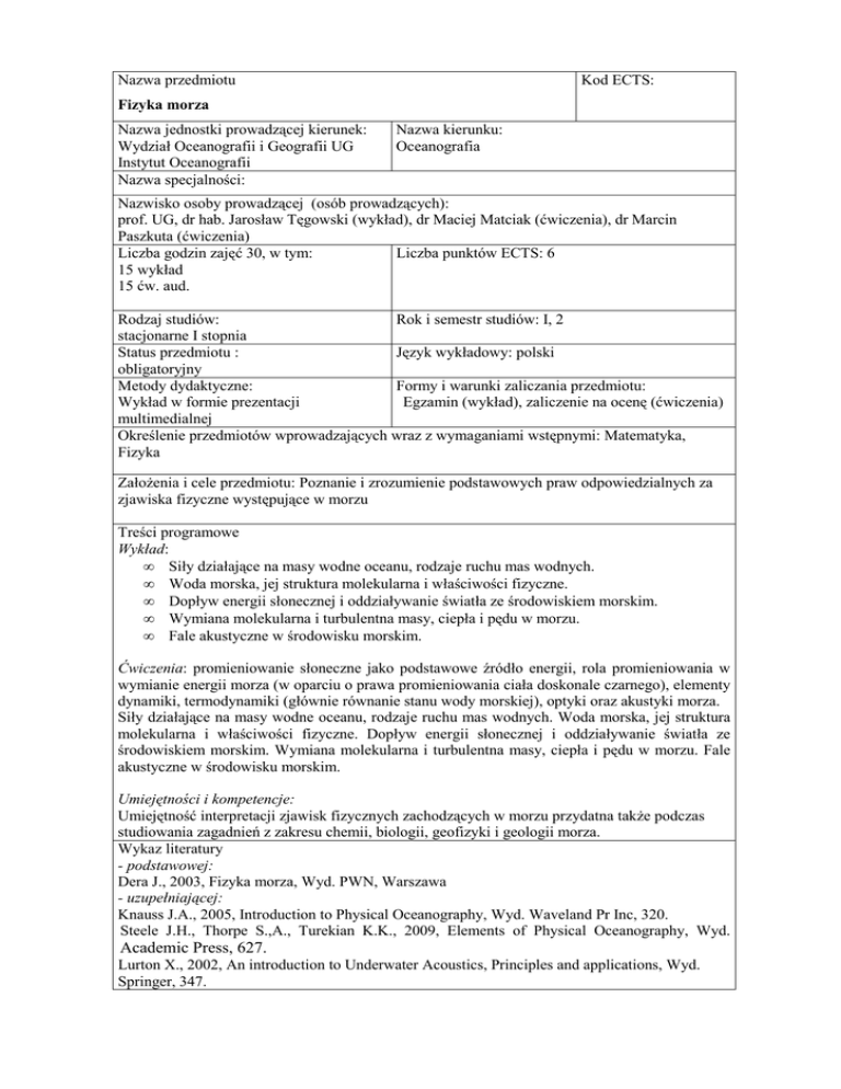 Nazwa przedmiotu Kod ECTS: Fizyka morza Nazwa jednostki prowadzącej kierunek: Wydział Oceanografii i Geografii UG Instytut Oceanografii Nazwa specjalności: Nazwa kierunku: Oceanografia Nazwisko osoby prowadzącej (osób prowadzących): prof. UG, dr hab. Jarosław Tęgowski (wykład), dr Maciej Matciak (ćwiczenia), dr Marcin Paszkuta (ćwiczenia) Liczba godzin zajęć 30, w tym: Liczba punktów ECTS: 6 15 wykład 15 ćw. aud. Rodzaj studiów: Rok i semestr studiów: I, 2 stacjonarne I stopnia Status przedmiotu : Język wykładowy: polski obligatoryjny Metody dydaktyczne: Formy i warunki zaliczania przedmiotu: Wykład w formie prezentacji Egzamin (wykład), zaliczenie na ocenę (ćwiczenia) multimedialnej Określenie przedmiotów wprowadzających wraz z wymaganiami wstępnymi: Matematyka, Fizyka ZałoŜenia i cele przedmiotu: Poznanie i zrozumienie podstawowych praw odpowiedzialnych za zjawiska fizyczne występujące w morzu Treści programowe Wykład: • Siły działające na masy wodne oceanu, rodzaje ruchu mas wodnych. • Woda morska, jej struktura molekularna i właściwości fizyczne. • Dopływ energii słonecznej i oddziaływanie światła ze środowiskiem morskim. • Wymiana molekularna i turbulentna masy, ciepła i pędu w morzu. • Fale akustyczne w środowisku morskim. Ćwiczenia: promieniowanie słoneczne jako podstawowe źródło energii, rola promieniowania w wymianie energii morza (w oparciu o prawa promieniowania ciała doskonale czarnego), elementy dynamiki, termodynamiki (głównie równanie stanu wody morskiej), optyki oraz akustyki morza. Siły działające na masy wodne oceanu, rodzaje ruchu mas wodnych. Woda morska, jej struktura molekularna i właściwości fizyczne. Dopływ energii słonecznej i oddziaływanie światła ze środowiskiem morskim. Wymiana molekularna i turbulentna masy, ciepła i pędu w morzu. Fale akustyczne w środowisku morskim. Umiejętności i kompetencje: Umiejętność interpretacji zjawisk fizycznych zachodzących w morzu przydatna takŜe podczas studiowania zagadnień z zakresu chemii, biologii, geofizyki i geologii morza. Wykaz literatury - podstawowej: Dera J., 2003, Fizyka morza, Wyd. PWN, Warszawa - uzupełniającej: Knauss J.A., 2005, Introduction to Physical Oceanography, Wyd. Waveland Pr Inc, 320. Steele J.H., Thorpe S.,A., Turekian K.K., 2009, Elements of Physical Oceanography, Wyd. Academic Press, 627. Lurton X., 2002, An introduction to Underwater Acoustics, Principles and applications, Wyd. Springer, 347.