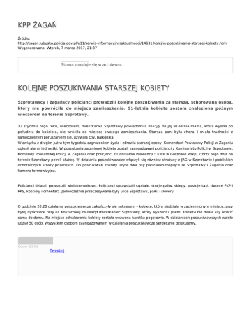 KPP ŻAGAŃ Źródło: http://zagan.lubuska.policja.gov.pl/g11/serwis-informacyjny/aktualnosci/14631,Kolejne-poszukiwania-starszej-kobiety.html Wygenerowano: Wtorek, 7 marca 2017, 21:37 Strona znajduje się w archiwum. KOLEJNE POSZUKIWANIA STARSZEJ KOBIETY Szprotawscy i żagańscy policjanci prowadzili kolejne poszukiwania za starszą, schorowaną osobą, który nie powróciła do miejsca zamieszkania. 91-letnia kobieta została znaleziona późnym wieczorem na terenie Szprotawy. 13 stycznia tego roku, wieczorem, mieszkanka Szprotawy powiadomiła Policję, że jej 91-letnia mama, która wyszła po południu do kościoła, nie wróciła do miejsca swojego zamieszkania. Starsza pani była chora, i miała trudności z samodzielnym poruszaniem się, używała tzw. balkonika. W związku z drugim już w tym tygodniu zagrożeniem życia i zdrowia starszej osoby, Komendant Powiatowy Policji w Żaganiu ogłosił alarm jednostki. W poszukania zaginionej kobiety zostali zaangażowani policjanci z Komisariatu Policji w Szprotawie, Komendy Powiatowej Policji w Żaganiu oraz policjanci z Oddziałów Prewencji z KWP w Gorzowie Wlkp, którzy tego dnia na terenie Szprotawy pełnili służbę. W działania poszukiwawcze włączyli się również strażacy z JRG w Szprotawie i pobliskich ochotniczych straży pożarnych. Do poszukiwań zostały użyte dwa psy patrolowo-tropiące ze Szprotawy i Żagania oraz kamera termowizyjna. Policjanci działali prowadzili wielokierunkowo. Policjanci sprawdzali szpitale, stacje paliw, sklepy, postoje taxi, dworce PKP i PKS, kościoły i cmentarz. Jednocześnie przeczesywane były ulice Szprotawy, parki i skwery. O godzinie 20.20 działania poszukiwawcze zakończyły się sukcesem – kobietę, która siedziała w zaciemnionym miejscu, przy byłej dyskotece przy ul. Koszarowej zauważył mieszkaniec Szprotawy, który wyszedł z psem. Kobieta nie miała siły wrócić sama do domu. Na miejsce odnalezienia kobiety została wezwana karetka pogotowia. W działaniach poszukiwawczych wzięło udział 50 osób. Wszystkim osobom zaangażowanym w działania poszukiwawcze serdecznie dziękujemy. Ocena: 0/5 (0) Tweetnij
