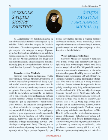 16 Orędzie Miłosierdzia 77 W SZKOLE ŚWIĘTEJ SIOSTRY FAUSTYNY ŚWIĘTA FAUSTYNA I ARCHANIOŁ MICHAŁ (1) W „Dzienniczku” św. Faustyny znajduje się ponad dwadzieścia tekstów odnoszących się do aniołów. Pośród nich dwa dotyczą św. Michała Archanioła. Oba teksty zapisane zostały w drugim zeszycie i oba zasługują na uwagę. W pierwszym, bardzo krótkim, składającym się zaledwie z jednego zdania, św. Faustyna wyznaje, kim dla niej jest św. Michał Archanioł. Na drugi tekst składa się kilka zdań, a najważniejsze z nich ukazuje rolę, jaką ma do spełnienia św. Michał Archanioł wobec Apostołki Bożego Miłosierdzia. Powody czci św. Michała Pierwszy tekst brzmi następująco: Wielką cześć mam dla świętego Michała Archanioła, on nie miał przykładu w pełnieniu woli Bożej, a jednak spełnił wiernie życzenia Boże (Dz. 667). To krótkie i szczere wyznanie natychmiast podsuwa pytanie: dlaczego św. Faustyna ma tak wielką cześć do św. Michała Archanioła i co takiego jest w nim, że na tę cześć zasługuje, że odbiera jako mu należną? Od razu trzeba podkreślić, że nie jest to – jak się często mówi – walor osobisty św. Michała. To znaczy nie dostojeństwo natury, doskonałość ducha czystego, nie jego piękno, wspaniałość, inteligencja. Nic z tych przymiotów, w jakie wyposażona została jego anielska natura. Święta Faustyna jest pełna podziwu, uznania, zachwytu i czci dla św. Michała Archanioła z jednego zasadniczego powodu – pełnienia przez niego woli Bożej. Dla niej jest on aniołem zachwytu i pokory. Jest aniołem, który wpatruje się w Boga, poznaje Jego wolę i po- kornie ją wypełnia. Spełnia ją wiernie pomimo osobistych trudności, braku przykładu, a nawet zupełnie odmiennych zachowań innych aniołów, przede wszystkim zaś najważniejszego z nich, Lucyfera – Anioła Światła. Wzór pełnienia woli Bożej Skoro św. Michał jest wzorem w pełnieniu woli Bożej, wobec tego zastanawiamy się, co było wolą Bożą wobec niego, co było wolą Bożą wobec wszystkich aniołów? Odpowiedź znajdujemy w poznaniu celu stworzenia, w uświadomieniu sobie, po co Pan Bóg stworzył aniołów? Opracowując zagadnienie „O woli Bożej” św. Tomasz z Akwinu w „Sumie Teologicznej” stwierdza: Wola ma to do siebie, że w miarę możności dzieli się z innymi dobrem, które posiada. Szczególniej to cechuje wolę Bożą, od której pochodzi wszelka doskonałość (…) Tak więc Bóg chce i swego istnienia i innych rzeczy. Siebie chce jako celu, a wszystko inne jest przedmiotem Jego woli w odniesieniu do tego celu, by dać im udział w Jego dobroci (ST I z. 19, a.2). Wolą Boga wobec aniołów jest dać im udział w swojej dobroci, w swoim szczęściu, w swojej chwale. Zanim to nastąpiło, wszyscy aniołowie zostali poddani próbie. Była to próba umysłu i woli, doskonałego poznania istoty rzeczy i definitywnego wyboru jednym aktem swej woli. Święty Tomasz uważa, że Aniołowie nie posiadali od pierwszej chwili swego istnienia tej ostatecznej szczęśliwości, która przekracza zdolności natury (ST I, z. 62, a. 1). Również ogólną nauką teologów jest twierdze- www.faustyna.pl styczeń, luty, marzec 2011 17 nie, że w początkowym stadium istnieli aniołowie w jakiejś doczesności, został im dany czas i możliwość wyboru celu: oglądanie bezpośrednie Boga lub odrzucenie Go. Ci aniołowie, którzy wybrali Boga, zostali wyniesieni do stanu nadprzyrodzonego otrzymując szczególny rodzaj łaski uświęcającej. Ci zaś, którzy odeszli dobrowolnie od Boga i swego posłannictwa, popełnili nieodwracalnie grzech ciężki i stali się duchami złymi zwanymi szatanami lub diabłami. Jak rozpoznał wolę Boga św. Michał Archanioł? Czy otrzymał jakieś szczególne światło? Święty Tomasz z Akwinu stwierdza: Ponieważ obraz Boga jest wrażony w samą naturę anioła, dlatego Anioł poznając samego siebie, poprzez swoją istotę, jako pewną podobiznę Boga, poznaje samego Boga (ST I, z. 56, a. 3). Poznając siebie św. Michał Archanioł zrozumiał, że jest stworzeniem, że dobro w nim istniejące zawdzięcza Dobru najwyższemu – Bogu. Poznał, że stworzony został przez Boga, że On jest jego jedynym celem i w Nim jest jego ostateczne szczęście. Szczęście bowiem to dobro doskonałe istoty myślącej (ST I, z. 26, a. 1) . Nie sprzeciwił się woli Bożej, nie sprzeciwił się własnemu szczęściu. Całą swoją istotą przylgnął do Boga i wola jego została na zawsze utrwalona w dobru. Ileż roztropności i męstwa było w św. Michale Archaniele w chwili próby! Do momentu upadku Lucyfera św. Michał nie był pierwszym i najważniejszym wśród aniołów. Według św. Grzegorza ten anioł, który zgrzeszył, był najwyższy między pozostałymi. Dlaczego więc ten najważniejszy, najwyższy, pierwszy wśród pozostałych, Lucyfer, nie wypełnił woli Bożej, dlaczego – choć powinien – nie był przykładem pełnienia woli Bożej? Rozważając grzech aniołów Doktor Anielski napisał, że te tylko grzechy szatan może popełniać, w których natura ducha może mieć upodobanie. Skoro szatan jest duchem, nie może mieć upodobania w dobrach materialnych, ale w dobrach duchowych. Może mieć upodobanie w dobru najwyższym i najdoskonalszym, jakim jest Bóg, lub w sobie jako istocie duchowej i dobrej w pierwszym momencie istnienia. Święty Tomasz stwierdza, że wola każdego stworzenia tylko wtedy zachowuje prawość w postępowaniu, gdy trzyma się prawideł woli Bożej, której przedmiotem jest cel ostateczny (ST I, z. 63, a. 1). Szatan „zamknął” swój umysł na Mądrość Bożą aktem przewrotnej woli i nie zachował tych prawideł, nie poddał się zwierzchnictwu Boga. Diabelskie „Nie będę służył!”. W konsekwencji nie zaakceptował i nie spełnił woli Bożej. On sam i część zbuntowanych jak on aniołów. Dlaczego, choć inni aniołowie poszli za namową