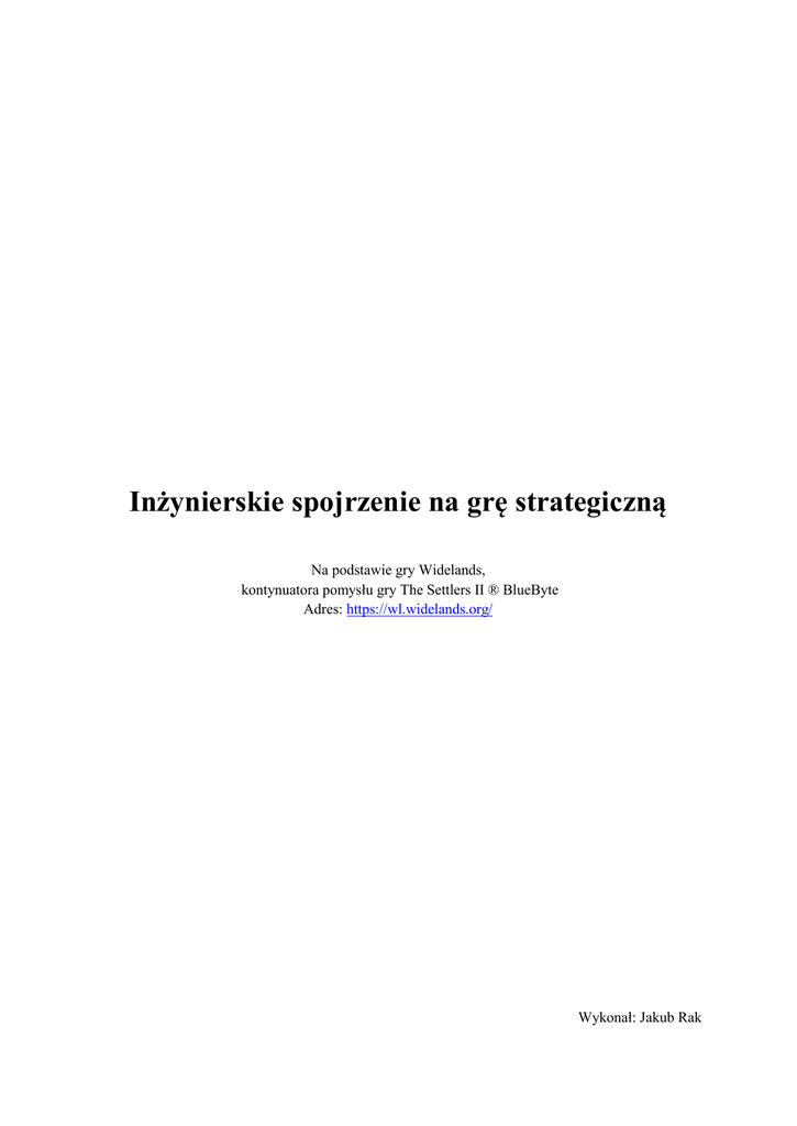 Inżynierskie spojrzenie na grę strategiczną Na podstawie gry Widelands, kontynuatora pomysłu gry The Settlers II ® BlueByte Adres: https://wl.widelands.org/ Wykonał: Jakub Rak 1. Słowo wstępne Istnieje wiele gier komputerowych, w których myślenie i podejmowanie decyzji ma wielką wagę. Zdecydowana większość z nich należy do grupy gier strategicznych. Zdecydowana większość gier opiera się w jakimś stopniu na rzeczywistości, umiejscawiając gracza w przeszłości (starożytność, średniowiecze, etc.) lub w przyszłości ludzkości. Jednak niewiele z tych gier odzwierciedla we właściwy sposób panujące warunki. Stopień skomplikowania otaczającego nas świata sprawia, że programiści spędziliby wiele lat opracowując symulację tylko fragmentu rzeczywistości. W grach to uproszczenie jest najbardziej widoczne we wszystkich procesach produkcyjnych. Większość z nich to bezpośrednia produkcja surowców potrzebnych do wytworzenia armii (rys. 1) lub tworzenie waluty, za którą „kupujemy” wojsko. Produkt 1: drewno Produkt 2: żywność Proces 1: Produkcja wojska Produkt 4: wojsko Produkt 3: złoto Rys. 1. Przykładowy proces produkcyjny wojska w grze Age Of Empires II. Surowce podstawowe można zdobyć bezpośrednio w grze, bez przetwarzania w żaden sposób wykorzystujemy je do produkcji wojska- produktu finalnego. W 1994 roku niemiecka firma Blue Byte wydała drugą z serii grę The Settlers. Gra była innowacyjna jak na owe czasy i wprowadzała gracza w świat oparty na starożytności. Gra ta była wyjątkowa ze względu na wprowadzenie skomplikowanych procesów produkcyjnych opartych na wielu produktach (w liczbie 31) i wielu procesach (19). Gra zyskała wielu zwolenników, którzy na początku lat 2000. postanowili powtórzyć sukces firmy tworząc grę typu open- source. Nowa gra o nazwie Widelands rozwijana jest do dzisiaj. Opiera się na podobnych prawach przetwórstwa, ale jest ona dużo bardziej rozwinięta. O ile w Settlers II produkty budowlane były tylko dwa (kamienie i deski), o tyle w Widelands dla jednego z plemienia Imperium (są 3 różne nacje) występuje aż 7 różnych produktów: belki, deski, kamienie, marmur, marmurowe kolumny, tkanina, złoto. W niniejszej pracy pragnę przedstawić kilka ze schematów produkcyjnych (nacji Imperium), tak, jak to było wykonane na ćwiczeniach oraz opisać strategię, która stoi w sprzeczności z panującymi w rzeczywistości prawami i wskazać, dlaczego ta strategia ma przewagę nad innymi i w jakich warunkach ona ma sens istnienia. Warto zaznaczyć na początku, że każdy produkt może być zmagazynowany w magazynie, porcie lub w kwaterze głównej. Dwa pierwsze budynki mogą być budowane w różnych miejscach i różnych ilościach. 2. Schematy produkcyjne. a) Żywność Najbardziej popularnym produktem żywnościowym jest chleb. Produkowany jest on z wody oraz mąki, a mąka jest wytwarzana z pszenicy: Produkt 1: Pszenica (Farma) Proces 1: Mielenie, mąka (Młyn) Proces 2: Pieczenie, chleb (Piekarnia) Produkt 4: chleb Produkt 2: Woda (Studnia) Rys. 2. Schemat produkcji chleba. W nawiasach wyszczególniłem nazwy budynków uczestniczących w produkcji. Schemat wydaje się prosty, ale mechanizmy gry utrudniają dobór parametrów produkcyjnych. Przykładowo farma produkuje jedną jednostkę pszenicy na około 2 minuty, a młyn przetwarza ją w około 15 sekund. Chleb jest pieczony w około pół minuty. Gracz musi więc wybudować wiele farm, niewiele młynów i średnią ilość piekarń, aby proces ten był efektywny w 100% na każdym z etapów. Pozostałe jednostki żywności (ryby, mięso) można zdobyć ze „środowiska naturalnego”. Dodatkowo mięso można wyprodukować: Produkt 1: Pszenica (Farma) Proces 1: Tworzenie, mięso (Chlew) Produkt 3: mięso Produkt 2: Woda (Studnia) Rys. 3. Schemat produkcji mięsa w chlewie. W porównaniu z grą Settlers II, schemat ten został uproszczony, gdyż został pominięty jeden półprodukt: świnie, które były przetwarzane na mięso w rzeźni. b) Produkty pochodne żywności Żywność jest surowcem aktywnym w wielu miejscach gry Widelands. Początkowo, w Settlers 2, była ona używana bezpośrednio w kopalniach do produkcji węgla, rudy żelaza, rudy złota lub kamienia. W Widelands żywność musi być przetworzona na rację żywnościową lub posiłek, aby była użyta w kopalni: Produkt 1: Chleb (Piekarnia) Proces 1: Przetwarzanie (Karczma) Produkt 3: Posiłek Produkt 2: Mięso lub Ryba (Chlew, dom rybaka) Produkt 2: Mięso lub Ryba lub Chleb Proces 1: Przetwarzanie (Tawerna lub Karczma) Produkt 2: Racja żywnościowa Rys. 4. Schematy produkcyjny procesów wytwarzania posiłków i racji żywnościowych. Racje używane są w podstawowych kopalniach, posiłki w rozbudowanych. c) Udział żywności w szkoleniu żołnierzy Oprócz części gospodarki związanej z wydobyciem surowców naturalnych z gór, żywność jest używana w dużych ilościach do trenowania żołnierzy. Ten aspekt jest chyba najważniejszym użyciem żywności: Produkt 1: Chleb (Piekarnia) Produkt 2: Mięso (Chlew) Produkt 3: Ryby (Dom rybaka) Proces 1-3: Trenowanie (Arena, Koloseum, Obóz treningowy) Produkt 5: Wyszkoleni żołnierz Produkt 4: Niewytrenowany żołnierz Rys. 5. Schemat treningu żołnierzy. Na schemacie nie ujęto broni oraz zbroi potrzebnych w obozie treningowym do poprawiania statystyk żołnierzy. W arenie oraz koloseum żołnierze poprawiają statystyki uników (większe szanse na uniknięcie obrażeń podczas bitwy). d) Zbroje oraz bronie Żołnierze muszą walczyć bronią. Zbroje dodają im punktów zdrowia. Każda broń jest tworzona z deski oraz (różnych ilości) węgla, sztabek złota i sztabek żelaza. Podobnie jest ze zbrojami, tyle, że zamiast desek używamy tkanin. Sztabki (wszystkie) są produkowane w hucie z ród metali oraz węgla. Schemat produkcyjny tej linii wygląda następująco: Produkt 1: Węgiel (Kopalnia węgla) Produkt 2: Ruda 