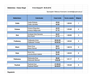 Małżeństwa - Olsztyn Biega! 10 km Edycja #1 08.05.2016 Sporządził: Mateusz Kownacki | [email protected] Małżeństwo: Cieśla Kulesza Woś Podlewscy Czas brutto Suma czasów Miejsce Cieśla Elżbieta Cieśla Jarosław 45:04 44:28 1:29:32 1 Kulesza Bogusław Kulesza Małgorzata 42:33 51:15 1:33:48 2 Hordejuk-Woś Damaris Woś Kamil 55:37 41:13 1:36:50 3 00:54:30 00:50:52 1:45:22 4 Podlewska Anna Podlewski Tomasz Wiech Wiech Ewa Wiech Roman 55:01 53:18 1:48:19 5 Bryła Bryła Artur Łowicka-Bryła Izabela 54:49 54:44 1:49:33 6 Rutkowska Ewa Rutkowski Mariusz 58:48 0:52:29 1:51:17 7 Paulinek Ewa Paulinek Robert 01:08:22 00:45:07 1:53:29 8 Rutkowscy Paulinek Regulamin: Członkowie: 1. Do klasyfikacji poszczególnego biegu liczy się suma czasów brutto obojga małżonków w tym konkretnym biegu. 2. Na tej podstawie ustala się wyniki małżeństw w danym biegu. Po zsumowaniu czasów ustala się kolejność par w klasyfikacji. I tak za pierwsze miejsce w danym biegu para otrzymuje 1 pkt., za drugie 2 pkt., itd. 3. Para która ma mniej pkt., zostaje sklasyfikowana na wyższym miejscu. 4. Żeby być sklasyfikowanym w danym biegu para musi razem w nim wystartować. 5. Do klasyfikacji generalnej liczą się najlepsze wyniki pary z trzech na cztery organizowane biegi. 6. Jeśli małżeństwa mają tyle samo punktów, to wyżej sklasyfikowane jest to małżeństwo, które w ostatnim z biegów, w którym razem startowały, zajęło wyższą pozycję od konkurentów. Małżeństwa - Klasyfikacja Generalna cyklu Olsztyn Biega! 2016 Małżeństwo Członkowie Sporządził: Mateusz Kownacki | [email protected] Miejsca drużyn 10 km 5 km Edycja 5 km Edycja 10 km Edycja Edycja #1 #2 #3 Suma wyników 08.05.2016 19.06.2016 03.07.2016 #4 28.08.2016 Miejsce Cieśla Elżbieta Cieśla Jarosław 1 1 1 Kulesza Bogusław Kulesza Małgorzata 2 2 2 Hordejuk-Woś Damaris Woś Kamil 3 3 3 Podlewska Anna Podlewski Tomasz 4 4 4 Wiech Wiech Ewa Wiech Roman 5 5 5 Bryła Bryła Artur Łowicka-Bryła Izabela 6 6 6 Rutkowska Ewa Rutkowski Mariusz 7 7 7 Paulinek Ewa Paulinek Robert 8 8 8 Cieśla Kulesza Woś Podlewscy Rutkowscy Paulinek Na sumę wyników składają się trzy najlepsze miejsca małżeństwa z poszczególnych edycji. W przypadku takiej samej sumy wyników wyżej klasyfikuje się małżeństwo szybsze w ostatnim biegu.