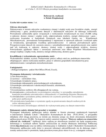 Zakład Lokali i Budynków Komunalnych w Olsztynie ul. Cicha 5, 10-313 Olsztyn poszukuje kandydatów na stanowisko Referent ds. rozliczeń w Dziale Eksploatacji Liczba lub wymiar etatu: 1 et. Główne obowiązki: Dokonywanie w terenie odczytów wodomierzy zimnej i ciepłej wody oraz liczników ciepła, energii elektrycznej i gazu, przekazywanie danych z dokonanych odczytów do dalszego rozliczenia. Prowadzenie całokształtu spraw związanych z rozliczaniem świadczonych na rzecz ZLiBK usług w zakresie: dostaw zimnej i ciepłej wody, odprowadzania ścieków, energii elektrycznej i gazu rozliczenia kwartalne w budynkach Gminnych oraz lokalach Gminy we Wspólnotach Mieszkaniowych, prowadzenie korespondencji z najemcami w sprawach naliczeń i rozliczeń opłat za świadczenia, sporządzanie wszelkiej sprawozdawczości w zakresie prowadzonych spraw. Przygotowywanie danych do zawarcia umowy z przedsiębiorstwami specjalistycznymi oraz nadzór nad ich realizacją w zakresie: dostawy zimnej wody i odprowadzania ścieków, dostawy Potwierdzanie zgodności faktur z zawartymi umowami oraz faktur Wspólnot Mieszkaniowych energii cieplnej i ciepłej wody, dostawy energii elektrycznej, dostawy gazu. | Kwalifikacje ( wykształcenie, uprawnienia, staż): Wykształcenie: średnie, wyższe. Preferowana: praca ( odbyty staż) na podobnym stanowisku obejmującym zakres rozliczania mediów, praca w sektorze gospodarki mieszkaniowej przy administrowaniu i zarządzaniu nieruchomościami. Umiejętności: - obsługa komputera - pakiet Ms-Office (Word, Excel), Wymagane dokumenty i oświadczenia: 1) list motywacyjny, 2) życiorys – curriculum vitae, 3) kserokopie świadectw pracy, 4) kserokopie dokumentów potwierdzających wykształcenie, 5) kserokopie zaświadczeń o ukończonych kursach, szkoleniach, 6) referencje, 7) kwestionariusz osobowy dla ubiegających się o pracę, 8) oświadczenie o niekaralności za przestępstwo umyślne ( w przypadku zatrudnienia kandydat przedkłada zaświadczenie o niekaralności z Centralnego Rejestru Skazanych). 9) oświadczenie o posiadaniu pełnej zdolności do czynności prawnych i korzystaniu z pełni praw publicznych 10) oświadczenie kandydata o wyrażenie zgody na przetwarzanie danych osobowych do celów rekrutacyjnych. 11) oświadczenie stwierdzające zdolność do wykonywania pracy na danym stanowisku Dokumenty należy składać lub przesłać w terminie: Wymagane dokumenty aplikacyjne należy składać w formie pisemnej zamkniętych kopertach w sekretariacie Zakładu Lokali i Budynków Komunalnych do dnia 29.02.2016r., w przypadku składania ofert drogą pocztową za termin jej złożenia uznaje się dzień otrzymania dokumentów aplikacyjnych przez ZLiBK. Na kopercie należy umieścić dopisek: ”Dotyczy naboru na stanowisko referent ds. rozliczeń.” Aplikacje, które wpłyną po określonym terminie nie będą rozpatrywane. Informacja o wynikach naboru będzie umieszczona na stronie Biuletynu Informacji Publicznej (www.bip.olsztyn.eu) oraz na tablicy informacyjnej w Zakładzie Lokali i Budynków Komunalnych. Dokumenty aplikacyjne osób, które w procesie rekrutacji zakwalifikowały się do dalszego etapu i zostały umieszczone w protokole, będą przechowywane przez okres 6 m-cy, a następnie zostaną komisyjnie zniszczone. Dokumenty aplikacyjne pozostałych ( z wyjątkiem osób, które zakwalifikowały się do dalszego etapu i zostały umieszczone w protokole) mogą być odbierane osobiście przez zainteresowanych w terminie 2 tygodni od daty ogłoszenia wyniku naboru. Po wyznaczonym terminie dokumenty aplikacyjne zostaną komisyjnie zniszczone. Inne informacje: Kandydaci zakwalifikowani zostaną powiadomieni telefonicznie. Olsztyn, 15.02.2016 Dyrektor Zbigniew Karpowicz
