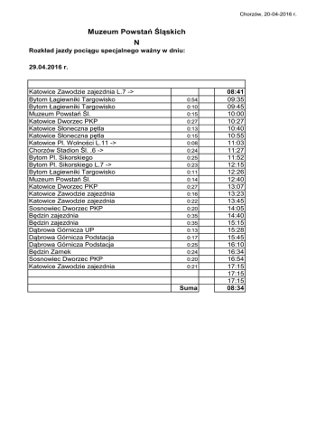 Chorzów, 20-04-2016 r. Muzeum Powstań Śląskich N Rozkład jazdy pociągu specjalnego ważny w dniu: 29.04.2016 r. Katowice Zawodzie zajezdnia L.7 -> Bytom Łagiewniki Targowisko Bytom Łagiewniki Targowisko Muzeum Powstań Śl. Katowice Dworzec PKP Katowice Słoneczna pętla Katowice Słoneczna pętla Katowice Pl. Wolności L.11 -> Chorzów Stadion Śl. .6 -> Bytom Pl. Sikorskiego Bytom Pl. Sikorskiego L.7 -> Bytom Łagiewniki Targowisko Muzeum Powstań Śl. Katowice Dworzec PKP Katowice Zawodzie zajezdnia Katowice Zawodzie zajezdnia Sosnowiec Dworzec PKP Będzin zajezdnia Będzin zajezdnia Dąbrowa Górnicza UP Dąbrowa Górnicza Podstacja Dąbrowa Górnicza Podstacja Będzin Zamek Sosnowiec Dworzec PKP Katowice Zawodzie zajezdnia 0:54 0:10 0:15 0:27 0:13 0:15 0:08 0:24 0:25 0:23 0:11 0:14 0:27 0:16 0:22 0:20 0:35 0:35 0:13 0:17 0:25 0:24 0:20 0:21 Suma 08:41 09:35 09:45 10:00 10:27 10:40 10:55 11:03 11:27 11:52 12:15 12:26 12:40 13:07 13:23 13:45 14:05 14:40 15:15 15:28 15:45 16:10 16:34 16:54 17:15 17:15 17:15 08:34 Chorzów, 20-04-2016 r. Muzeum Powstań Śląskich N Rozkład jazdy pociągu specjalnego ważny w dniu: 30.04.2016 r. Katowice Zawodzie zajezdnia Chorzów Batory zajezdnia L.7 -> Bytom Pl. Sikorskiego Bytom Pl. Sikorskiego L.5 -> Zabrze Pl. Wolności Zabrze Lompy pętla Zabrze Lompy pętla L.1 -> Ruda Śl. Chebzie pętla Ruda Śl. Chebzie pętla L.9 -> Chorzów Rynek Chorzów Rynek L.17 -> Ruda Śl. Chebzie pętla Ruda Śl. Chebzie pętla L.9 -> Bytom Pl. Sikorskiego Bytom Pl. Sikorskiego L.7 -> Katowice Rynek L.13 -> Siemianowice Pl. Skargi Siemianowice Pl. Skargi Katowice Pl. Wolności Katowice Zawodzie zajezdnia 0:30 0:35 0:15 0:38 0:11 0:16 0:14 0:06 0:41 0:27 0:42 0:10 0:27 0:10 0:54 0:29 0:05 0:21 0:15 Suma 10:00 10:30 11:05 11:20 11:58 12:09 12:25 12:39 12:45 13:26 13:53 14:35 14:45 15:12 15:22 16:16 16:45 16:50 17:11 17:26 17:26 17:26 17:26 07:26 Chorzów, 20-04-2016 r. Muzeum Powstań Śląskich N Rozkład jazdy pociągu specjalnego ważny w dniu: 01.05.2016 r. Katowice Zawodzie zajezdnia L.7 -> Bytom Łagiewniki Targowisko Bytom Pl. Sikorskiego Bytom Pl. Sikorskiego Bytom Łagiewniki Targowisko Muzeum Powstań Śl. Katowice Dworzec PKP L.11 -> Chorzów Stadion Śl. .6 -> Bytom Pl. Sikorskiego Bytom Pl. Sikorskiego L.7 -> Bytom Łagiewniki Targowisko Muzeum Powstań Śl. Katowice Dworzec PKP Katowice Zawodzie zajezdnia Katowice Zawodzie zajezdnia Sosnowiec Dworzec PKP Będzin zajezdnia Będzin zajezdnia Dąbrowa Górnicza UP Dąbrowa Górnicza Podstacja Dąbrowa Górnicza Podstacja Będzin Zamek Sosnowiec Dworzec PKP Katowice Zawodzie zajezdnia 0:54 0:11 0:05 0:11 0:15 0:27 0:21 0:25 0:15 0:11 0:14 0:27 0:16 0:22 0:20 0:35 0:22 0:13 0:17 0:10 0:24 0:20 0:21 Suma 10:00 10:54 11:05 11:10 11:21 11:36 12:03 12:24 12:49 13:04 13:15 13:29 13:56 14:12 14:34 14:54 15:29 15:51 16:04 16:21 16:31 16:55 17:15 17:36 17:36 17:36 07:36 Chorzów, 20-04-2016 r. Muzeum Powstań Śląskich N Rozkład jazdy pociągu specjalnego ważny w dniu: 02.05.2016 r. Katowice Zawodzie zajezdnia Chorzów Batory zajezdnia Bytom Pl. Sikorskiego Bytom Pl. Sikorskiego Zabrze Pl. Wolności Zabrze Lompy pętla Zabrze Lompy pętla L.1 -> Ruda Śl. Chebzie pętla Ruda Śl. Chebzie pętla L.9 -> Chorzów Rynek Chorzów Rynek L.17 -> Ruda Śl. Chebzie pętla Ruda Śl. Chebzie pętla L.9 -> Bytom Pl. Sikorskiego Bytom Pl. Sikorskiego L.7 -> Katowice Rynek L.13 -> Siemianowice Pl. Skargi Siemianowice Pl. Skargi Katowice Pl. Wolności Katowice Zawodzie zajezdnia 0:30 0:35 0:15 0:38 0:11 0:16 0:14 0:06 0:41 0:27 0:42 0:10 0:27 0:10 0:54 0:29 0:05 0:21 0:15 Suma 10:00 10:30 11:05 11:20 11:58 12:09 12:25 12:39 12:45 13:26 13:53 14:35 14:45 15:12 15:22 16:16 16:45 16:50 17:11 17:26 17:26 17:26 17:26 07:26