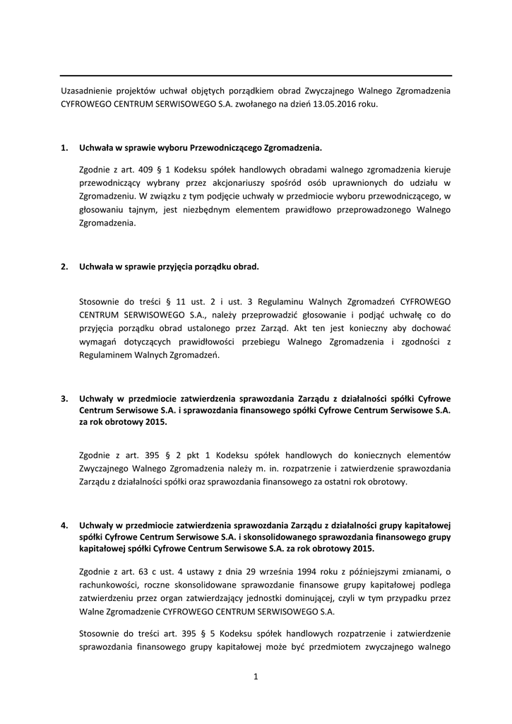 Uzasadnienie projektów uchwał objętych porządkiem obrad Zwyczajnego Walnego Zgromadzenia CYFROWEGO CENTRUM SERWISOWEGO S.A. zwołanego na dzień 13.05.2016 roku. 1. Uchwała w sprawie wyboru Przewodniczącego Zgromadzenia. Zgodnie z art. 409 § 1 Kodeksu spółek handlowych obradami walnego zgromadzenia kieruje przewodniczący wybrany przez akcjonariuszy spośród osób uprawnionych do udziału w Zgromadzeniu. W związku z tym podjęcie uchwały w przedmiocie wyboru przewodniczącego, w głosowaniu tajnym, jest niezbędnym elementem prawidłowo przeprowadzonego Walnego Zgromadzenia. 2. Uchwała w sprawie przyjęcia porządku obrad. Stosownie do treści § 11 ust. 2 i ust. 3 Regulaminu Walnych Zgromadzeń CYFROWEGO CENTRUM SERWISOWEGO S.A., należy przeprowadzić głosowanie i podjąć uchwałę co do przyjęcia porządku obrad ustalonego przez Zarząd. Akt ten jest konieczny aby dochować wymagań dotyczących prawidłowości przebiegu Walnego Zgromadzenia i zgodności z Regulaminem Walnych Zgromadzeń. 3. Uchwały w przedmiocie zatwierdzenia sprawozdania Zarządu z działalności spółki Cyfrowe Centrum Serwisowe S.A. i sprawozdania finansowego spółki Cyfrowe Centrum Serwisowe S.A. za rok obrotowy 2015. Zgodnie z art. 395 § 2 pkt 1 Kodeksu spółek handlowych do koniecznych elementów Zwyczajnego Walnego Zgromadzenia należy m. in. rozpatrzenie i zatwierdzenie sprawozdania Zarządu z działalności spółki oraz sprawozdania finansowego za ostatni rok obrotowy. 4. Uchwały w przedmiocie zatwierdzenia sprawozdania Zarządu z działalności grupy kapitałowej spółki Cyfrowe Centrum Serwisowe S.A. i skonsolidowanego sprawozdania finansowego grupy kapitałowej spółki Cyfrowe Centrum Serwisowe S.A. za rok obrotowy 2015. Zgodnie z art. 63 c ust. 4 ustawy z dnia 29 września 1994 roku z późniejszymi zmianami, o rachunkowości, roczne skonsolidowane sprawozdanie finansowe grupy kapitałowej podlega zatwierdzeniu przez organ zatwierdzający jednostki dominującej, czyli w tym przypadku przez Walne Zgromadzenie CYFROWEGO CENTRUM SERWISOWEGO S.A. Stosownie do treści art. 395 § 5 Kodeksu spółek handlowych rozpatrzenie i zatwierdzenie sprawozdania finansowego grupy kapitałowej może być przedmiotem zwyczajnego walnego 1 zgromadzenia. Zdaniem Zarządu pod obrady Walnego Zgromadzenia Spółki należy poddać także sprawozdanie Zarządu z działalności grupy kapitałowej w danym roku obrotowym. Wniosek ten należy wyprowadzić z treści art. 395 § 5 Kodeksu spółek handlowych. 5. Uchwała w przedmiocie zatwierdzenia sprawozdania Rady Nadzorczej z wyników oceny sprawozdań, o których mowa w punktach 3. i 4. powyżej oraz wniosków Zarządu dotyczących podziału zysku wypracowanego za rok obrotowy 2015, a także z własnej działalności Rady Nadzorczej w danym roku obrotowym. W ocenie Zarządu pod obrady Walnego Zgromadzenia należy poddać również sprawozdanie Rady Nadzorczej z wyników oceny sprawozdań o których mowa w punktach 3. i 4. powyżej oraz wniosków Zarządu dotyczących podziału zysku wypracowanego za dany rok obrotowy, a także sprawozdania z własnej działalności Rady Nadzorczej w danym roku obrotowym. Wnioski te należy wyprowadzić z treści art. 382 § 3 w zw. z art. 395 § 5 Kodeksu spółek handlowych. 6. Uchwała w przedmiocie podziału zysku spółki Cyfrowe Centrum Serwisowe S.A. za rok obrotowy 2015, ustalenia dnia dywidendy i terminu wypłaty dywidendy. Sprawozdanie finansowe spółki Cyfrowe Centrum Serwisowe S.A. za rok obrotowy 2015 wykazuje wypracowany w tymże roku obrotowym zysk netto kwocie 1.451.258,69 zł (jeden milion czterysta pięćdziesiąt jeden tysięcy dwieście pięćdziesiąt osiem złotych i sześćdziesiąt dziewięć groszy). Do imperium przysługującego Zwyczajnemu Walnemu Zgromadzeniu – zgodnie z treścią art. 395 § 2 pkt 2 Kodeksu spółek handlowych – należy dokonanie podziału zysku netto. Podziału zysku netto Walne Zgromadzenie dokonuje w drodze podjęcia stosownej uchwały. Zarząd proponuje przeznaczyć do podziału między akcjonariuszy część zysku netto wypracowanego przez spółkę w roku 2015, w kwocie 1.271.280 zł (jeden milion dwieście siedemdziesiąt jeden tysięcy dwieście osiemdziesiąt złotych), co oznacza 0,08 zł (osiem groszy) na akcję. Zdaniem Zarządu spółka posiada wystarczającą ilość środków finansowych, aby przeznaczyć na dywidendę wyżej wymienioną kwotę, bez uszczerbku dla działalności spółki i planowanego jej rozwoju. Pozostałą część zysku netto, w kwocie 179.978,69 zł (sto siedemdziesiąt dziewięć tysięcy dziewięćset siedemdziesiąt osiem złotych i sześćdziesiąt dziewięć groszy) Zarząd proponuje przeznaczyć na kapitał zapasowy spółki. Uchwała w sprawie podziału zysku winna określać także – zgodnie z treścią art. 348 § 3 Kodeksu spółek handlowych - dzień, według którego ustala się listę akcjonariuszy uprawnionych do dywidendy za dany rok obrotowy (tzw. dzień dywidendy) oraz termin wypłaty dywidendy. Biorąc pod uwagę obowiązujące przepisy prawa oraz regulacje Giełdy Papierów Wartościowych i 2 Krajowego Depozytu Papierów Wartościowych Zarząd proponuje, aby dzień dywidendy wyznaczyć na 8 czerwca 2016 roku, zaś termin wypłaty dywidendy na dzień 23 czerwca 2016 roku. 7. Uchwały w przedmiocie udzielenia Członkom Zarządu absolutorium z wykonania obowiązków w danym roku obrotowym. Z uwagi na materię zawartą w projekcie uchwały przygotowanym przez Zarząd (odnosi się ona bezpośrednio do relacji osobistej Członek Zarządu względem spółki oraz odpowiedzialności Zarządu), Zarząd ogranicza swe uzasadnienie w tym zakresie, do stwierdzenia, iż sprawa ta należy do wyłącznej kompetencji Zwyczajnego Walnego Zgromadzenia (art. 395 § 2 pkt 3 Kodeksu spółek handlowych), a wynik głosowania odzwierciedlać winien ocenę działalności Zarządu przez Walne Zgromadzenie. 8. Uchwały przedmiocie udzielenia Cz
