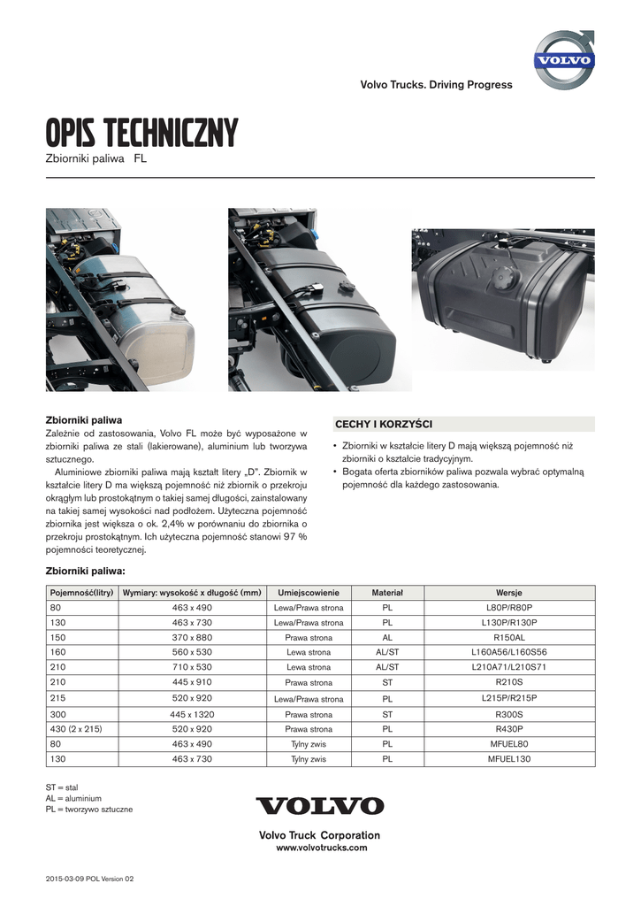 Volvo Trucks. Driving Progress Opis techniczny Zbiorniki paliwa FL Zbiorniki paliwa Zależnie od zastosowania, Volvo FL może być wyposażone w zbiorniki paliwa ze stali (lakierowane), aluminium lub tworzywa sztucznego. Aluminiowe zbiorniki paliwa mają kształt litery „D”. Zbiornik w kształcie litery D ma większą pojemność niż zbiornik o przekroju okrągłym lub prostokątnym o takiej samej długości, zainstalowany na takiej samej wysokości nad podłożem. Użyteczna pojemność zbiornika jest większa o ok. 2,4% w porównaniu do zbiornika o przekroju prostokątnym. Ich użyteczna pojemność stanowi 97 % pojemności teoretycznej. Cechy i korzyści • Zbiorniki w kształcie litery D mają większą pojemność niż zbiorniki o kształcie tradycyjnym. • Bogata oferta zbiorników paliwa pozwala wybrać optymalną pojemność dla każdego zastosowania. Zbiorniki paliwa: Pojemność(litry) Wymiary: wysokość x długość (mm) Umiejscowienie Materiał Wersje 463 x 490 Lewa/Prawa strona PL L80P/R80P 130 463 x 730 Lewa/Prawa strona PL L130P/R130P 150 370 x 880 Prawa strona AL R150AL 160 560 x 530 Lewa strona AL/ST L160A56/L160S56 210 710 x 530 Lewa strona AL/ST L210A71/L210S71 210 445 x 910 Prawa strona ST R210S 215 520 x 920 Lewa/Prawa strona PL L215P/R215P 300 445 x 1320 Prawa strona ST R300S 80 430 (2 x 215) 520 x 920 Prawa strona PL R430P 80 463 x 490 Tylny zwis PL MFUEL80 130 463 x 730 Tylny zwis PL MFUEL130 ST = stal AL = aluminium PL = tworzywo sztuczne 2015-03-09 POL Version 02