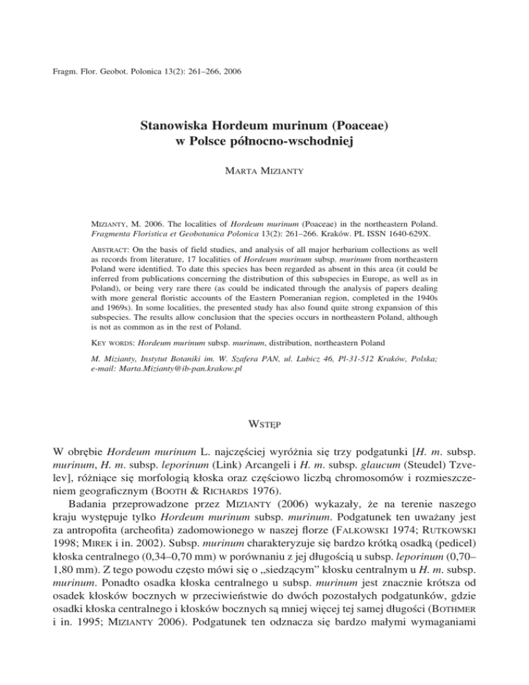 Fragm. Flor. Geobot. Polonica 13(2): 261–266, 2006 Stanowiska Hordeum murinum (Poaceae) w Polsce północno-wschodniej MARTA MIZIANTY MIZIANTY, M. 2006. The localities of Hordeum murinum (Poaceae) in the northeastern Poland. Fragmenta Floristica et Geobotanica Polonica 13(2): 261–266. Kraków. PL ISSN 1640-629X. ABSTRACT: On the basis of field studies, and analysis of all major herbarium collections as well as records from literature, 17 localities of Hordeum murinum subsp. murinum from northeastern Poland were identified. To date this species has been regarded as absent in this area (it could be inferred from publications concerning the distribution of this subspecies in Europe, as well as in Poland), or being very rare there (as could be indicated through the analysis of papers dealing with more general floristic accounts of the Eastern Pomeranian region, completed in the 1940s and 1969s). In some localities, the presented study has also found quite strong expansion of this subspecies. The results allow conclusion that the species occurs in northeastern Poland, although is not as common as in the rest of Poland. KEY WORDS: Hordeum murinum subsp. murinum, distribution, northeastern Poland M. Mizianty, Instytut Botaniki im. W. Szafera PAN, ul. Lubicz 46, Pl-31-512 Kraków, Polska; e-mail: [email protected] WSTĘP W obrębie Hordeum murinum L. najczęściej wyróżnia się trzy podgatunki [H. m. subsp. murinum, H. m. subsp. leporinum (Link) Arcangeli i H. m. subsp. glaucum (Steudel) Tzvelev], różniące się morfologią kłoska oraz częściowo liczbą chromosomów i rozmieszczeniem geograficznym (BOOTH & RICHARDS 1976). Badania przeprowadzone przez MIZIANTY (2006) wykazały, że na terenie naszego kraju występuje tylko Hordeum murinum subsp. murinum. Podgatunek ten uważany jest za antropofita (archeofita) zadomowionego w naszej florze (FALKOWSKI 1974; RUTKOWSKI 1998; MIREK i in. 2002). Subsp. murinum charakteryzuje się bardzo krótką osadką (pedicel) kłoska centralnego (0,34–0,70 mm) w porównaniu z jej długością u subsp. leporinum (0,70– 1,80 mm). Z tego powodu często mówi się o „siedzącym” kłosku centralnym u H. m. subsp. murinum. Ponadto osadka kłoska centralnego u subsp. murinum jest znacznie krótsza od osadek kłosków bocznych w przeciwieństwie do dwóch pozostałych podgatunków, gdzie osadki kłoska centralnego i kłosków bocznych są mniej więcej tej samej długości (BOTHMER i in. 1995; MIZIANTY 2006). Podgatunek ten odznacza się bardzo małymi wymaganiami 262 Fragm. Flor. Geobot. Polonica 13(2), 2006 Ryc. 1. Rozmieszczenie Hordeum murinum L. w Polsce, według ZAJĄCA i ZAJĄC (2001) Fig. 1. Distribution of Hordeum murinum L. in Poland after ZAJĄC and ZAJĄC (2001) siedliskowymi, rośnie na stanowiskach synantropijnych, pozbawionych naturalnej roślinności (rumowiska, nasypy, mury), dlatego uważany jest za gatunek pionierski. Należy do roślin, które zwiększają swe zasięgi głównie pod wpływem działalności człowieka. Z prac dotyczących ogólnego rozmieszczenia tego podgatunku w Europie (BOTHMER i in. 1995; JACOBSEN & BOTHMER 1995), jak i w Polsce (ZAJĄC & ZAJĄC 2001) wynika, że w północno-wschodniej Polsce Hordeum murinum subsp. murinum nie występuje (Ryc. 1). Jednak znalezienie kilku stanowisk tej rośliny w Polsce północno-wschodniej (MIZIANTY 2006), skłoniło autorkę do szczegółowych badań, dotyczących obecności H. m. subsp. murinum w tej części kraju. Tym bardziej, że na pozostałym obszarze Polski występuje on dość powszechnie. MATERIAŁ I METODY W latach 2004–2005 prowadzono szczegółowe badania terenowe, dotyczące lokalizacji stanowisk Hordeum murinum subsp. murinum, ze specjalnym uwzględnieniem Polski północno-wschodniej. Analizowano również wszystkie większe zbiory zielnikowe w Polsce (BIL, BSG, BYDG, GDMA, KRA, KRAM, KTU, LOD, OLS, OLSZ, POZ, SLTC, SZCZ, TRN, UGDA, WA, WRSL, WRSP – skróty nazw zielników wg MIREK i in. 1997) oraz studiowano literaturę florystyczną, odnoszącą się do Polski północno-wschodniej. Podczas badań terenowych oprócz lokalizacji nowych stanowisk, starano się również odszukać stanowiska podane w literaturze, lub odnotowane w zielnikach. M. Mizianty: Hordeum murinum w Polsce północno-wschodniej 263 WYNIKI W trakcie badań odnotowano wiele stanowisk H. murinum subsp. murinum w Polsce północno-wschodniej (Tab. 1, Ryc. 2). POLAKOWSKI (1963), dokonując ogólnej charakterystyki flory roślin Pomorza Wschodniego wymienia H. murinum, a wcześniej STEFFEN (1940) odnotowuje go z zachodniej części omawianego obszaru. Obydwaj autorzy nie podają jednak szczegółowych stanowisk. Tabela 1. Stanowiska Hordeum murinum subsp. murinum w Polsce północno-wschodniej Table 1. Localities of Hordeum murinum subsp. murinum in the northeastern Poland Nr (No.) Stanowisko (Locality) 126 Międzyrzec Podlaski k. Białej Podlaskiej (stacja benzynowa przy szosie w kierunku Warszawy). 05. 06. 2004, leg. M. Mizianty Augustów, okolice dworca autobusowego, ul. Żabia. 17. 06. 2004 oraz 03.06. 2005, leg. M. Mizianty Suwałki, stare garaże w okolicach dworca PKS. 17. 06. 2004 oraz 04.07.2005, leg. M. Mizianty Olsztyn, tereny PKP (między dworcem PKS a peronami). 18. 06.2004, leg. M. Mizianty Augustów, okolice ul. Wojska Polskiego 30, niedaleko skrzyżowania z ul. Żabią, koło słupów i latarni (jest to stanowisko niedaleko stanowiska nr127). 30. 06. 2005, leg. M. Mizianty Grajewo k. Ełku, k. Augustowa. Osiedle Centrum, blok nr 35 A. Przy południowej ścianie bloku, koło ogródków przy bloku. Masowo, również pojedyncze okazy obok sąsiednich bloków. 03.07.2005, leg. J. Mizianty Augustów, ul. Wojska Polskiego 48, stacja benzynowa Orlen i auto-komis (nieużytek). Obficie. Też pod kilkoma drzewami w pobliżu przy ulicy, ale nielicznie. 03.07.2005, leg. M. Mizianty Giżycko, ul. Armii Krajowej 1, trawnik koło PKO, dość często. 04.07.2005, leg. J. Mizianty Bielsk Podl